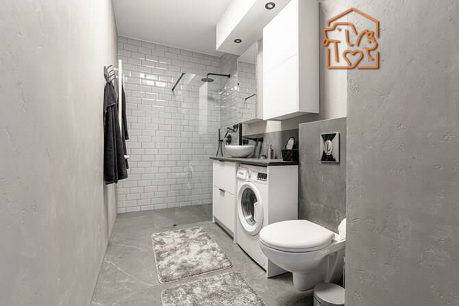 Łazienka z WC: pralka, kabina prysznicowa, umywalka, lustro, szafki.