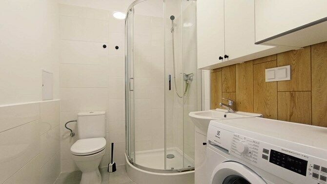 Łazienka: kabina prysznicowa, umywalka, pralka, WC.