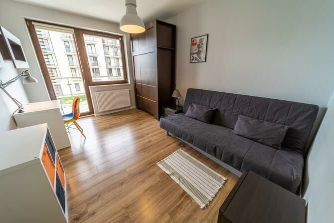 Sypialnia: dwuosobowe rozkładana kanapa, pojemna szafa, trzy szafki,
