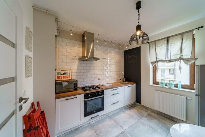 Kuchnia: dolne szafki kuchenne, kuchenka gazowa, okap, piecyk,