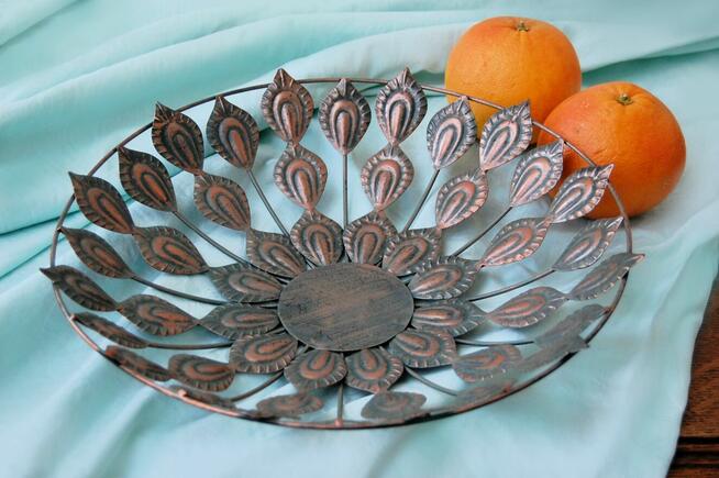 Duża, szwedzka patera w indyjskim stylu z pawimi piórami. Patera jest wykonana z metalu patynowanego od wewnętrznej strony ...
