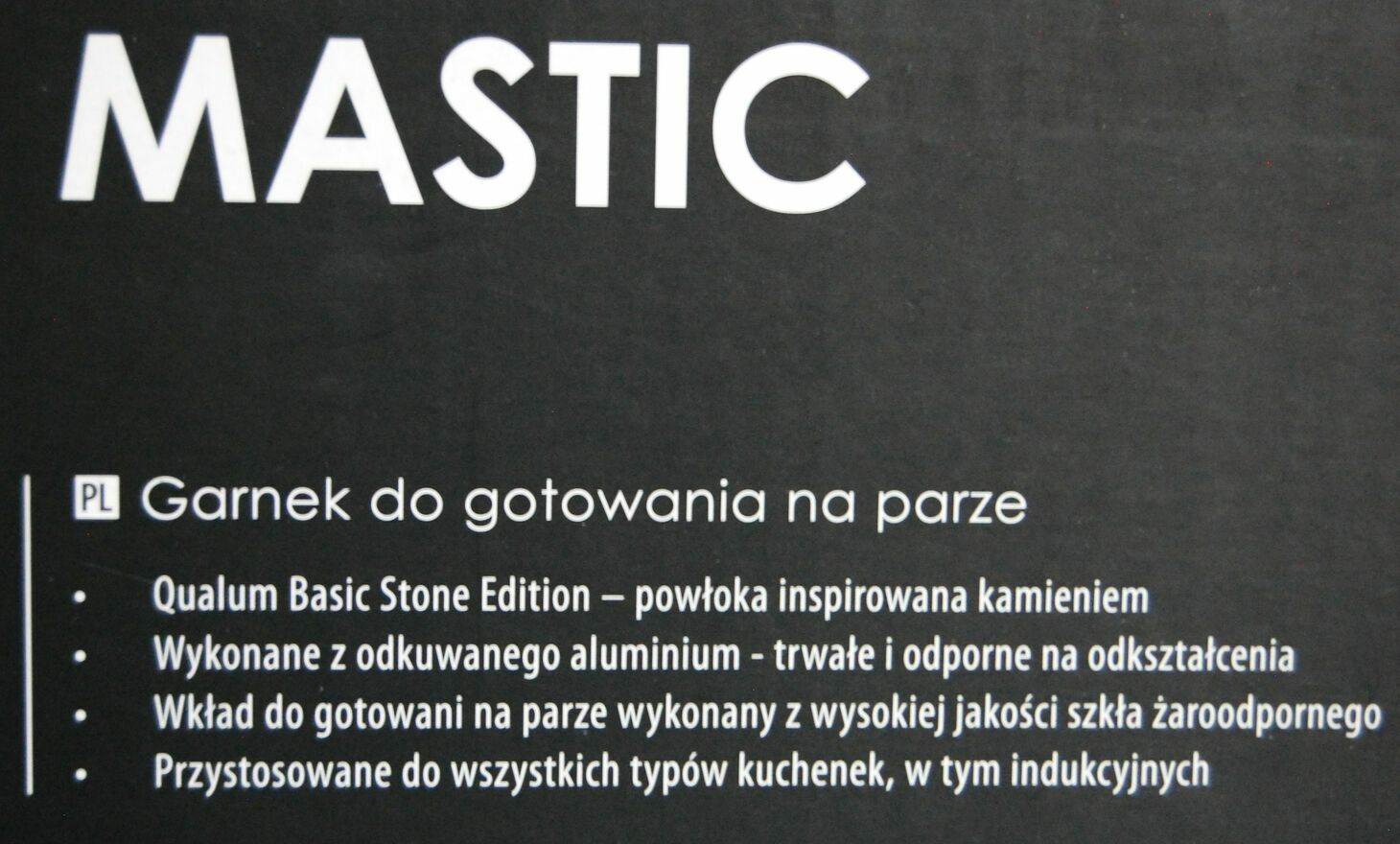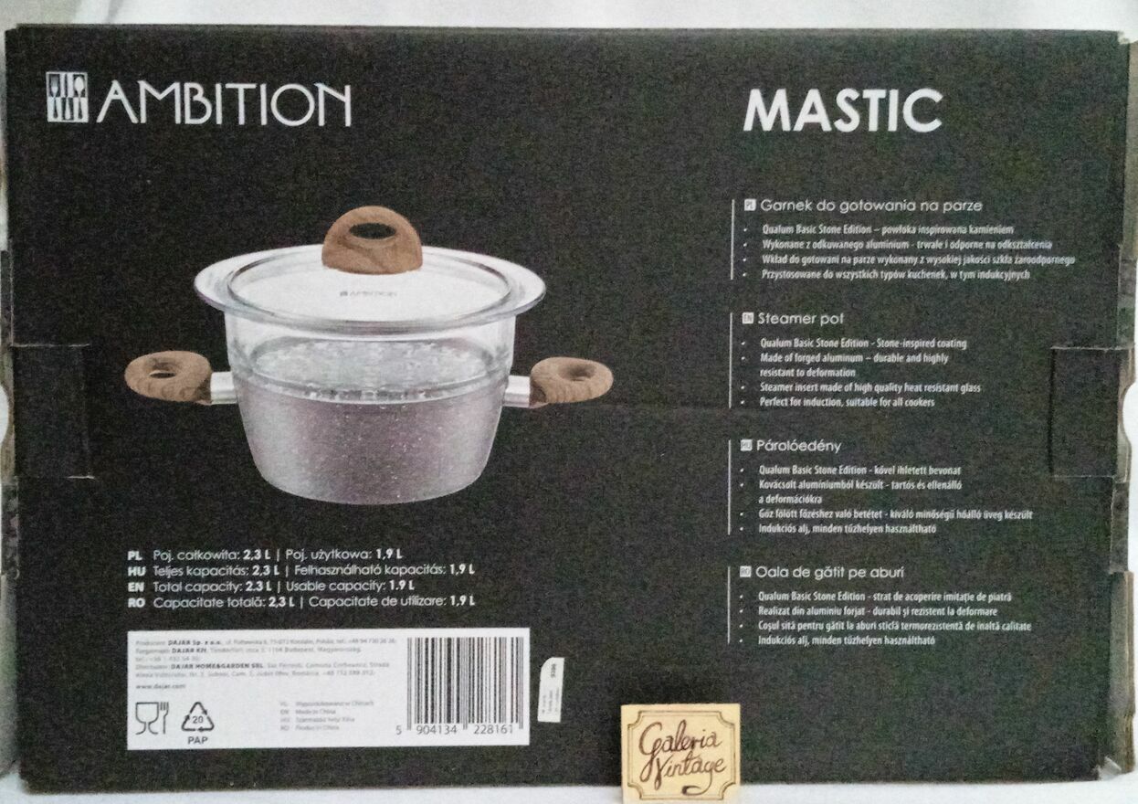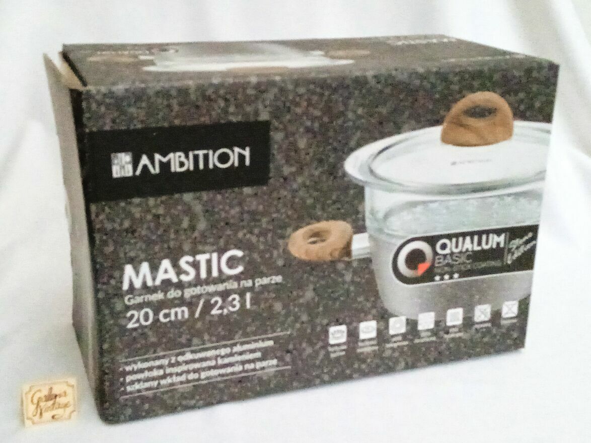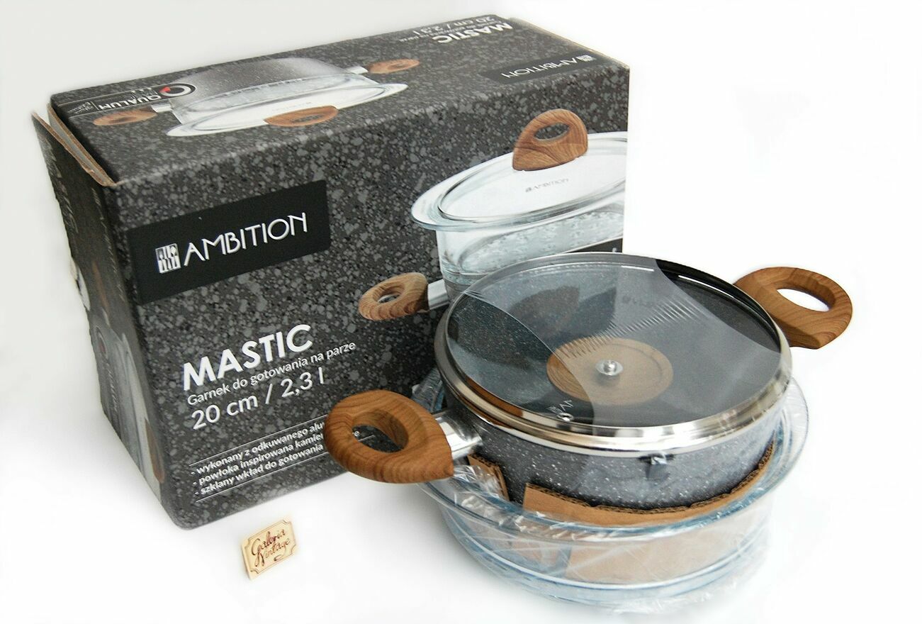 Garnek do gotowania na parze Mastic 20 cm AMBITION. Pojemność: 2,3 l. Garnek do gotowania na parze Mastic o średnicy 20 cm z pokrywką, wykonany został z aluminium. Korpus garnka swoim deseniem przypomina kamień, a rączki imitują drewno. Wykonany z odkuwanego aluminium, doskonale akumuluje ciepło, czyniąc gotowanie bardziej energooszczędnym. Posiada również grube, wielowarstwowe dno indukcyjne odporne na odkształcenia. Wnętrze rondla pokryte jest powłoką nieprzywierającą o unikalnym wyglądzie, przypominającym kamień. Rączki pokryte antypoślizgowym materiałem Soft Touch imitującym drewno, zapewniają pewne trzymanie w dłoni. Do garnka dołączone jest również sito z wysokiej jakości szkła żaroodpornego, które umożliwia gotowanie na parze. Jest to najzdrowszy sposób obróbki termicznej - witaminy i mikroelementy pozostają w gotowanych warzywach i mięsie.Garnki Mastic przystosowane są do wszystkich typów kuchenek, w tym indukcyjnych.