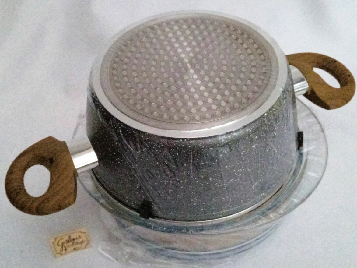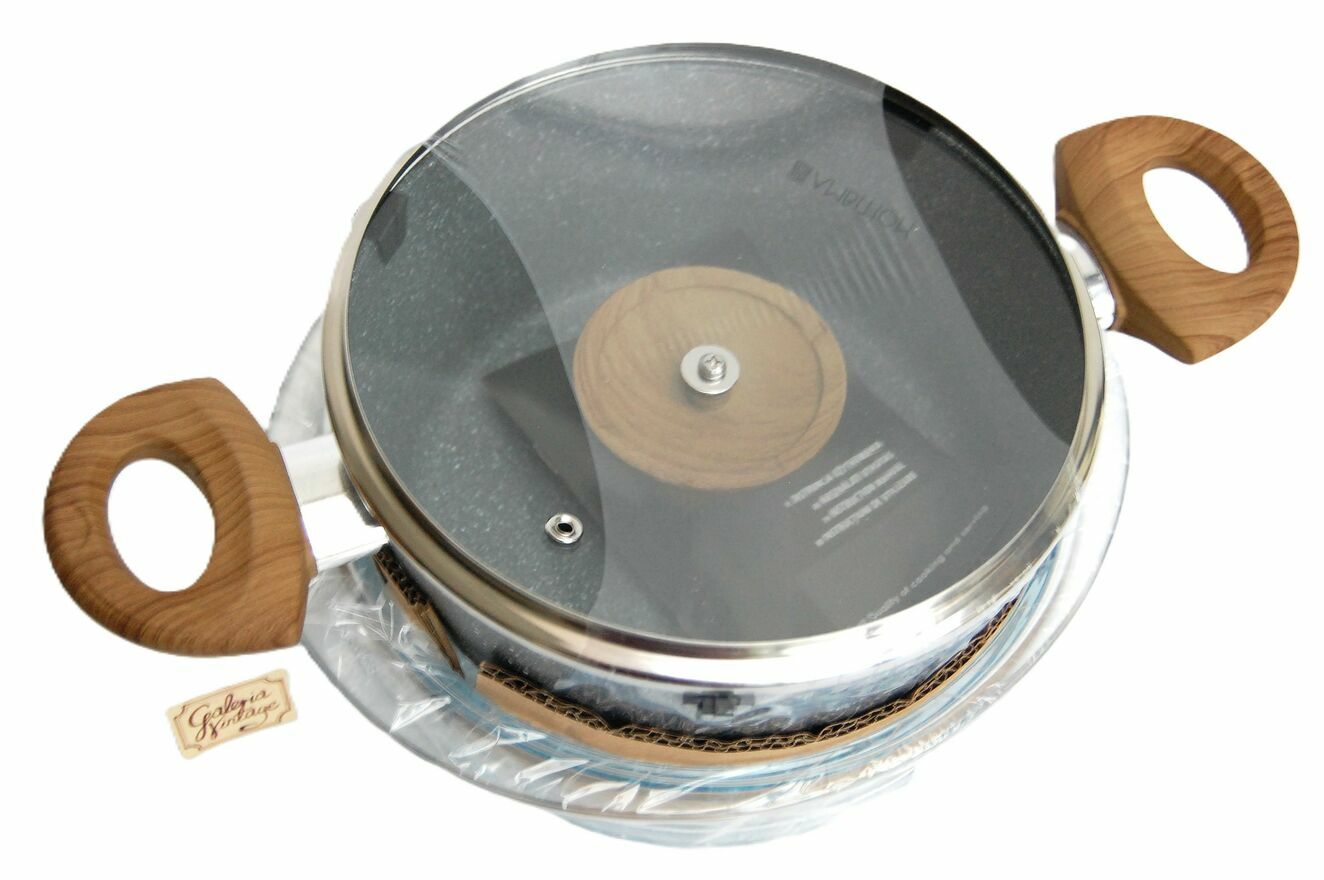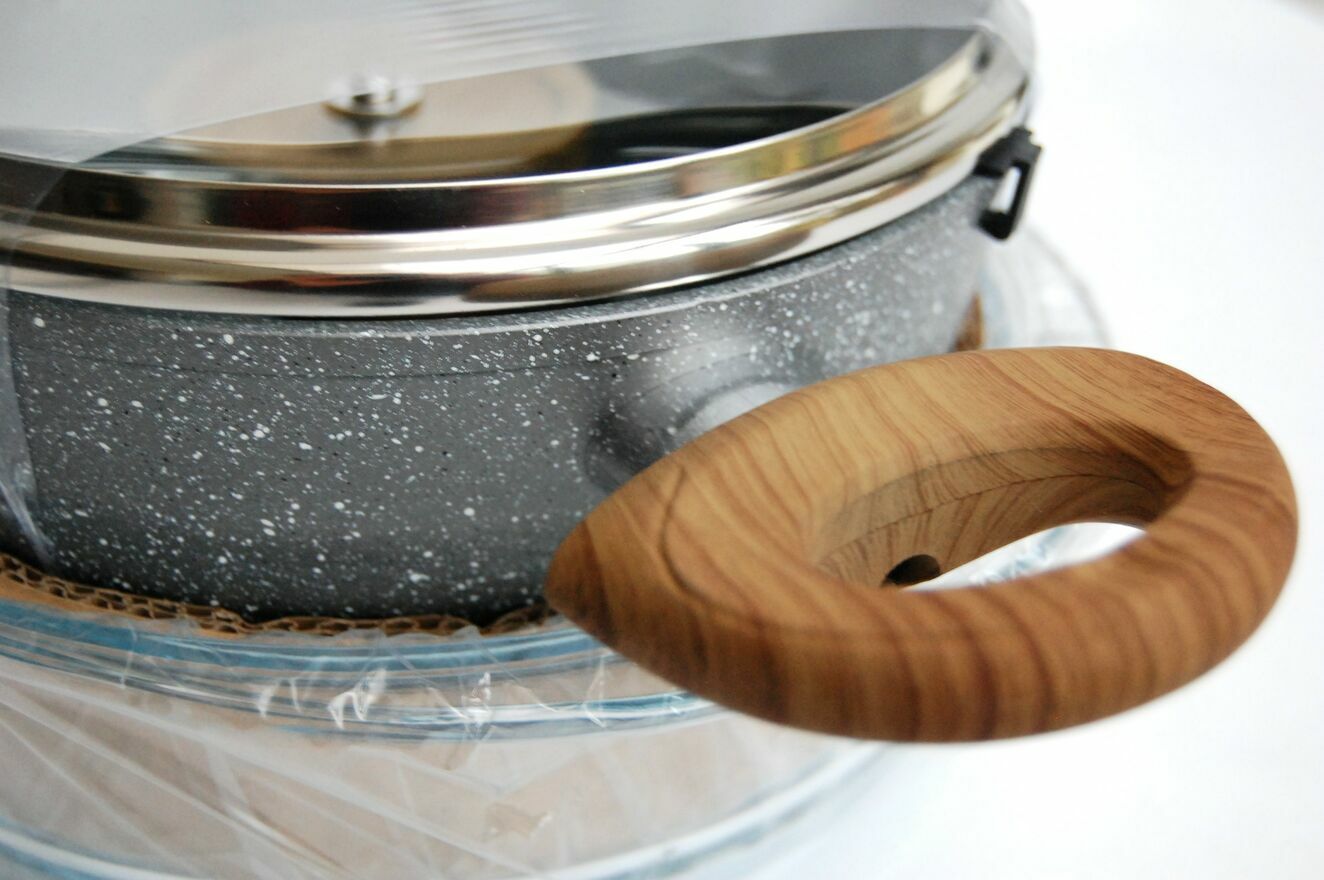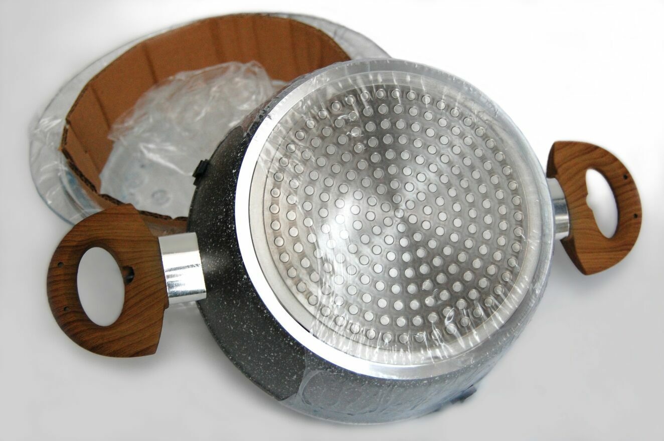 Garnek do gotowania na parze Mastic 20 cm AMBITION. Pojemność: 2,3 l. Garnek do gotowania na parze Mastic o średnicy 20 cm z pokrywką, wykonany został z aluminium. Korpus garnka swoim deseniem przypomina kamień, a rączki imitują drewno. Wykonany z odkuwanego aluminium, doskonale akumuluje ciepło, czyniąc gotowanie bardziej energooszczędnym. Posiada również grube, wielowarstwowe dno indukcyjne odporne na odkształcenia. Wnętrze rondla pokryte jest powłoką nieprzywierającą o unikalnym wyglądzie, przypominającym kamień. Rączki pokryte antypoślizgowym materiałem Soft Touch imitującym drewno, zapewniają pewne trzymanie w dłoni. Do garnka dołączone jest również sito z wysokiej jakości szkła żaroodpornego, które umożliwia gotowanie na parze. Jest to najzdrowszy sposób obróbki termicznej - witaminy i mikroelementy pozostają w gotowanych warzywach i mięsie.Garnki Mastic przystosowane są do wszystkich typów kuchenek, w tym indukcyjnych.