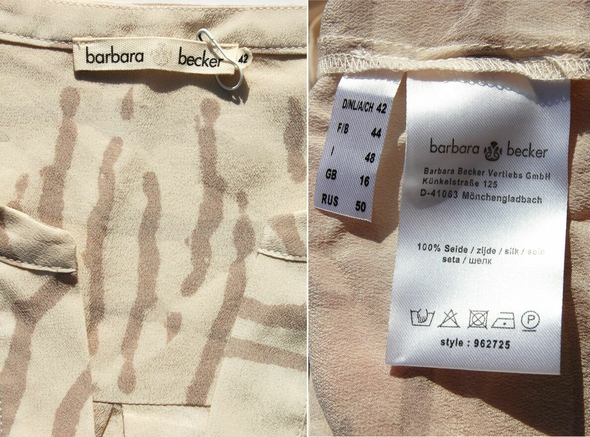 Piękna, jedwabna bluzka ekskluzywnej marki Barbara Becker, niemieckiej projektantki. Rozmiar niemiecki 42 (xL), może pasować też na osoby noszące L lub XXL - proszę sprawdzić wymiary poniżej. Materiał, skład: 100 % jedwab. Kolor jasnobeżowy z ciemniejszym, beżowym wzorem pasków zebry. Bluzka ma swobodny krój rozszerzający się ku dołowi. Rękawy mają długość 3/4. Bluzka jest nowa, bez papierowej etykiety.Wymiary mierzone na płasko: