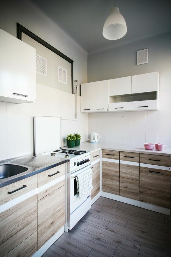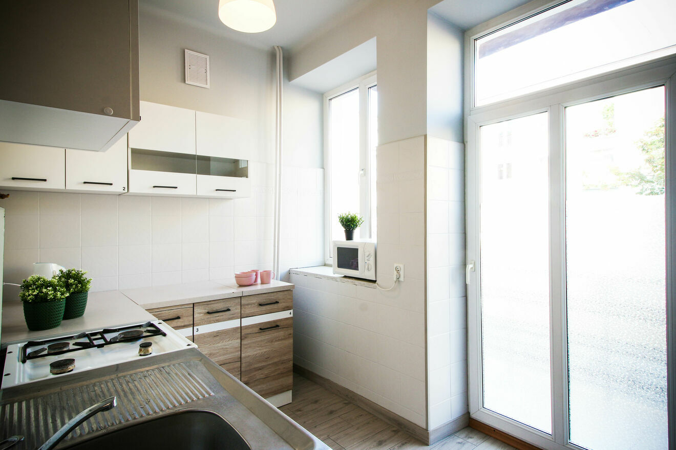 Kuchnia jest oddziela, widna, z oknem i z balkonem. W kuchni jest pełne wyposażenie (lodówka, kuchenka gazowa, mikrofala, czajnik elektryczny, garnki, talerze, szklanki, sztućce, etc.).