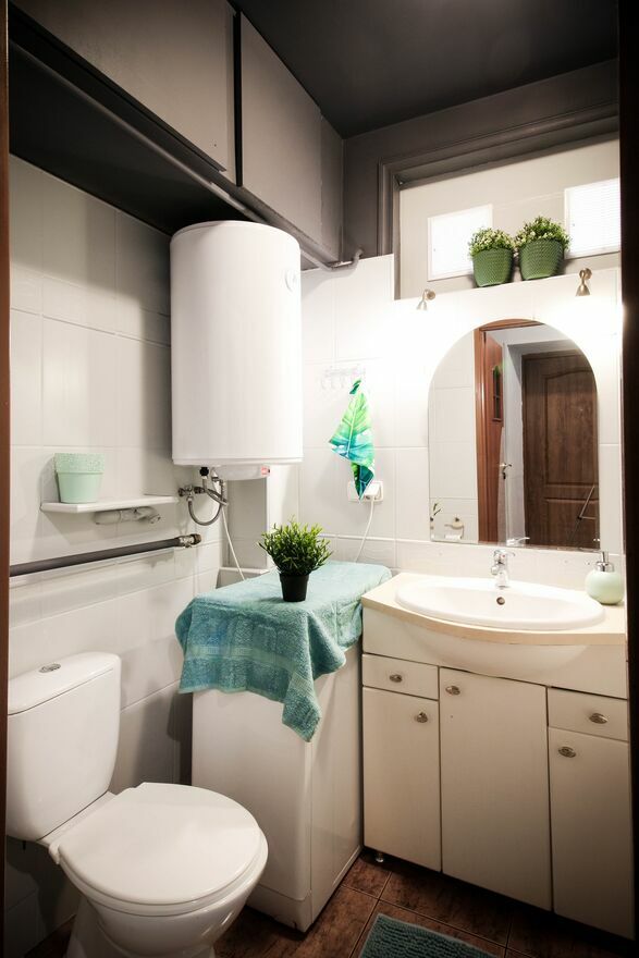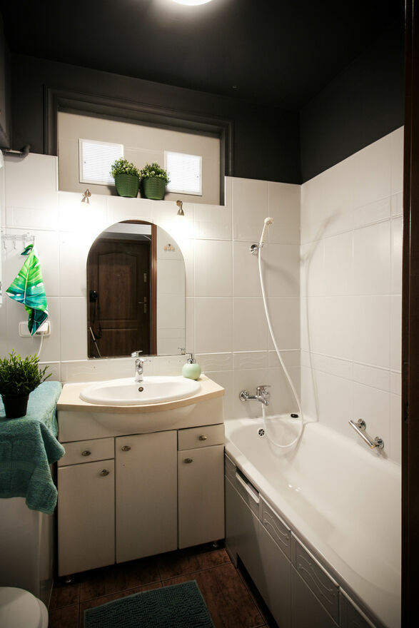 Łazienka i WC są razem. W łazience jest wanna, umywalka z szafką, lustro, wieszaki na ręczniki.