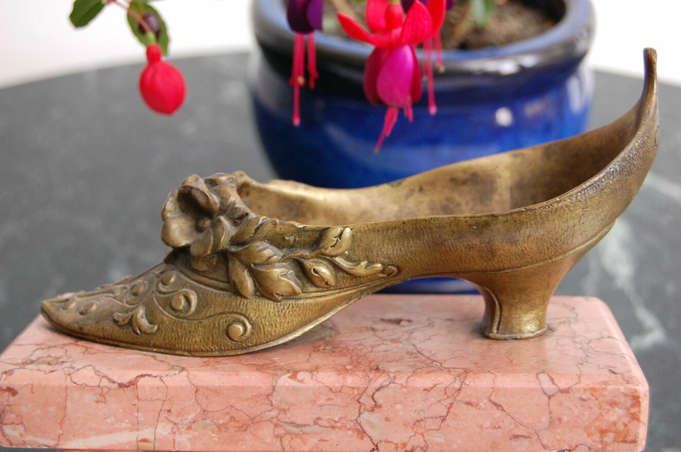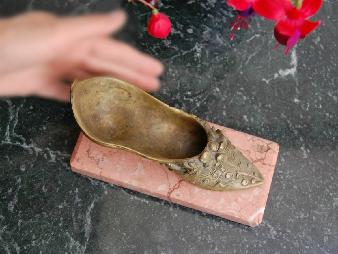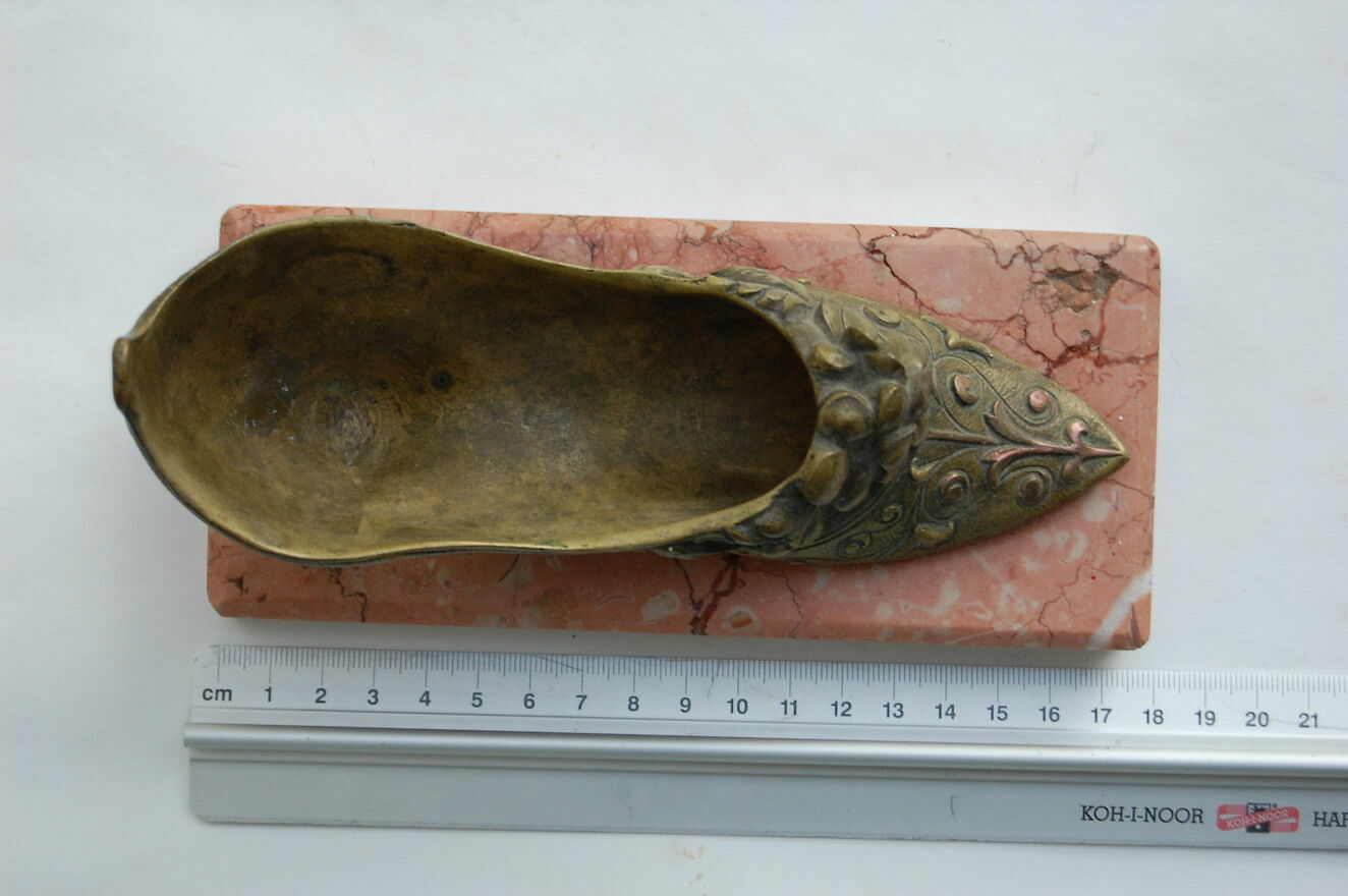 Piękna popielniczka w kształcie barokowego trzewiczka z mosiądzu na podstawie z różowego marmuru. But jest ozdobiony kwiatowym, wypukłym i rytym ornamentem. Mosiądz ma kolor starego złota, jest pokryty patyną w kolorze brązowo-zielonkawym. Marmurowa podstawa miejscami ma odpryski, brak jest jednej śruby łączącej obcas buta z podstawą - tył popielniczki przesuwa się na boki o ok. o,5 cm.Wymiary: