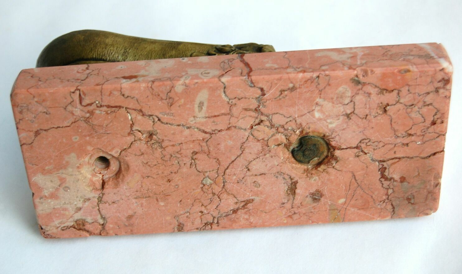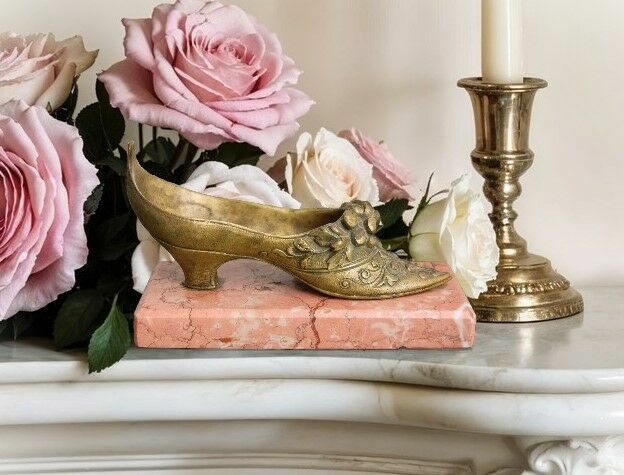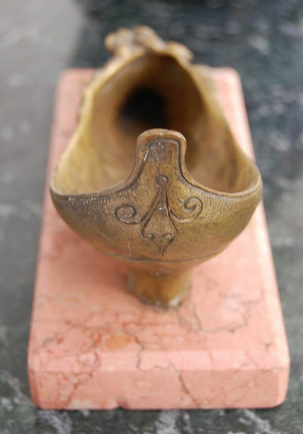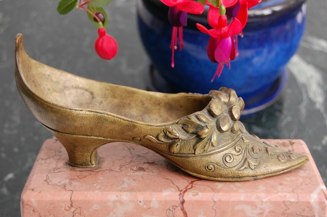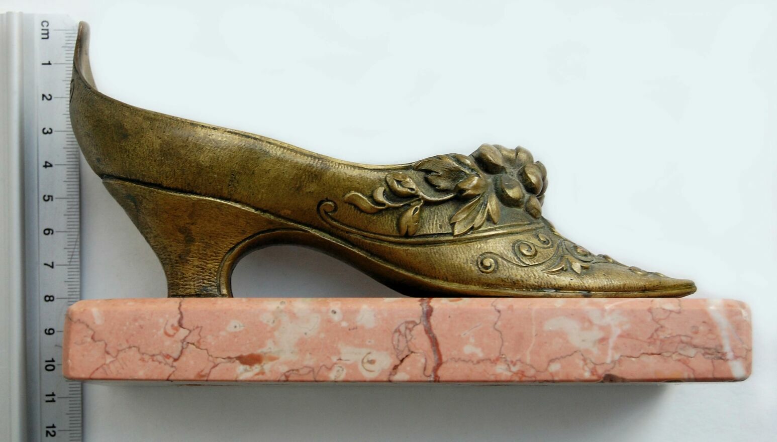 Piękna popielniczka w kształcie barokowego trzewiczka z mosiądzu na podstawie z różowego marmuru. But jest ozdobiony kwiatowym, wypukłym i rytym ornamentem. Mosiądz ma kolor starego złota, jest pokryty patyną w kolorze brązowo-zielonkawym. Marmurowa podstawa miejscami ma odpryski, brak jest jednej śruby łączącej obcas buta z podstawą - tył popielniczki przesuwa się na boki o ok. o,5 cm.Wymiary: