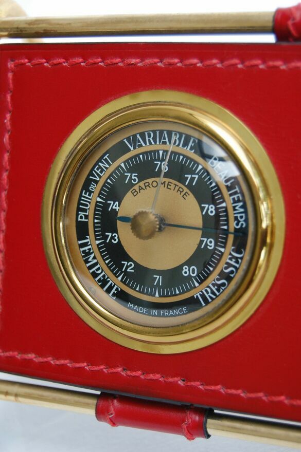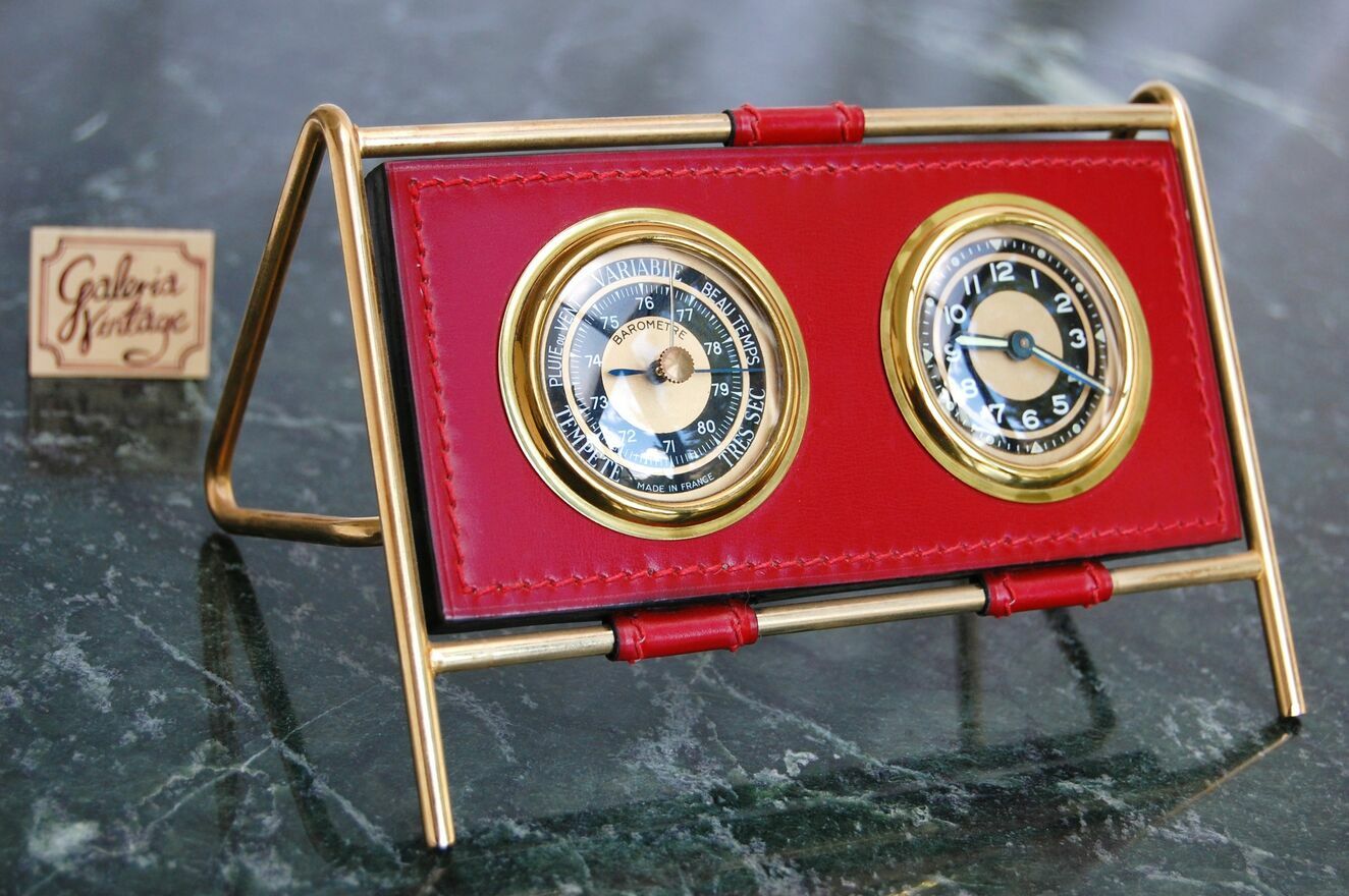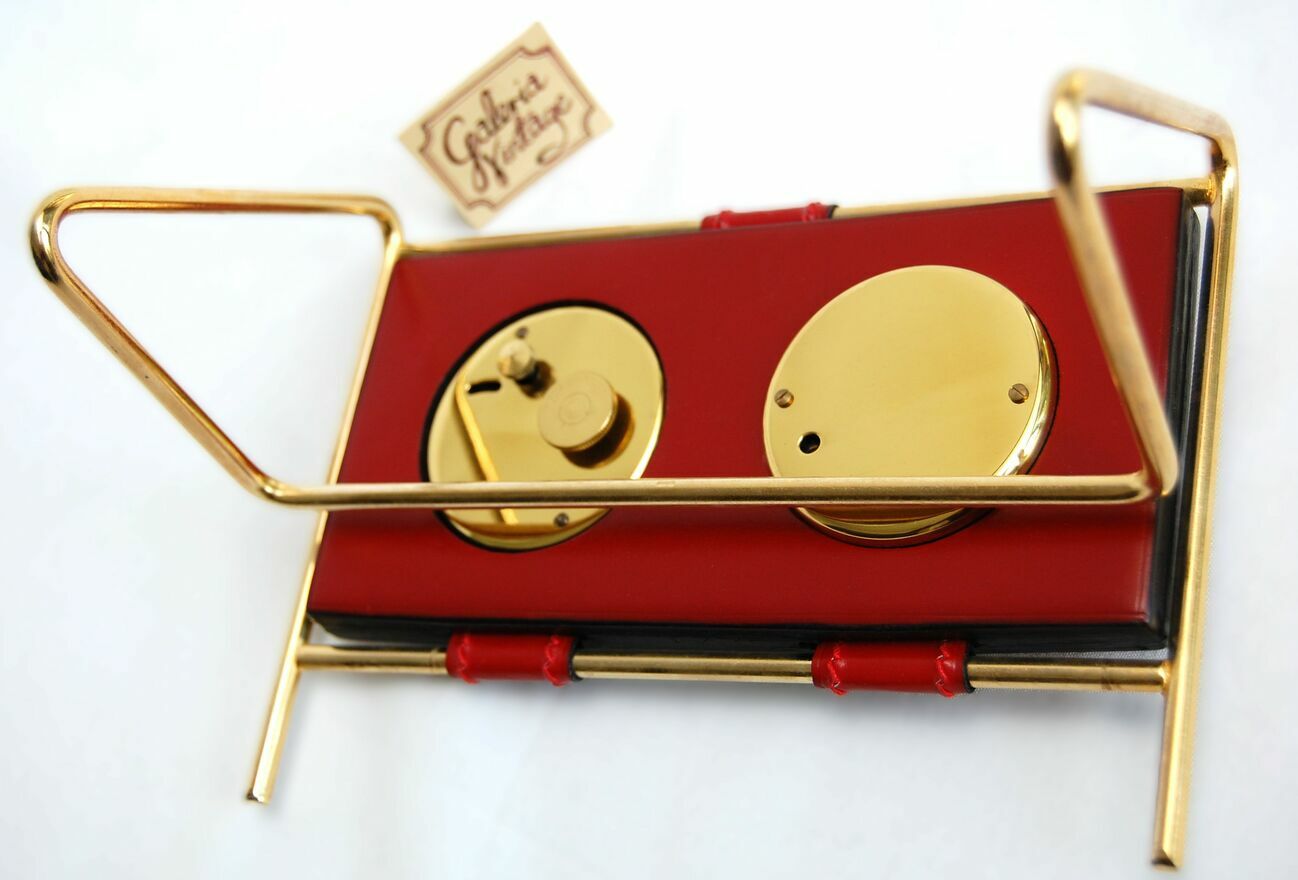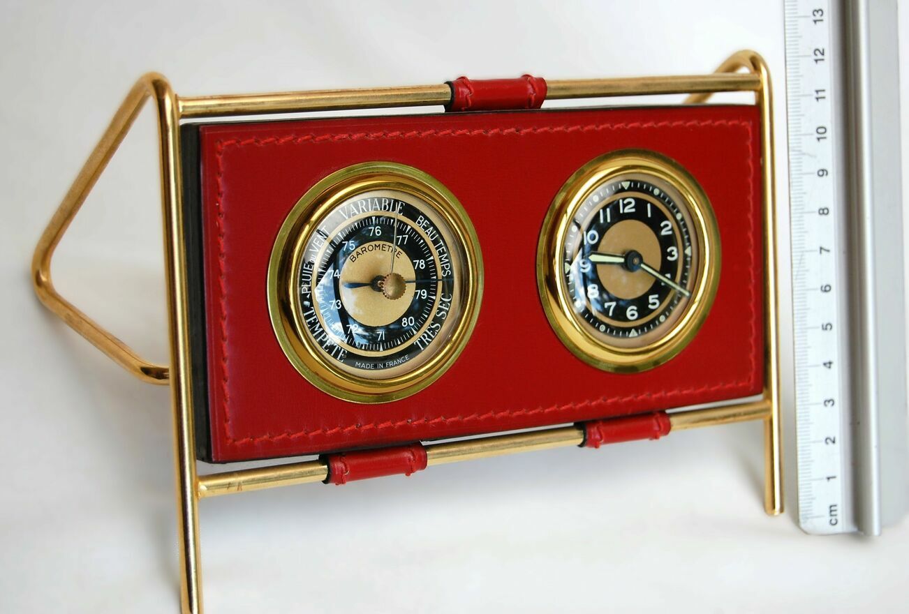 Barometr i zegar na biurko, Francja, lata 60 XX wieku. Barometr z zegar są osadzone w podstawie obszytej czerwoną skórą ekologiczną, na geometrycznym stelażu w kolorze złotym z połyskiem. Barometr działa, zegar natomiast wymaga nakręcenia. Wskazówki zegara i punkty godzin na podziałce fosforyzują w ciemności. Stan zachowania bardzo dobry.Wymiary: