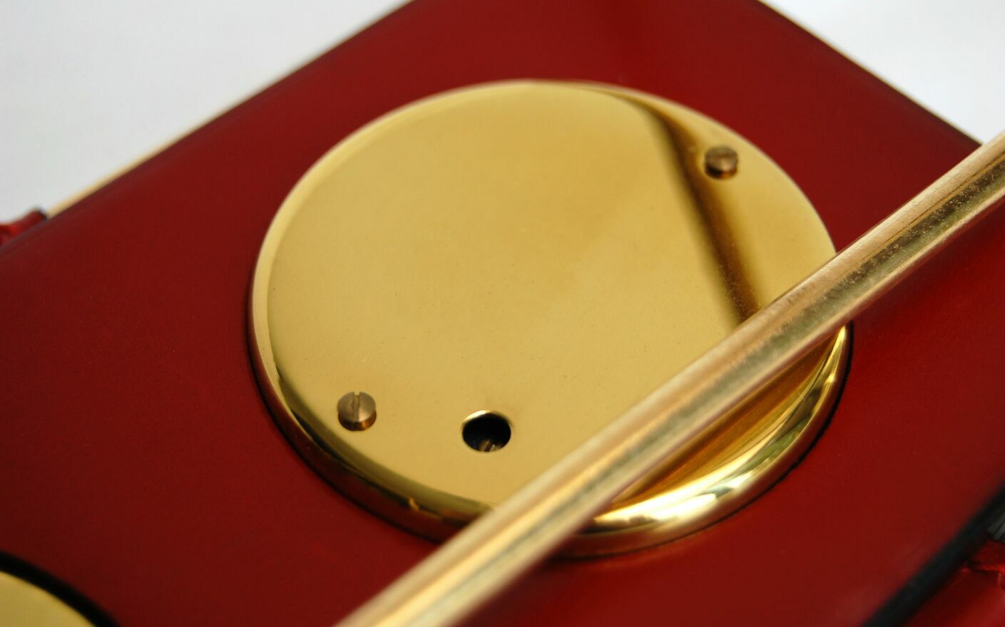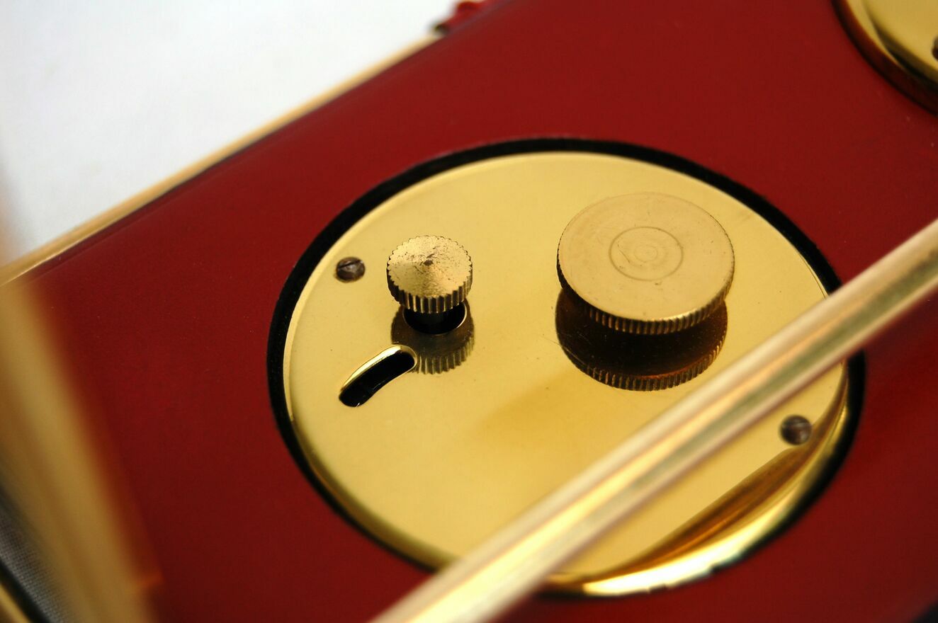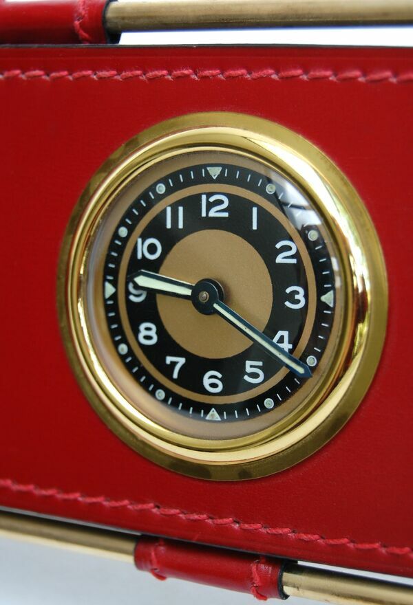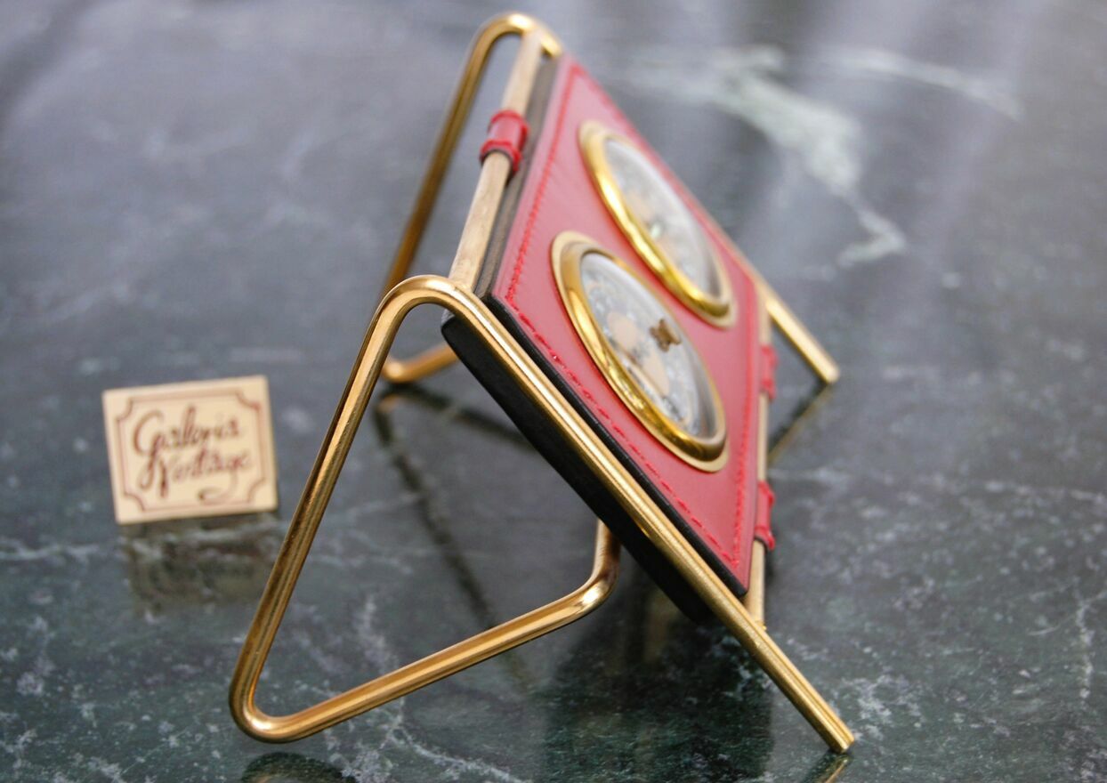 Barometr i zegar na biurko, Francja, lata 60 XX wieku. Barometr z zegar są osadzone w podstawie obszytej czerwoną skórą ekologiczną, na geometrycznym stelażu w kolorze złotym z połyskiem. Barometr działa, zegar natomiast wymaga nakręcenia. Wskazówki zegara i punkty godzin na podziałce fosforyzują w ciemności. Stan zachowania bardzo dobry.Wymiary: