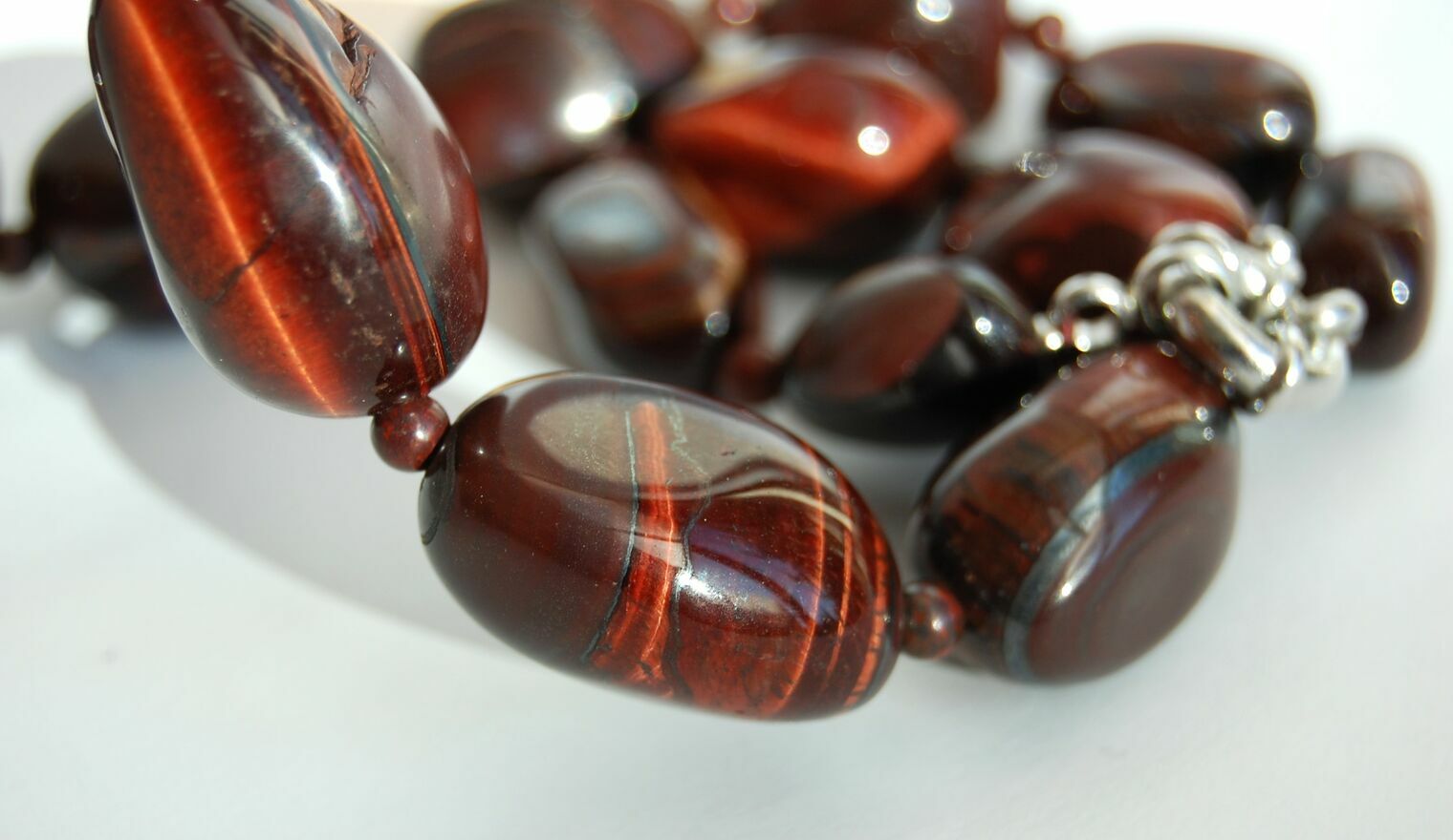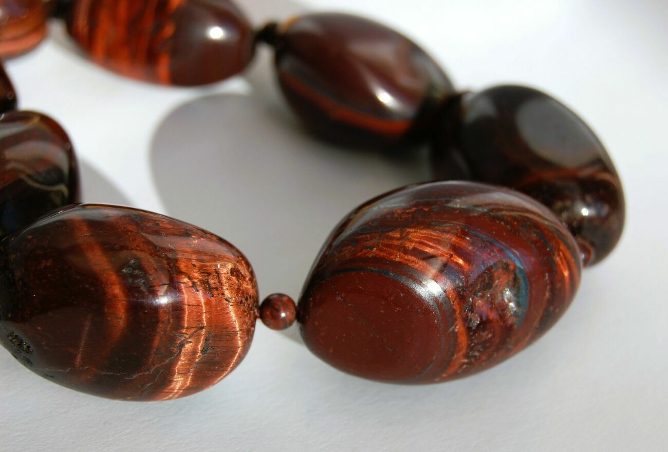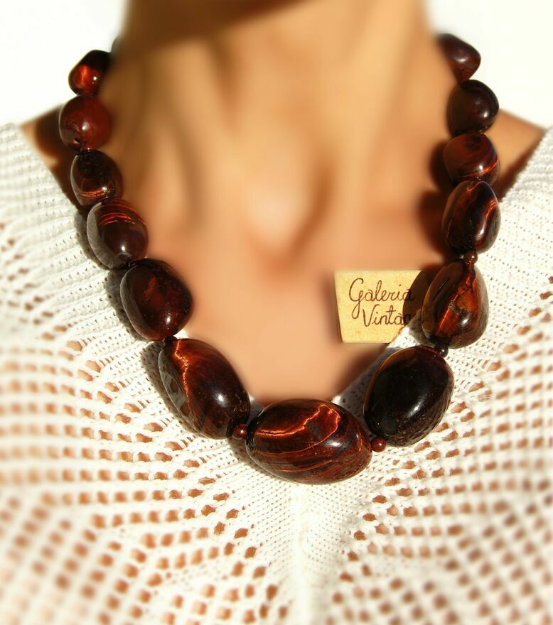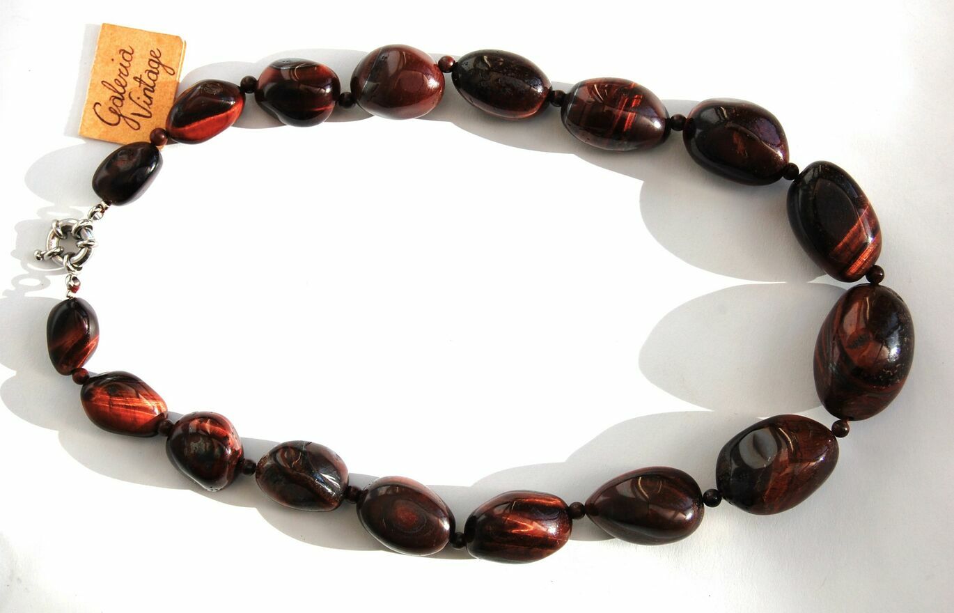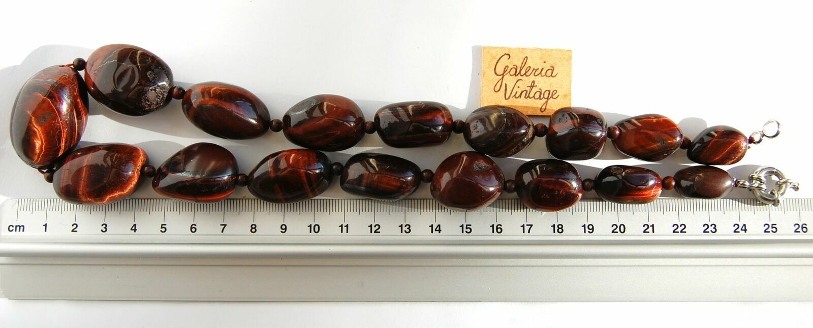 Piękny naszyjnik z ogromnych bryłek naturalnego kamienia - bawolego oka. Naszyjnik jest ciężki, masywny. Kamienie są polerowane, mają stopniowaną wielkość. Duże bryłki są przedzielone kuleczkami z tego samego kamienia, o średnicy 4 mm. Kamienie mają naturalną bordową barwę z efektem kocieko oka - ruchomego, aksamitnego blasku. W bryłkach są też widoczne srebrzyste pasma hematytu. Korale są nawleczone na bordową, podwójną nić, zapięcie jest metalowe, srebrne. Stan zachowania bardzo dobry, jedna bryłka ma dodatkowe nawiercenie (pokazane strzałką na zdjęciu).Wymiary: