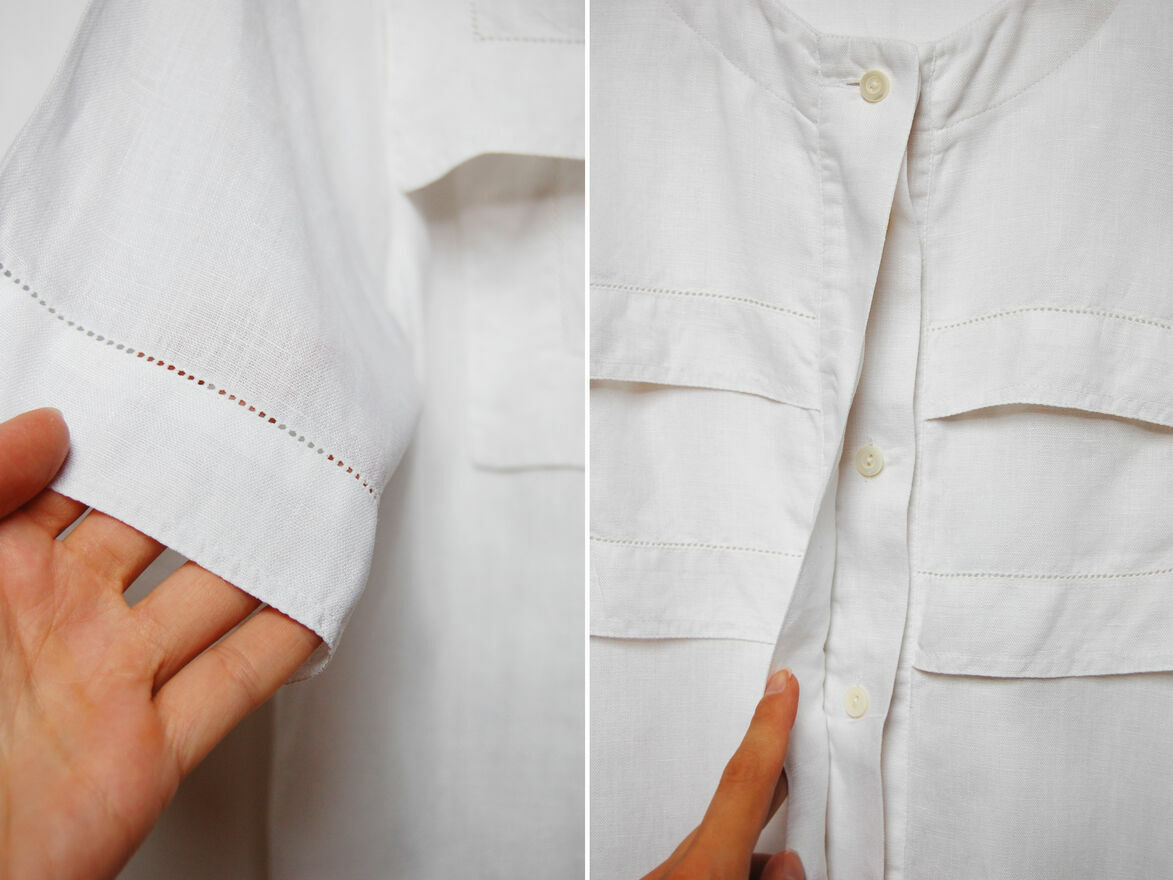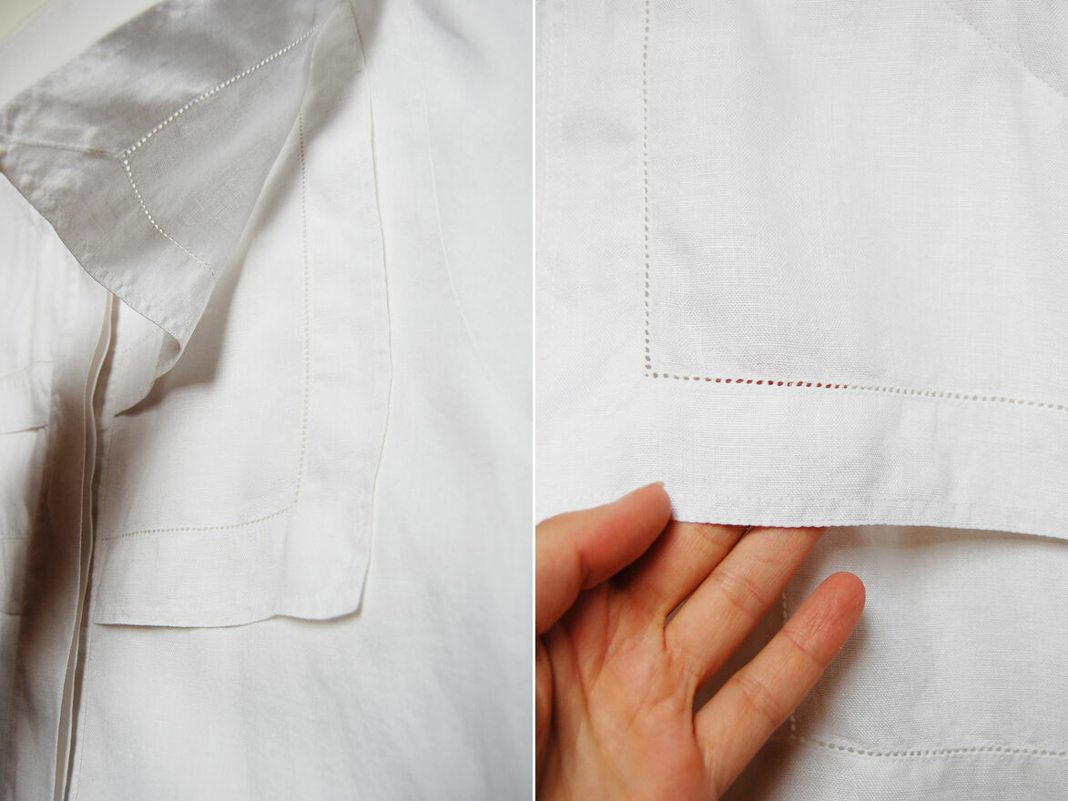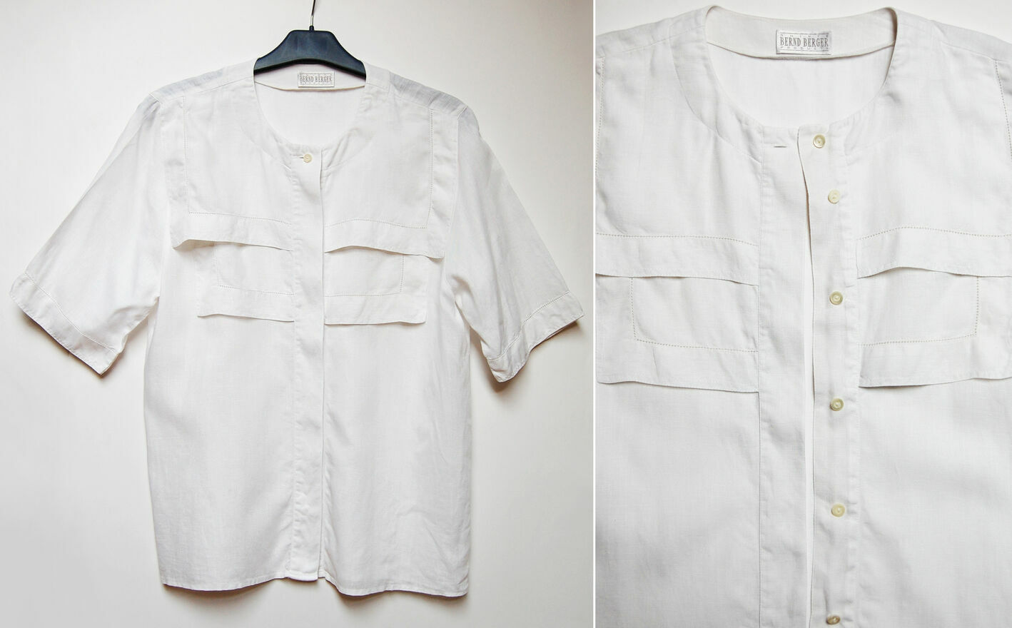 Piękna, designerska koszula damska - perełka vintage, zakupiona w Niemczech na przełomie lat 80 i 90 XX w. Marka Bernd Berger. Rozmiar 38(M). Materiał: 100% len. Kolor biały. Krój prosty. Kryte guziki. Żabot, delikatny, ażurowy haft na obrzeżu żabotu i rękawów. Stan idealny, koszula była przechowywana, bardzo rzadko noszona. Polecam miłośniczkom stylu vintage, retro, cottagecore.Do zdjęcia pozowała osoba szczupła i wysoka, nosząca rozmiar S, koszula ze względu na nieco oversize'owy, prosty krój może pasować rówież osobom noszącym rozm. S, o wzroście około 170 cm i wzwyż - proszę sprawdzić wymiary.