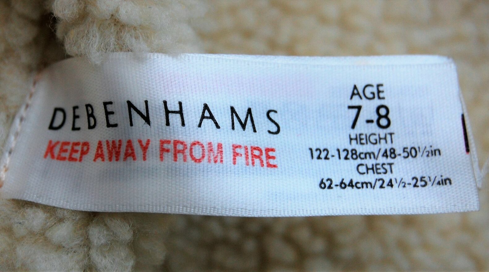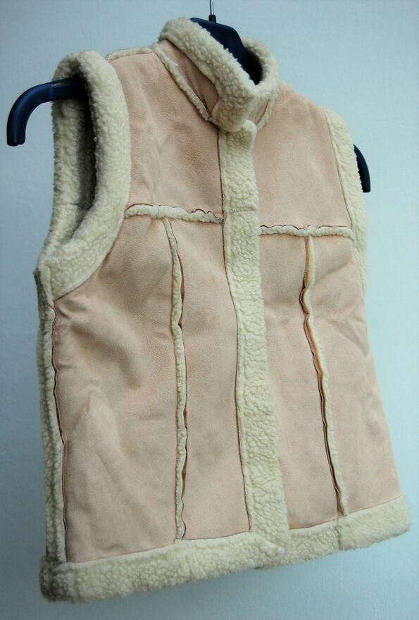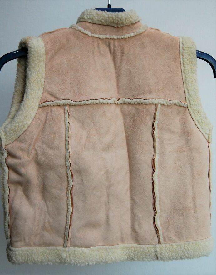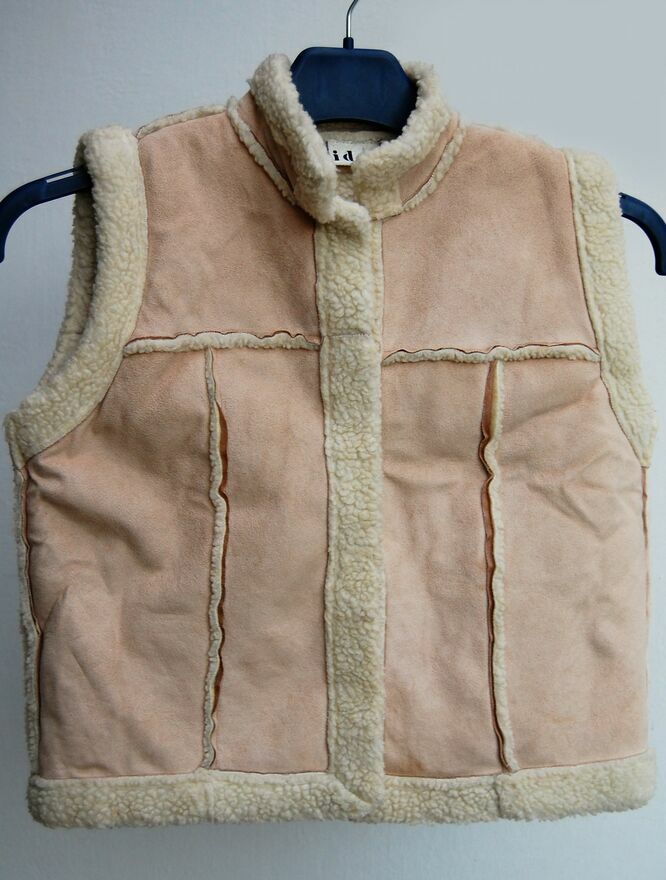 Kamizelka, syntetyczny kożuszek dla dzieci w wieku 7-8 lat, Debenhams. Kożuszek jest wykonany z delikatnego w dotyku, miękkiego materiału w kolorze beżowym z wyściółką i wykończeniem z kremowobiałej, syntetycznej wełny. Materiał, skład: 100% poliester. Zapięcie na zatrzaski. Można prać w pralce w 40 stopniach. Stan zachowania bardzo dobry.Wymiary podane przez producenta na metce:
