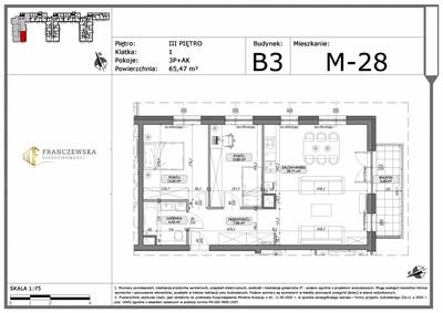 Trzypokojowe mieszkanie o powierzchni projektowej 65,47 m2 położone na trzecim piętrze w budynku z wystawą okien na ...