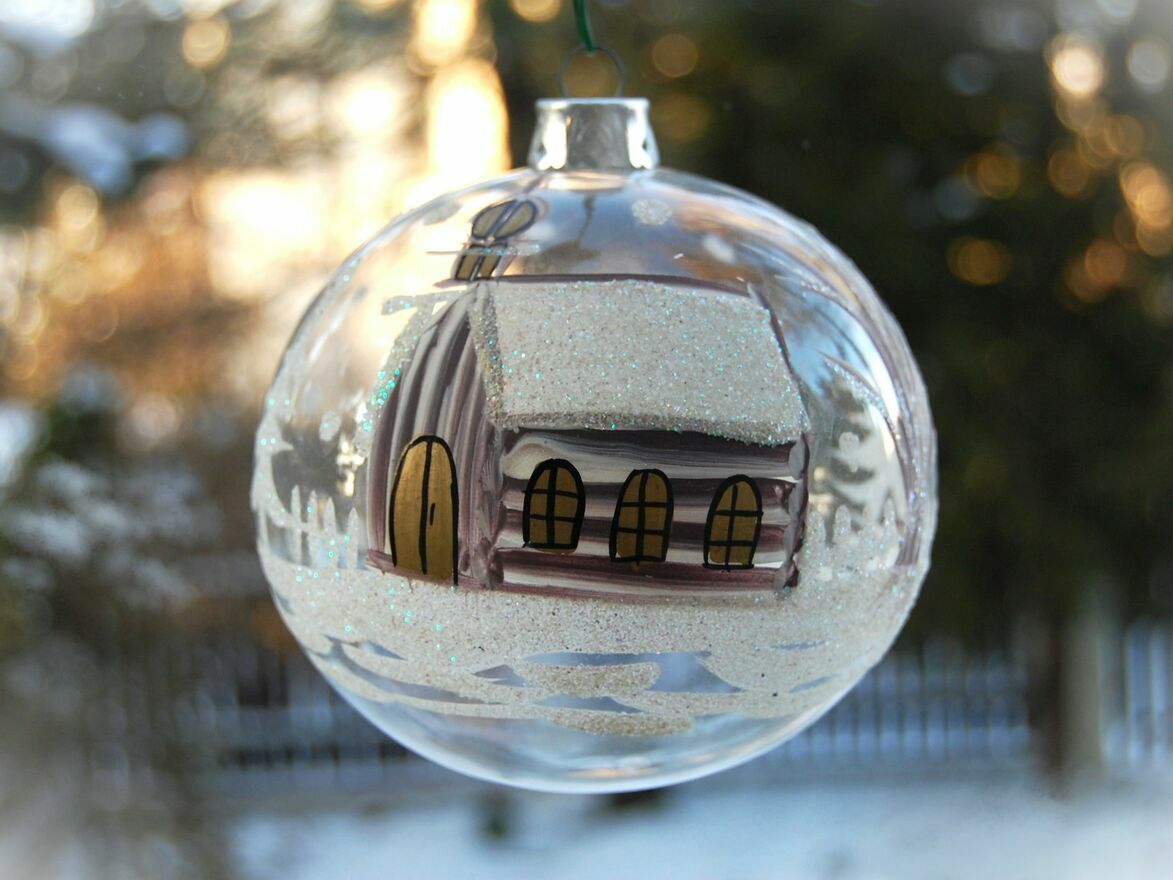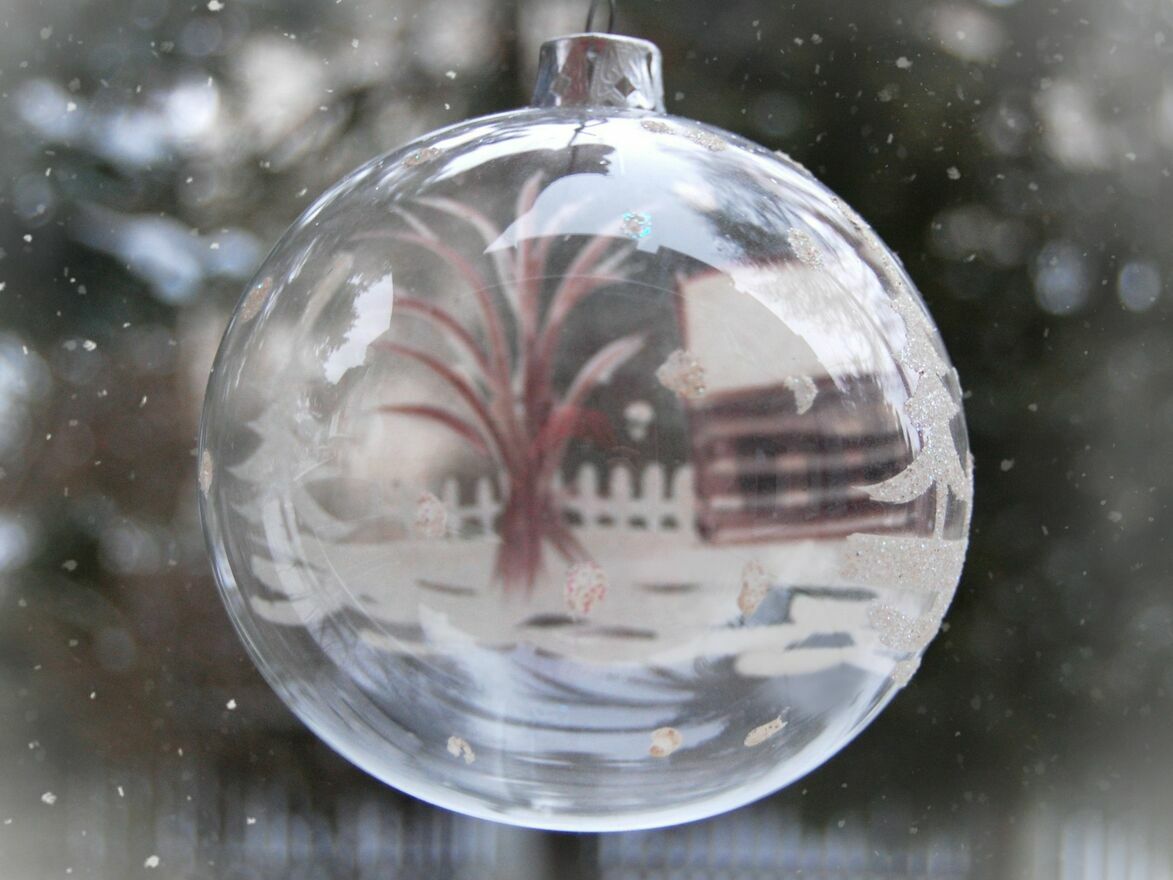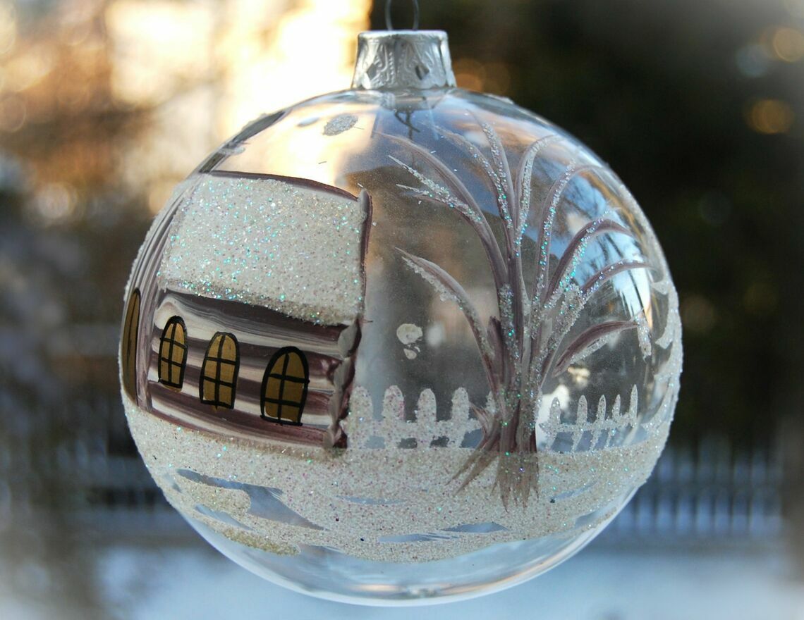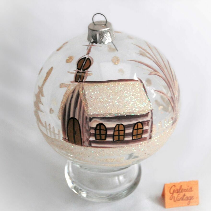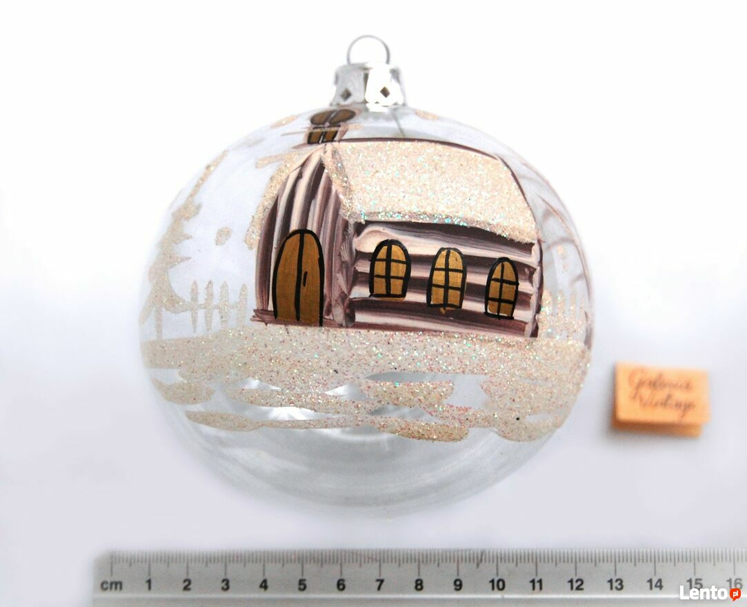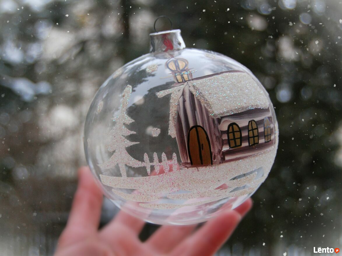 Piękna, duża, ręcznie malowana bombka szklana. Bombka jest przezroczysta z zimowym pejzażem z kościołem i śniegiem ozdobionym brokatem. Stan zachowania bardzo dobry.Wymiary: