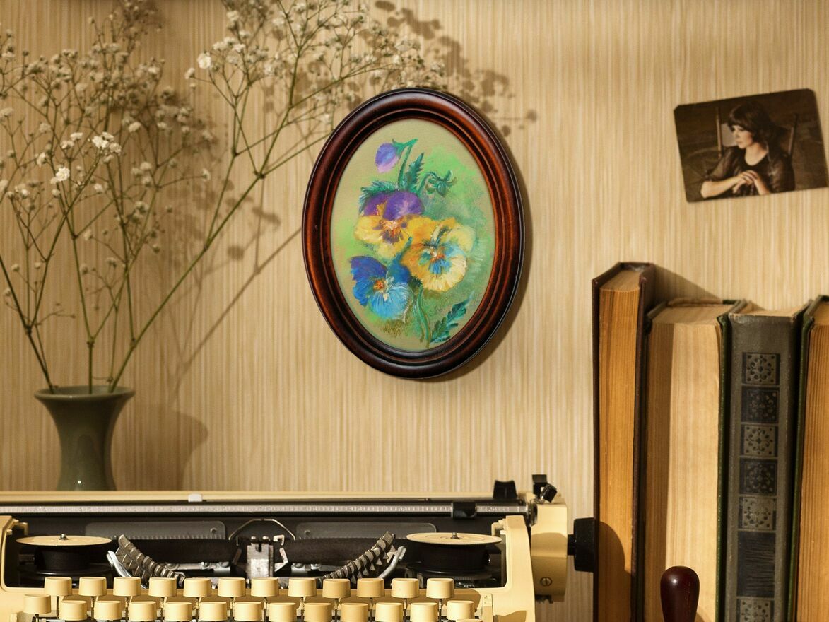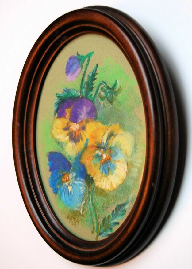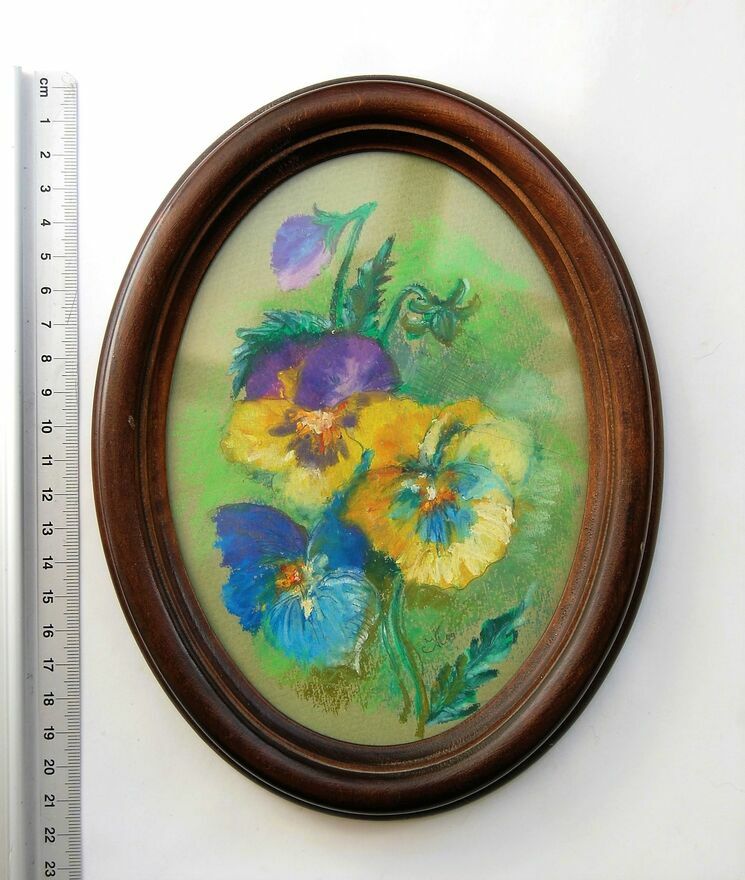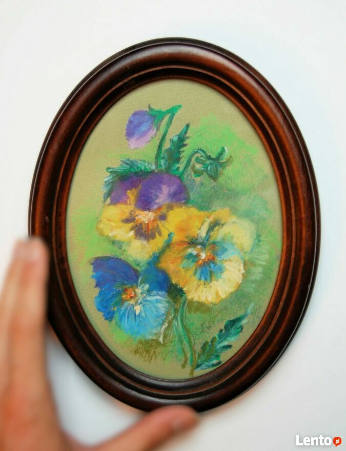 Uroczy, stary obrazek przedstawiający bratki, pochodzący ze Szwajcarii. Obrazek jest ręcznie namalowany pastelami, z podrysem wykonanym ołówkiem, na papierze w odcieniu stonowanej zieleni. Kolory są żywe. U dołu widoczna sygnatura i data '99 r. Praca jest oprawiona w owalną drewnianą, przeszkloną ramkę w kolorze ciemnego brązu. Ramkę można wieszać lub stawiać (ma podpórkę). Stan zachowania bardzo dobry.Wymiary: