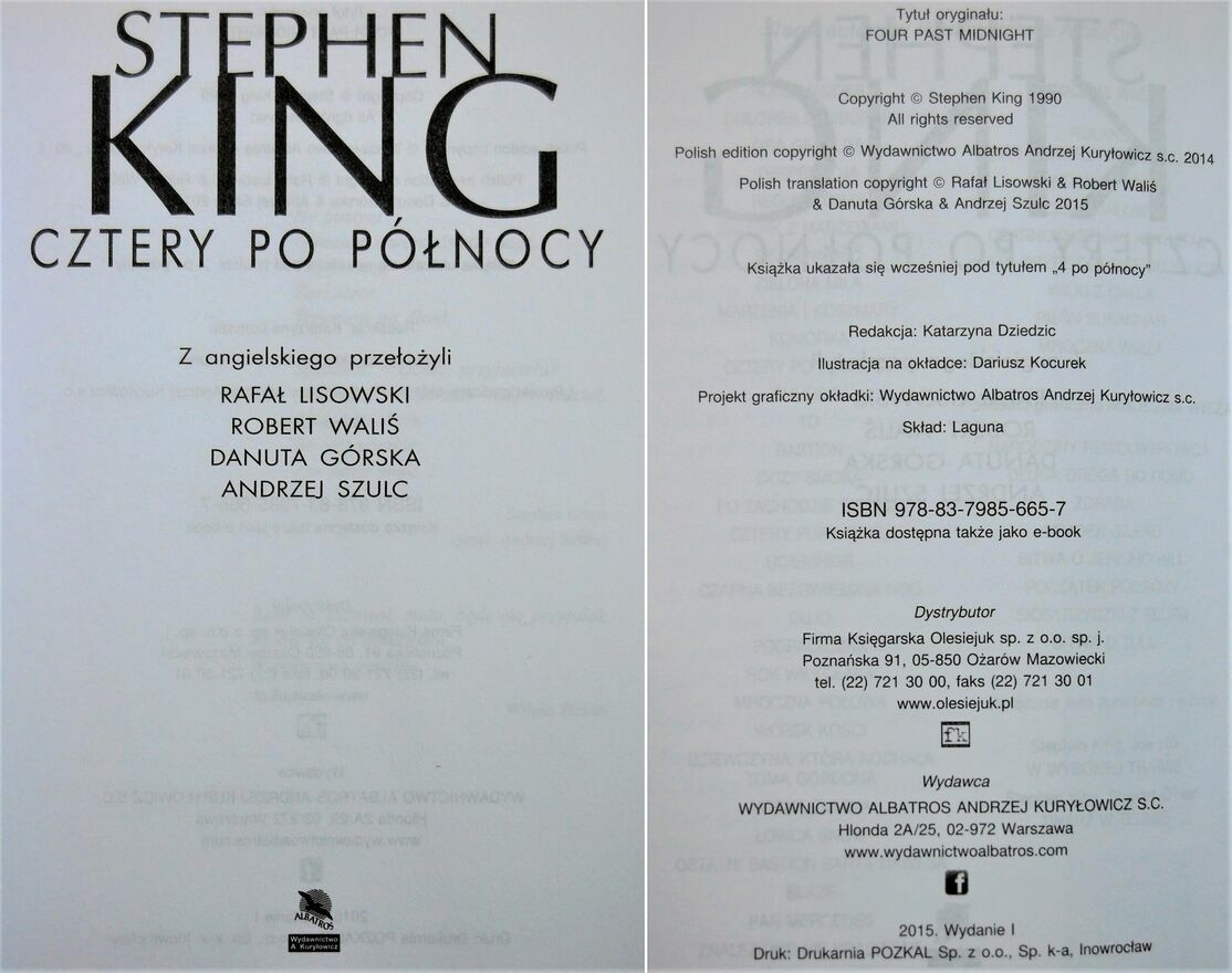 "Cztery po północy", Stephen King. Wydawnictwo Albatros Andrzej Kuryłowicz, rok wydania 2015. Wydanie I. Okładka miękka ze skrzydełkami. Liczba stron: 832. Książka jest nowa. W osobnych ofertach są dostępne pozostałe książki Stephena Kinga.Wymiary książki (wysokość x szerokość x głębokość): 20,5 x 14,4 x 4,3 (cm).