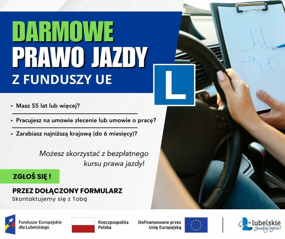 DARMOWE PRAWO JAZDY Z FUNDUSZY UE – DLA OSÓB 55+!Nigdy nie jest za późno na nowe umiejętności! Skorzystaj z szansy i zdobądź prawo jazdy całkowicie za darmo w ramach programu Funduszy Europejskich.