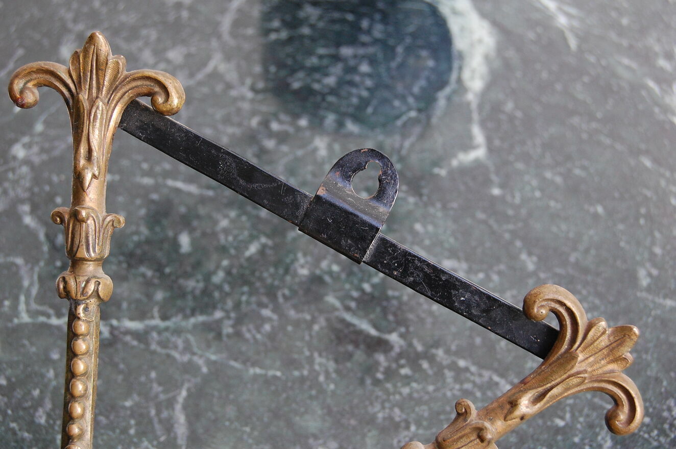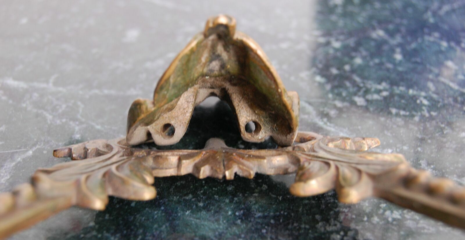 Część lustra w klasycystycznym stylu z głową Fauna, Pana i liśćmi akantu. Dekor jest wykonany z mosiądzu, ma kolor starego złota, przyciemnionego zielonkawo-brązową patyną. Górny element - łącznik z zawieszką jest miedziany, pomalowany na czarno. Rewers ramy jest również pokryty czarną farbą. Stan zachowania bardzo dobry, miejscami farba ma odpryski i zarysowania.Wymiary: