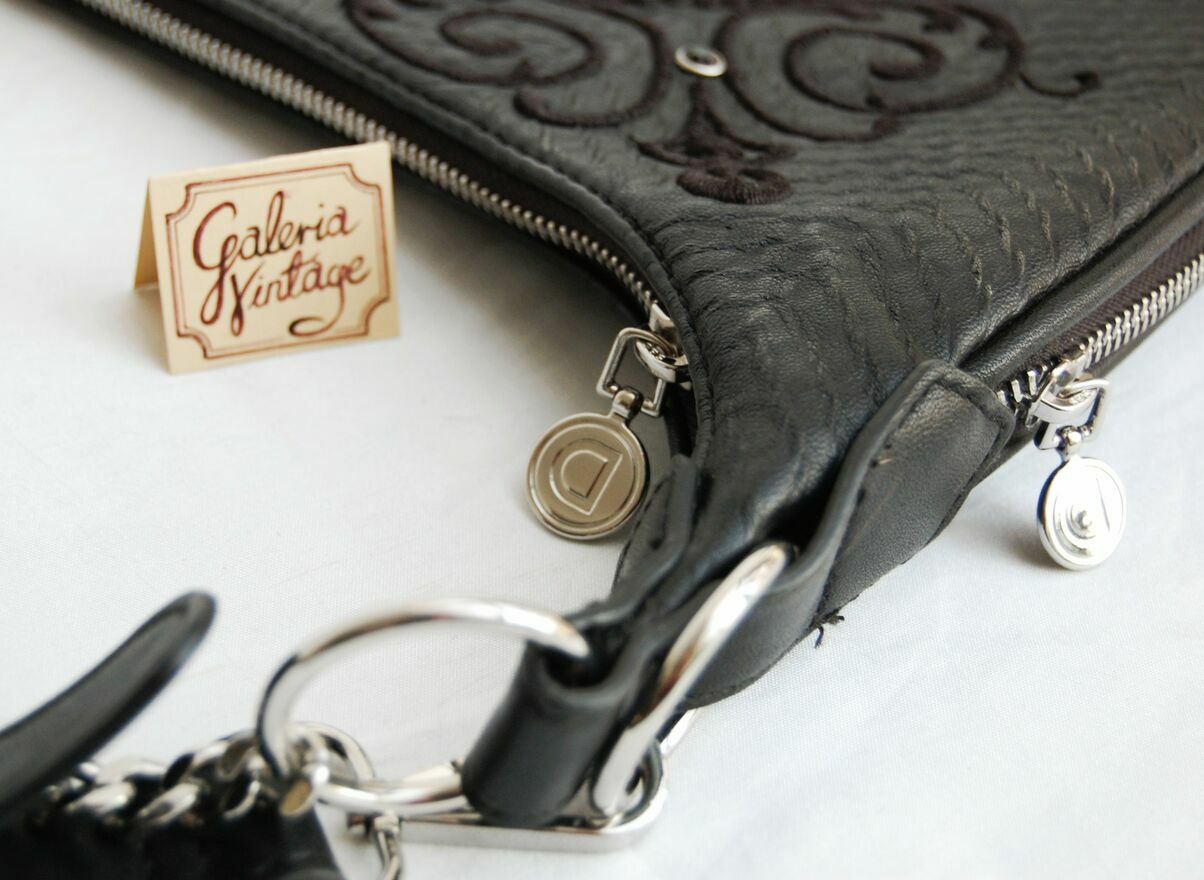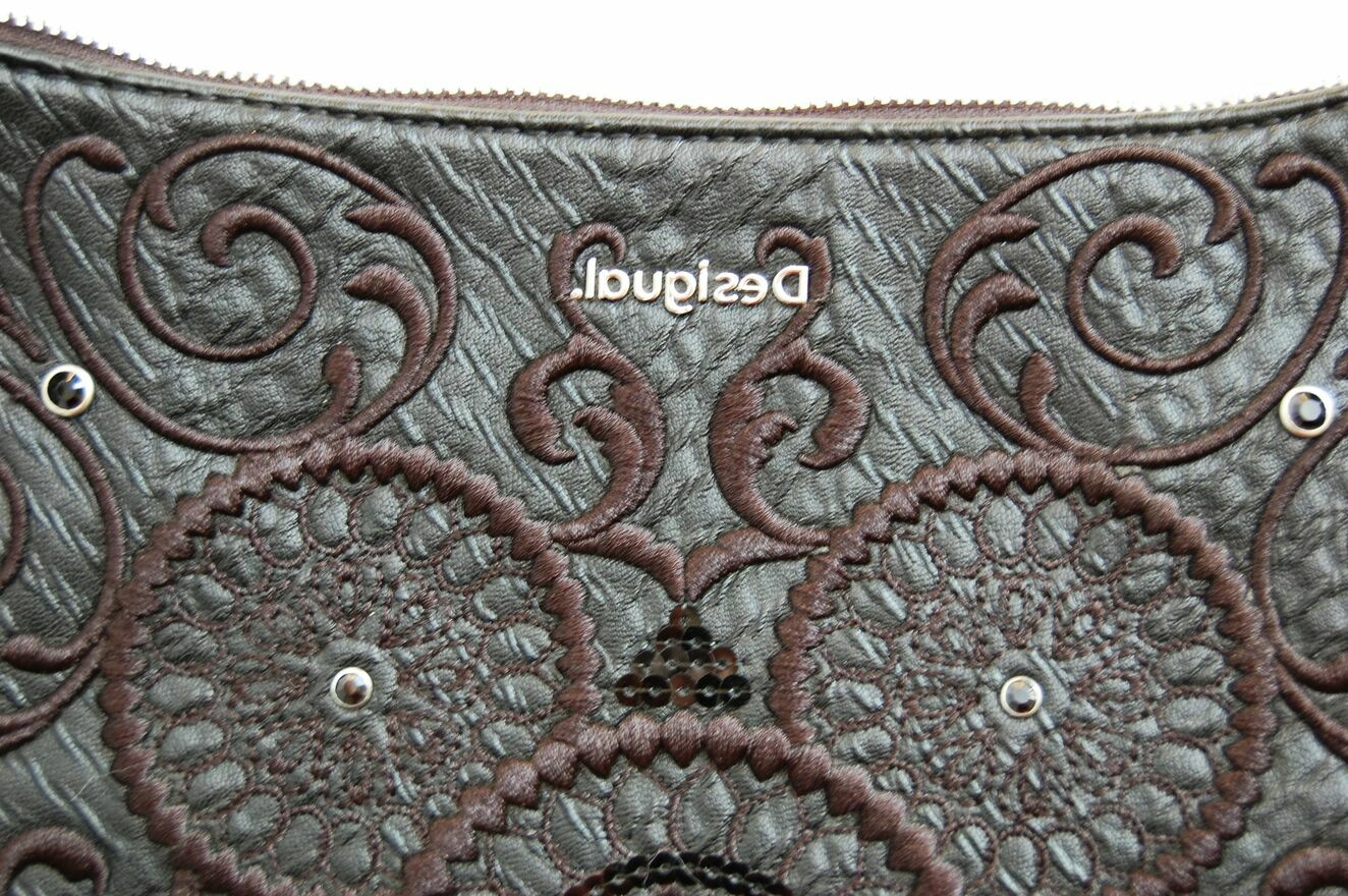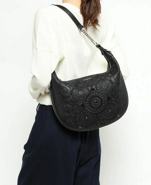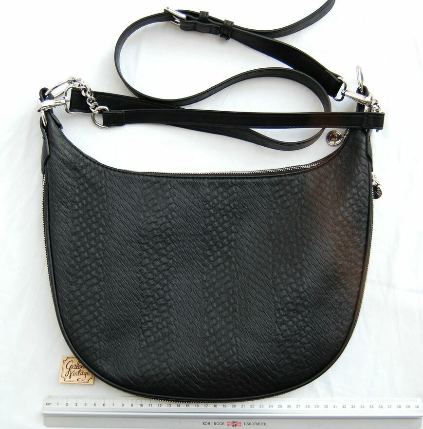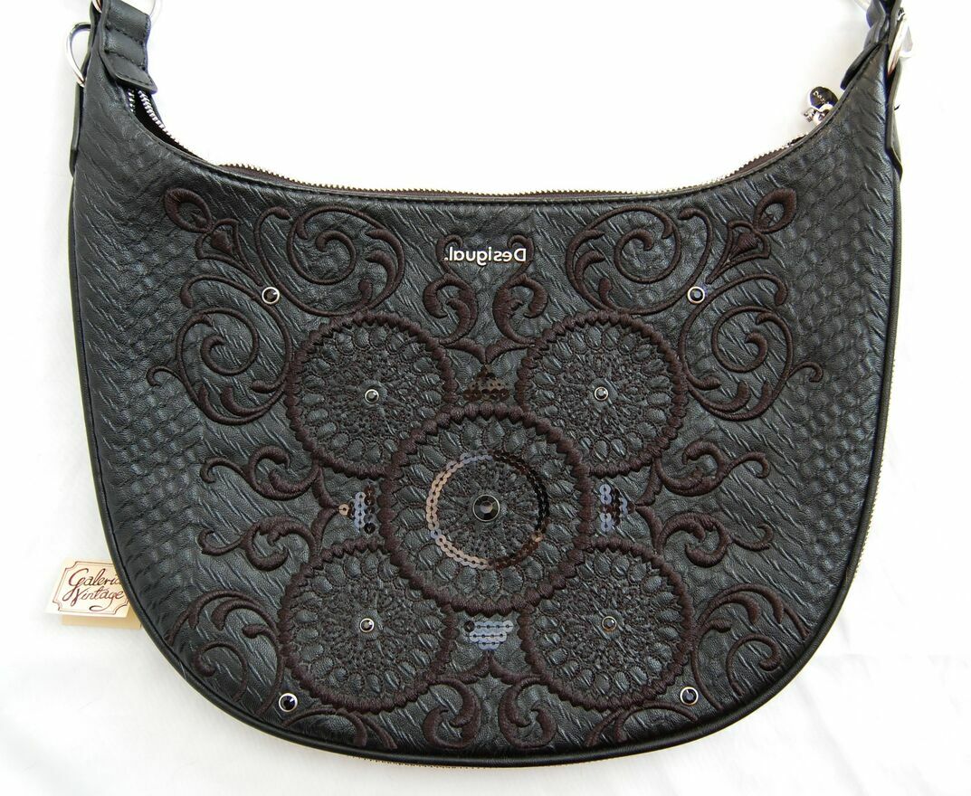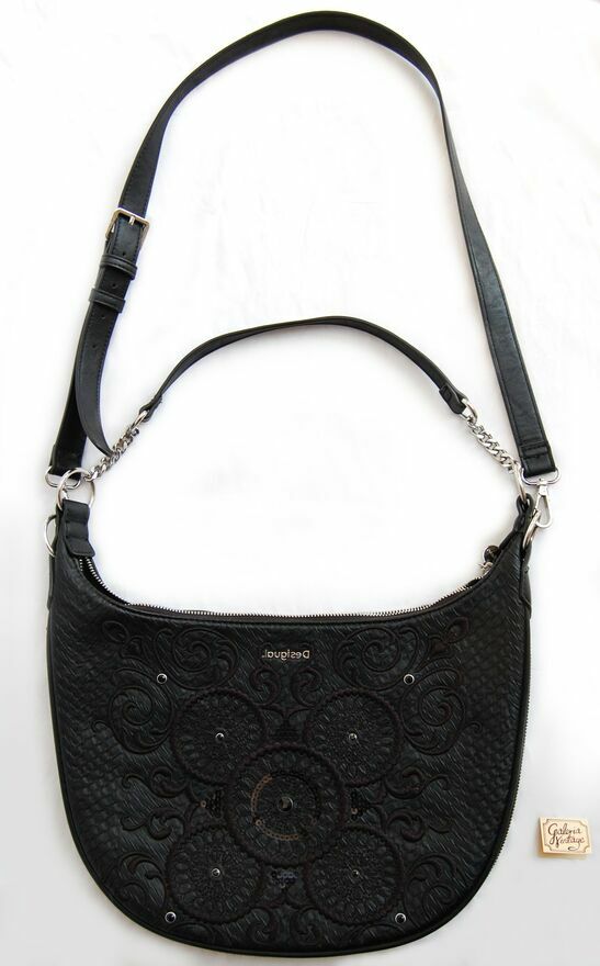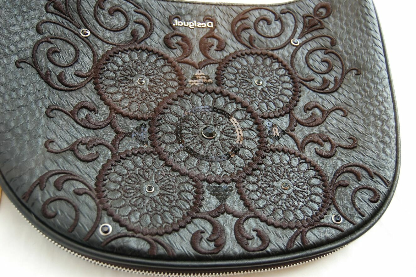 Piękna torebka damska na ramię w kształcie półksiężyca - lunuli z etnicznym, misternym haftem. Marka Desigual, model Bols Majestic Siberia - rzadko spotykany już w sprzedaży. Pojemność średnia (nie mieści A3). Kolor czarny. Materiał: skóra ekologiczna, tłoczona, półmatowa, o fakturze skóry węża. Haft wykonany jest czarną nicią z elementami wyszywanymi czarnymi cekinami i czarnymi dżetami - fasettowanymi, okrągłymi kryształkami w metalowej oprawie. Zamknięcie na srebrny zamek, zamek jest również od spodu, umożliwia poszerzenie dna torby. We wnętrzu czarny materiał, jedna komora i dwie kieszenie: otwarta i zapinana na zamek. Torba ma dwa paski, dłuższy z dwoma karabińczykami, odpinany, regulowany, z klamrą. Torba jest lekka, giętka, wygodna. Stan zachowania bardzo dobry - jak nowa. Torba była zaledwie trzy razy noszona, jedynym śladem użytkowania jest zaciągnięta nitka na hafcie u dołu torby (pokazana strzałką na zdjęciu).Wymiary samej torby bez pasków:
