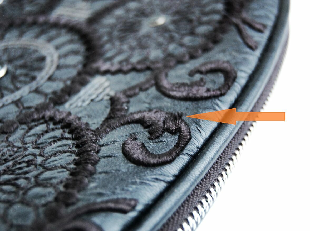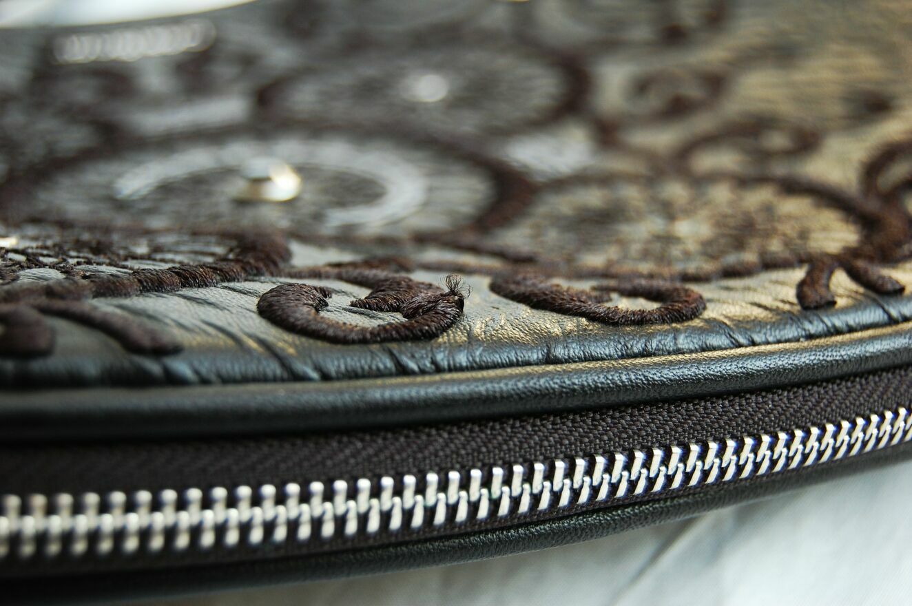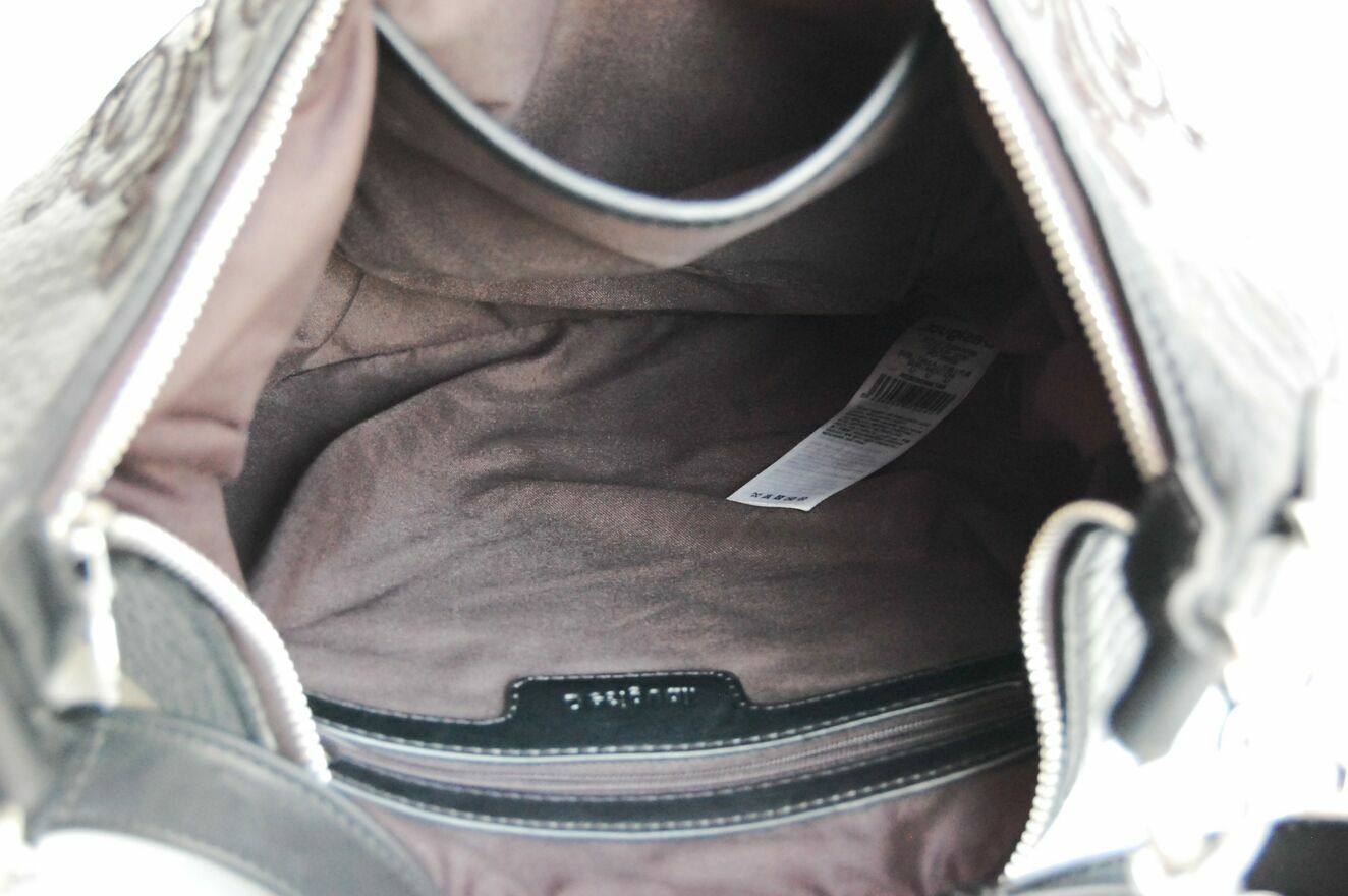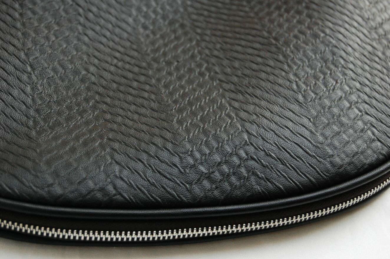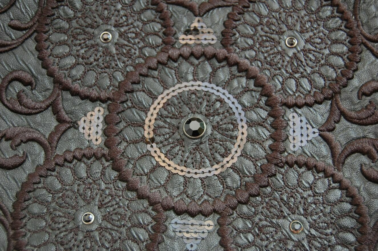 Piękna torebka damska na ramię w kształcie półksiężyca - lunuli z etnicznym, misternym haftem. Marka Desigual, model Bols Majestic Siberia - rzadko spotykany już w sprzedaży. Pojemność średnia (nie mieści A3). Kolor czarny. Materiał: skóra ekologiczna, tłoczona, półmatowa, o fakturze skóry węża. Haft wykonany jest czarną nicią z elementami wyszywanymi czarnymi cekinami i czarnymi dżetami - fasettowanymi, okrągłymi kryształkami w metalowej oprawie. Zamknięcie na srebrny zamek, zamek jest również od spodu, umożliwia poszerzenie dna torby. We wnętrzu czarny materiał, jedna komora i dwie kieszenie: otwarta i zapinana na zamek. Torba ma dwa paski, dłuższy z dwoma karabińczykami, odpinany, regulowany, z klamrą. Torba jest lekka, giętka, wygodna. Stan zachowania bardzo dobry - jak nowa. Torba była zaledwie trzy razy noszona, jedynym śladem użytkowania jest zaciągnięta nitka na hafcie u dołu torby (pokazana strzałką na zdjęciu).Wymiary samej torby bez pasków: