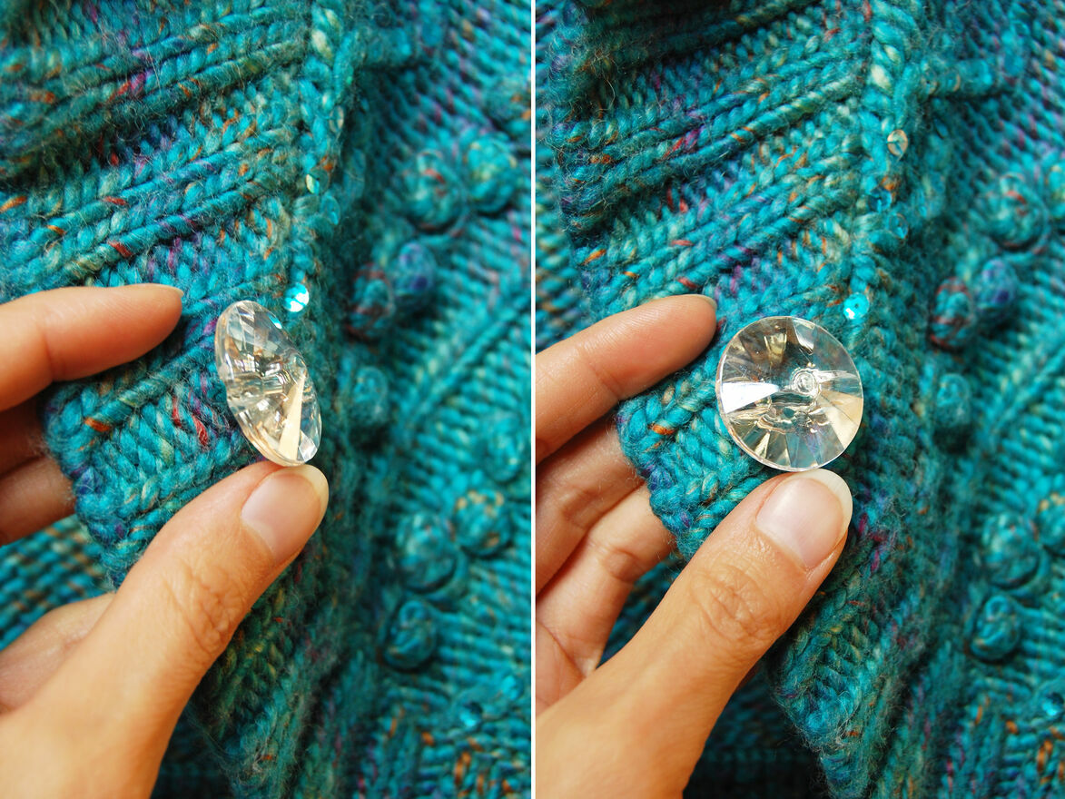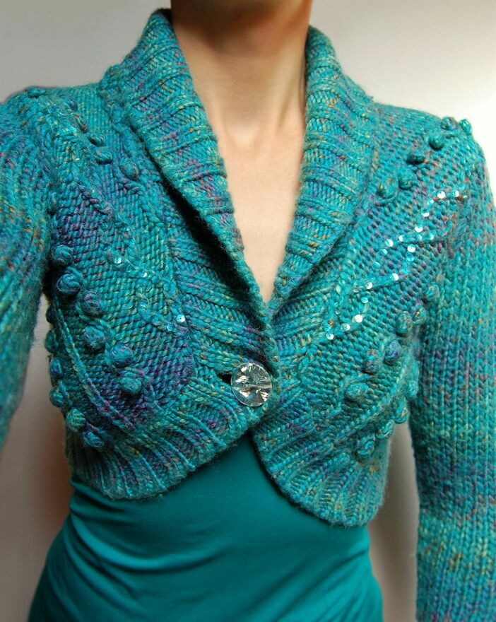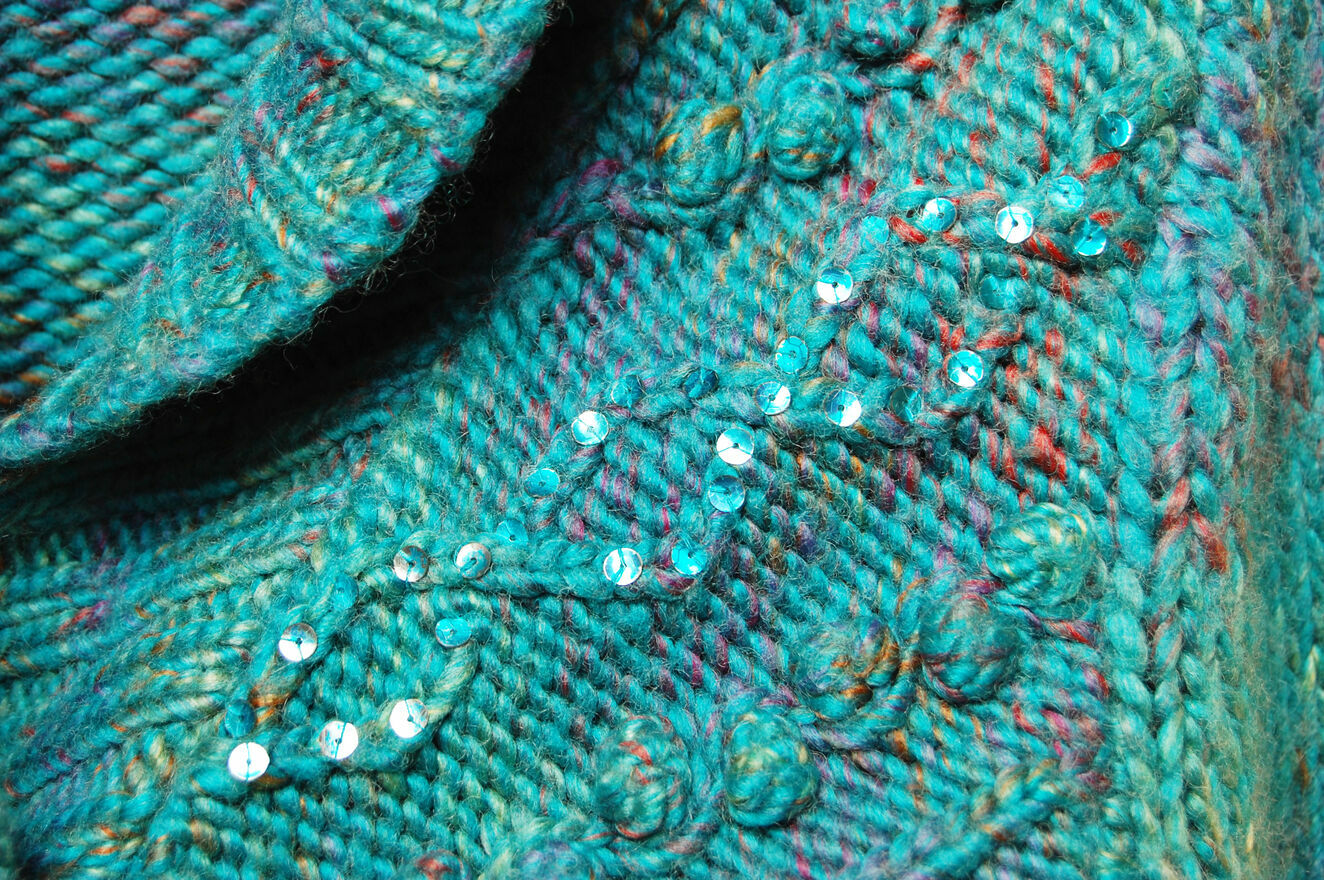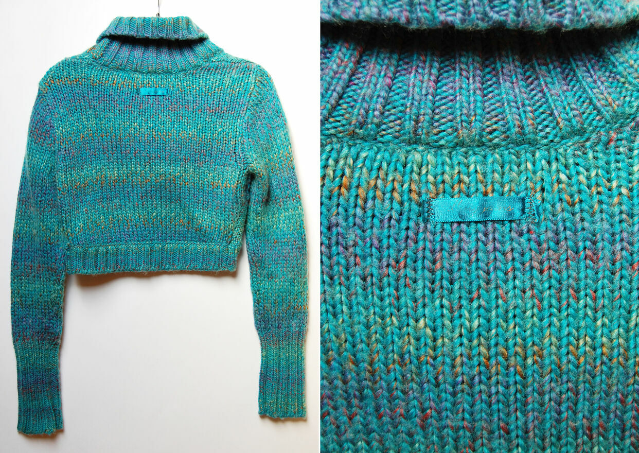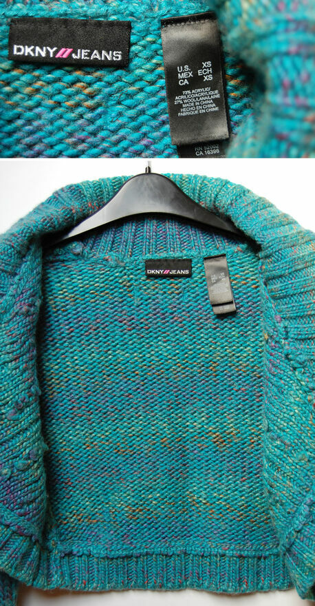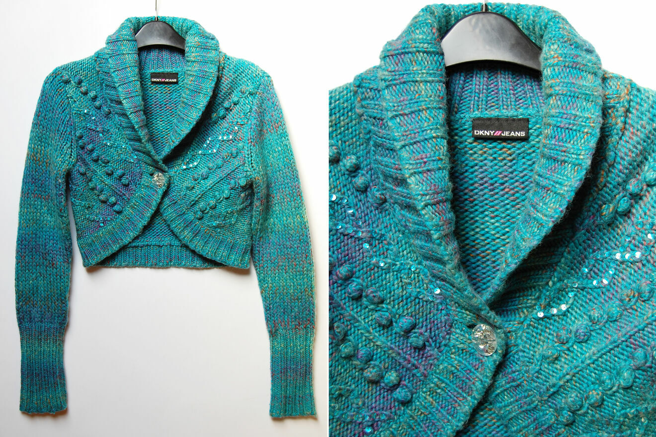 Krótki sweterek, bolerko marki DKNY. Rozmiar 34 (XS). Kolor dominujący: turkus z melanżem w kolorach fioletu, błękitu, zieleni, żółci, pomarańczu i czerwieni. Materiał, skład: 73% akryl, 27% wełna. Materiał jest dość gruby, mięsisty, ciepły. Sweter jest zdobiony turkusowymi cekinami, niektóre z nich mają miejscami przetartą farbę i ich połysk jest bardziej srebrny (widoczne na zdjęciu). Stan bardzo dobry, materiał jest lekko zmechacony (widoczne na zdjęciach).Wymiary:
