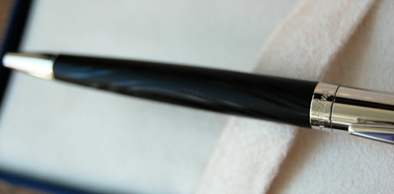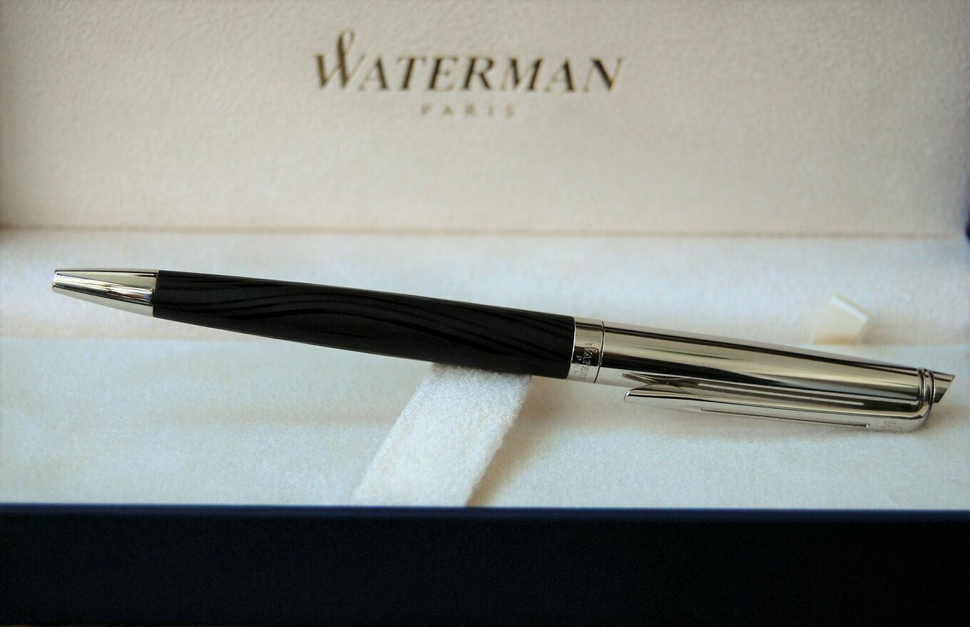 Długopis Waterman Hemisphere Deluxe jedwab BP. Elegancki, smukły długopis w kolorze czarno-srebrnym z satynowym korpusem grawerowanym w linearny, falisty, połyskujący wzór. Nasadka jest platerowana palladem, wykończenia chromowane. Długopis ma obrotowy mechanizm wysuwania wkładu. Wkład Waterman standard max w kolorze niebieskim. Stan: nowy, z międzynarodową gwaracją, w oryginalnym pudełku.CENA NIE PODLEGA NEGOCJACJI.