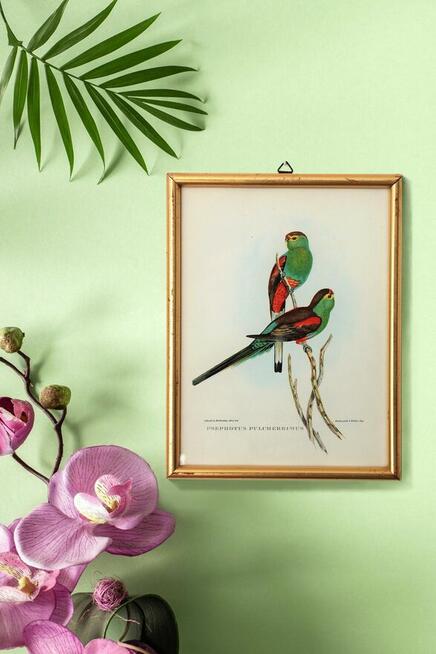 Chromolitografia w ramce, najprawdopodobniej z początku lat sześćdziesiątych XX w., przedstawiająca papugi z gatunku ...