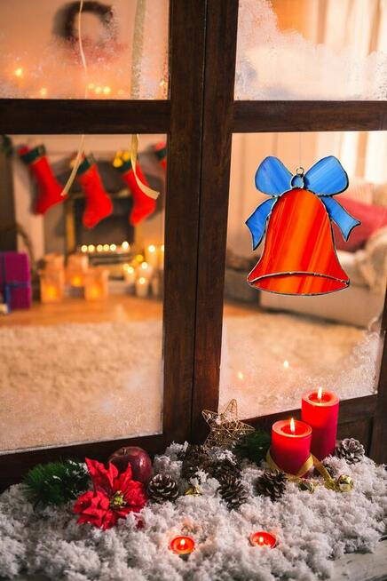 Świąteczny dzwonek z kokardą - witraż w technice Tiffany'ego. Witraż jest wykonany z półprzezroczystego szkła ...