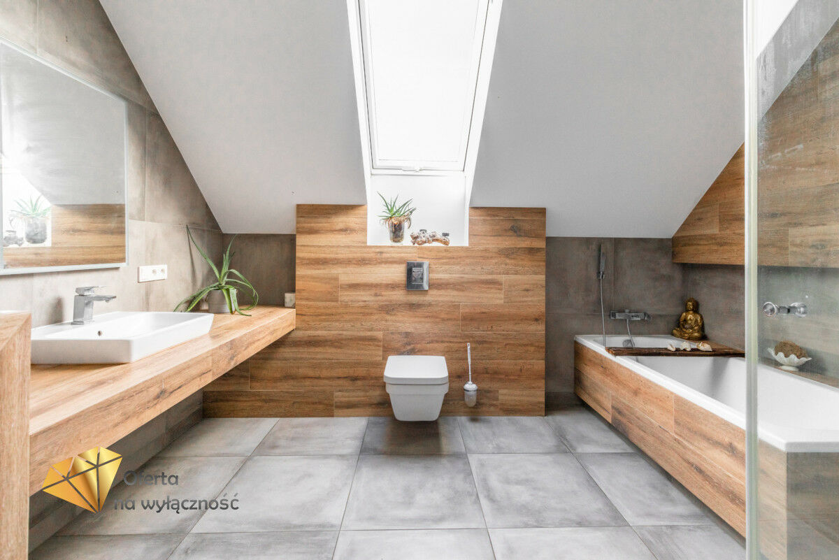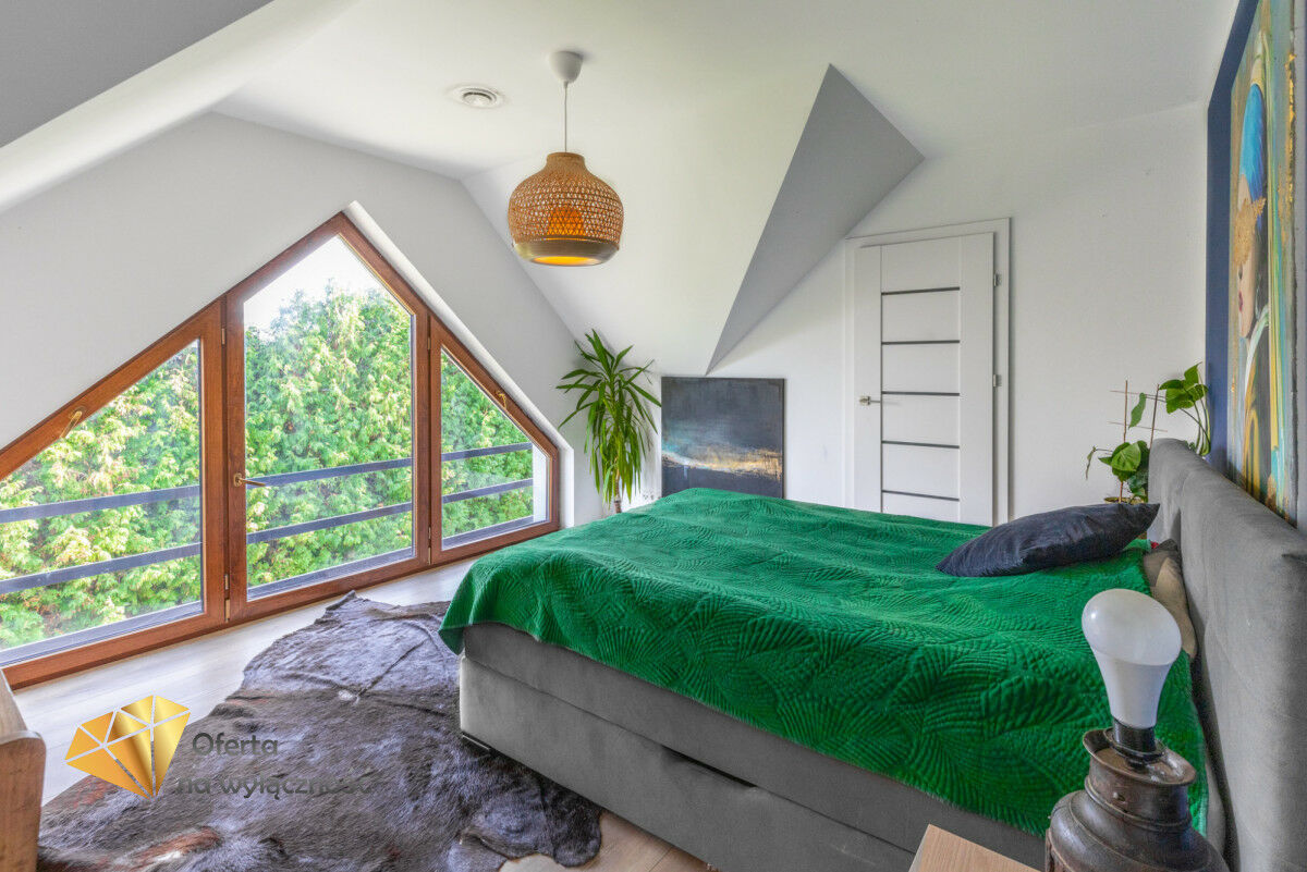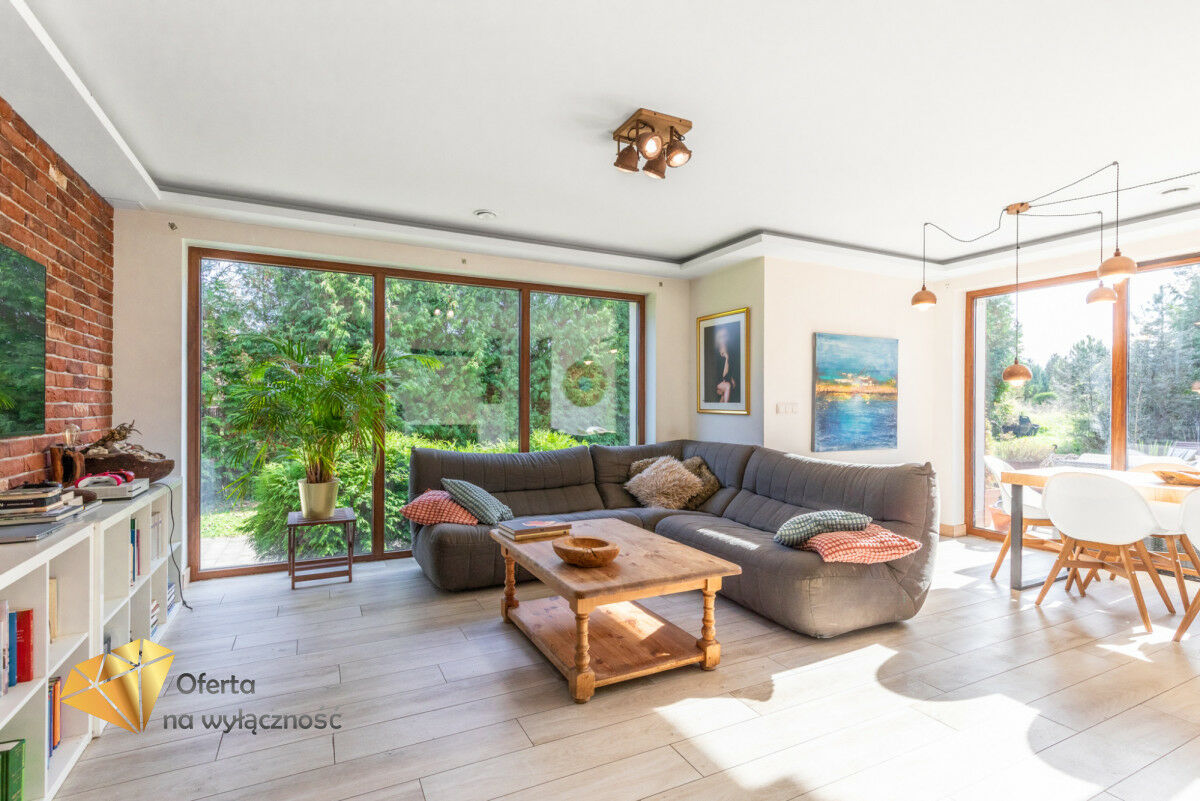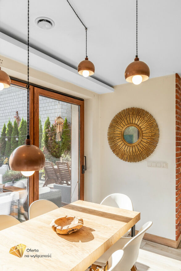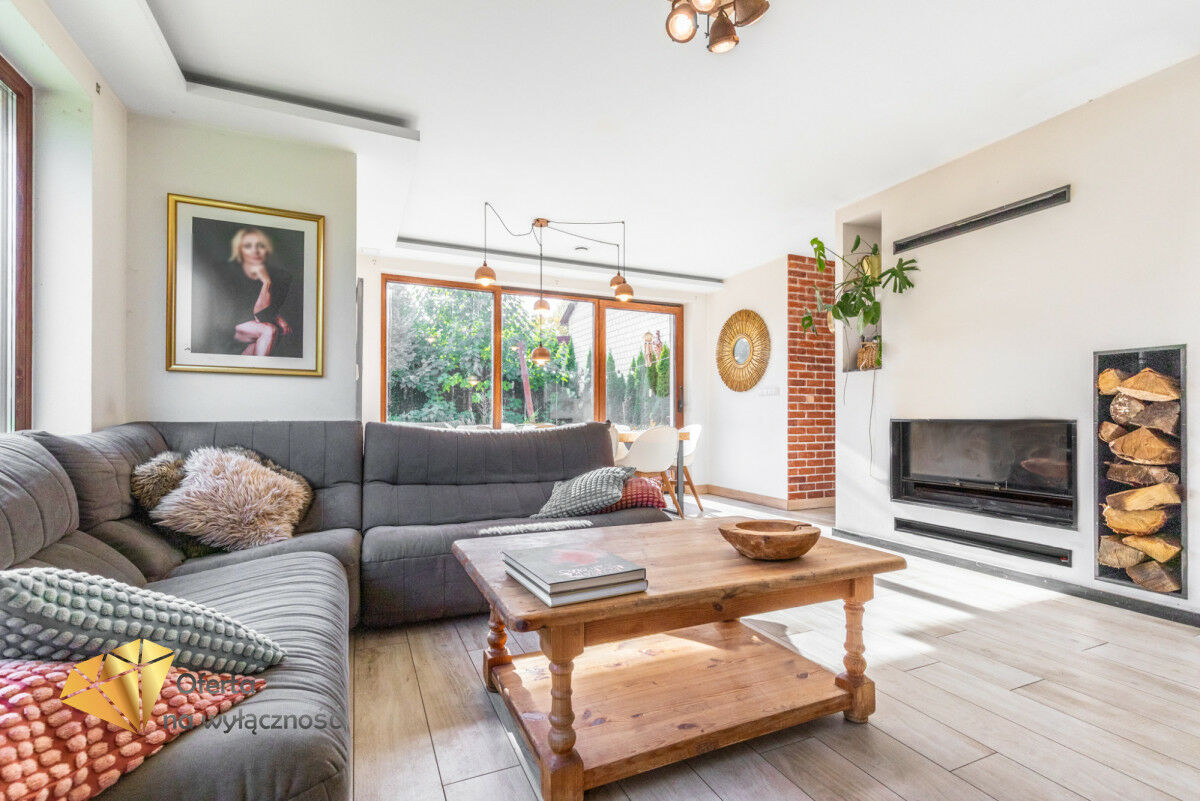 Sercem domu jest salon z tradycyjnym kominkiem i dużymi oknami, z którego roztacza się widok na ogród i zaprasza na taras, by tam delektować się świeżym powietrzem, śpiewem ptaków, słońcem. W części dziennej znajduje się również jadalnia i półotwarta, nowoczesna kuchnia. Na parterze znajdziemy też gabinet, łazienkę z prysznicem, kotłownię i wejście do garażu. Dodatkowym atutem nieruchomości jest pomieszczenie z oddzielnym wejściem, które może być przeznaczone jako pokój dla gości lub pod prowadzenie działalności gospodarczej.