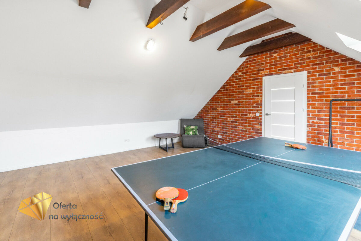 Przestronna klatka schodowa zaprasza do części prywatnej domu, gdzie znajdziemy cztery pokoje, łazienkę z wanną i prysznicem oraz dużą salę rekreacyjną (sala zabaw, kinowa, siłownia).