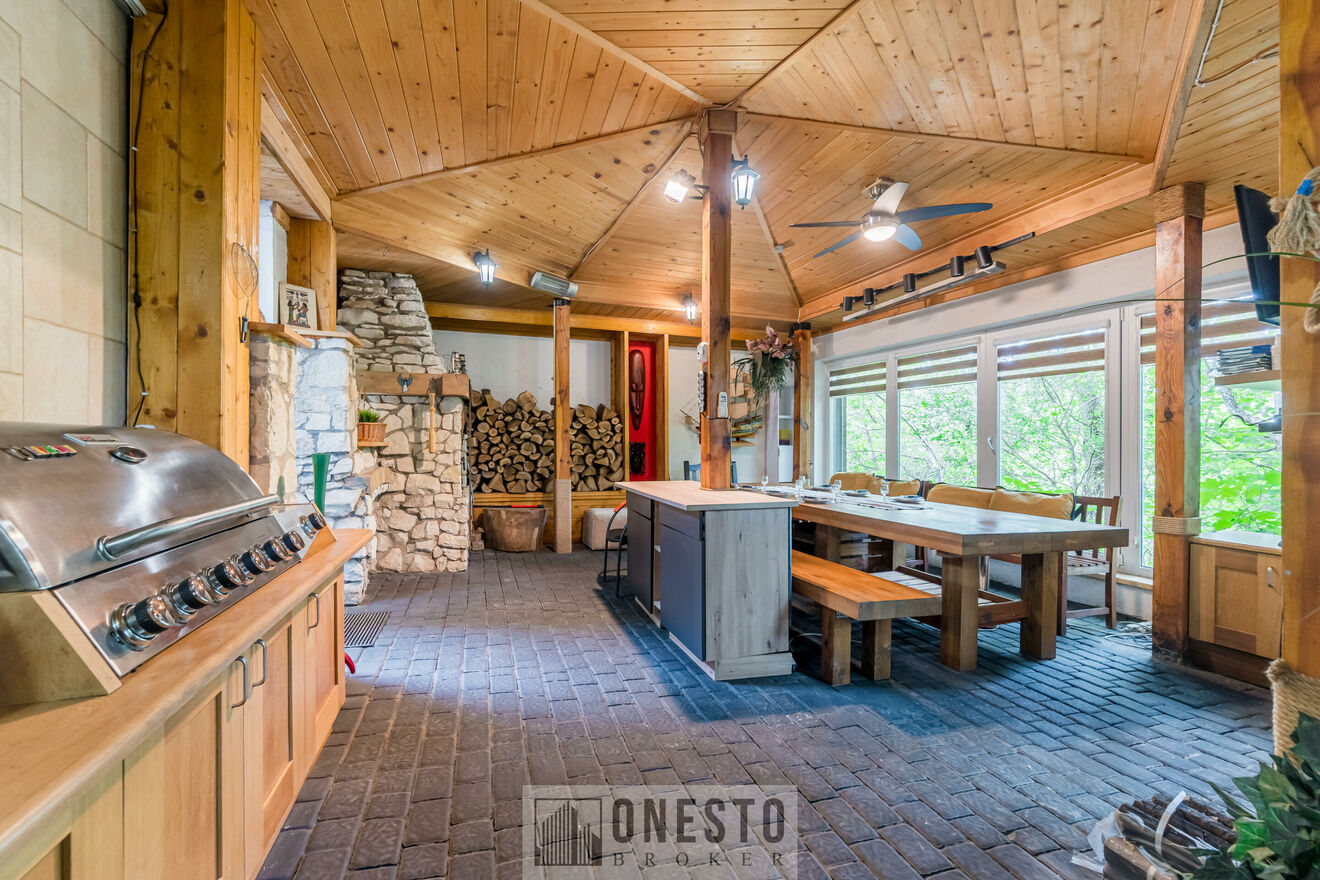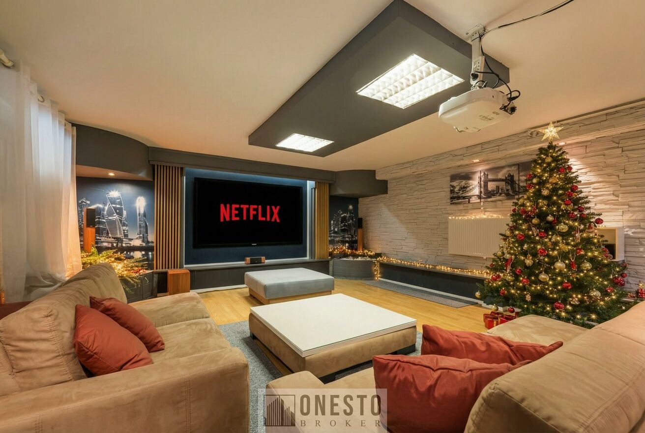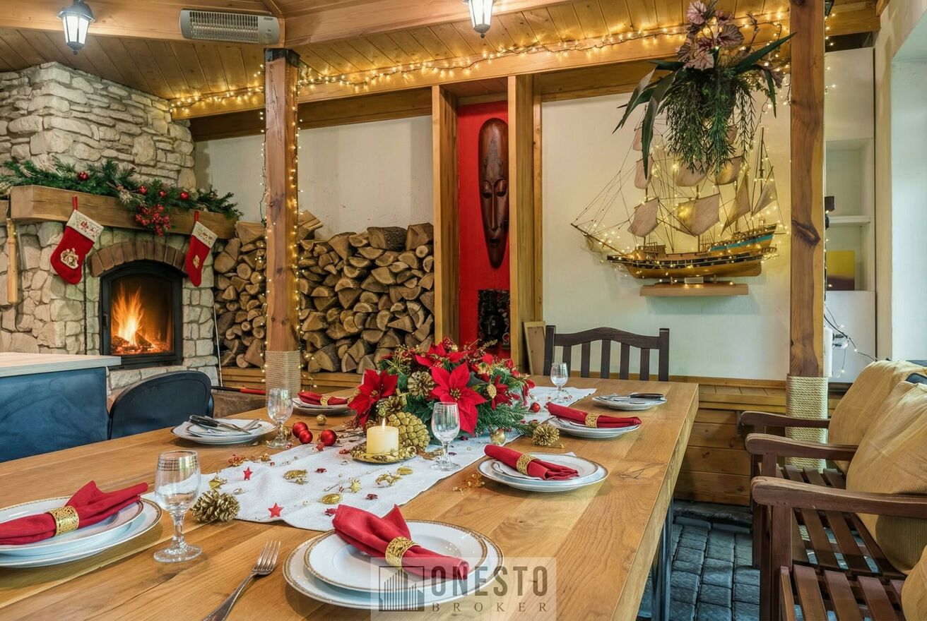 Przestronny salon z wyodrębnionym aneksem kuchennym i jadalnią tworzy otwartą strefę życia rodzinnego. Z salonu mamy wyjście na duży taras z pergolą, który w ciepłe dni staje się naturalnym przedłużeniem wnętrza. Na tym poziomie znajduje się także wc dla gości oraz wiatrołap. Na wyższej kondygnacji mieszczą się wszystkie sypialnie oraz łazienka z wanną. Absolutnie wyjątkową przestrzenią jest kondygnacja znajdująca się na półpiętrze poniżej salonu - tu znajduje się gabinet z odrębnym wejściem do budynku, łazienka z prysznicem, sala kominkowa oraz sala kinowa połączona z barem. Dodatkowo - kotłownia i pomieszczenia gospodarcze. Wiata garażowa przed budynkiem na 3 auta.