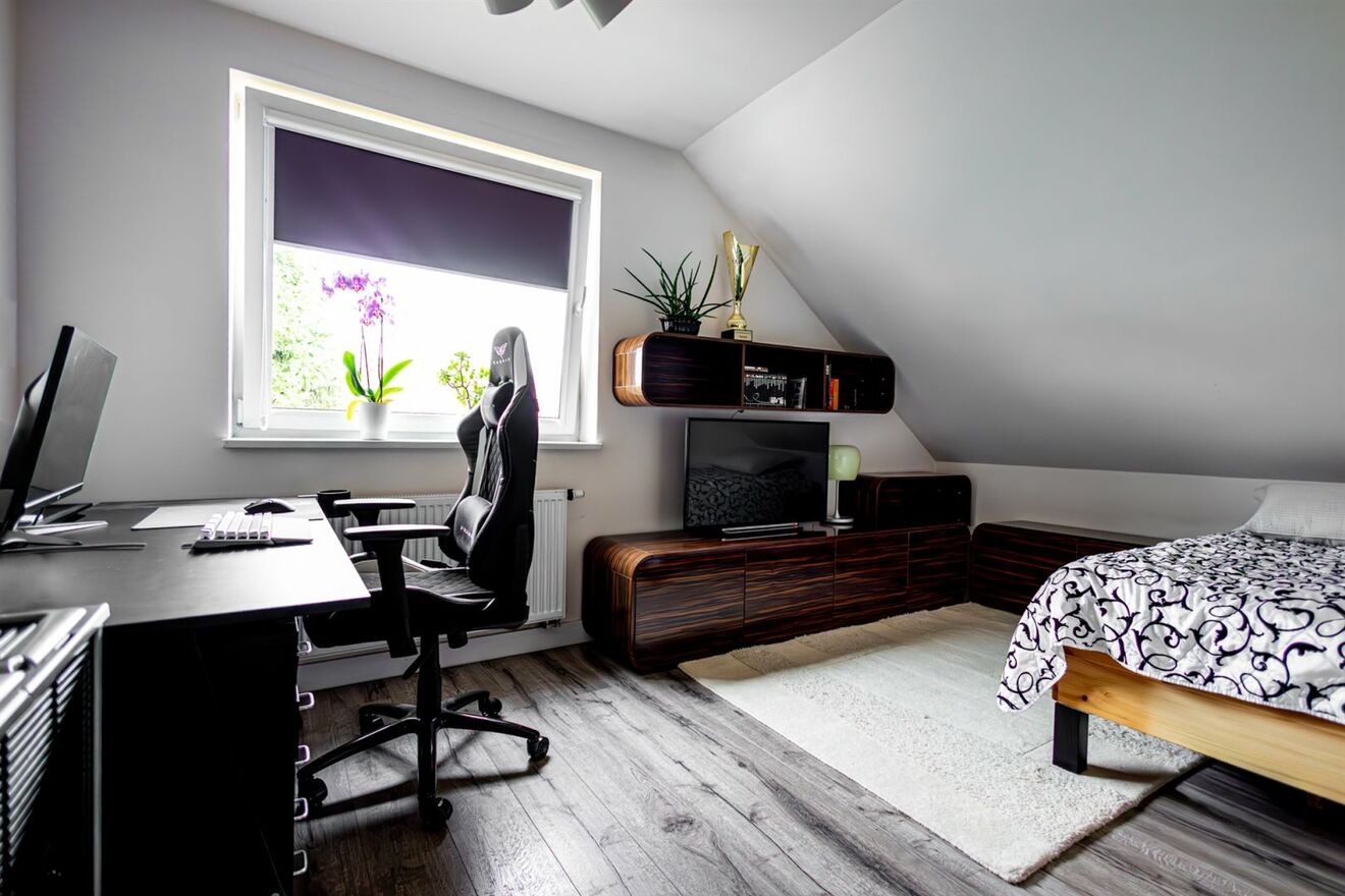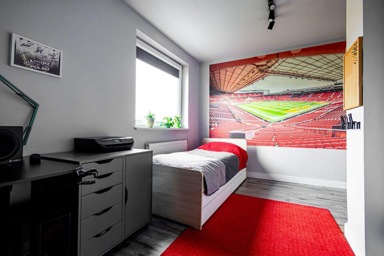Na piętrze znajduje się strefa wypoczynkowa z trzema sypialniami i dużą łazienką.