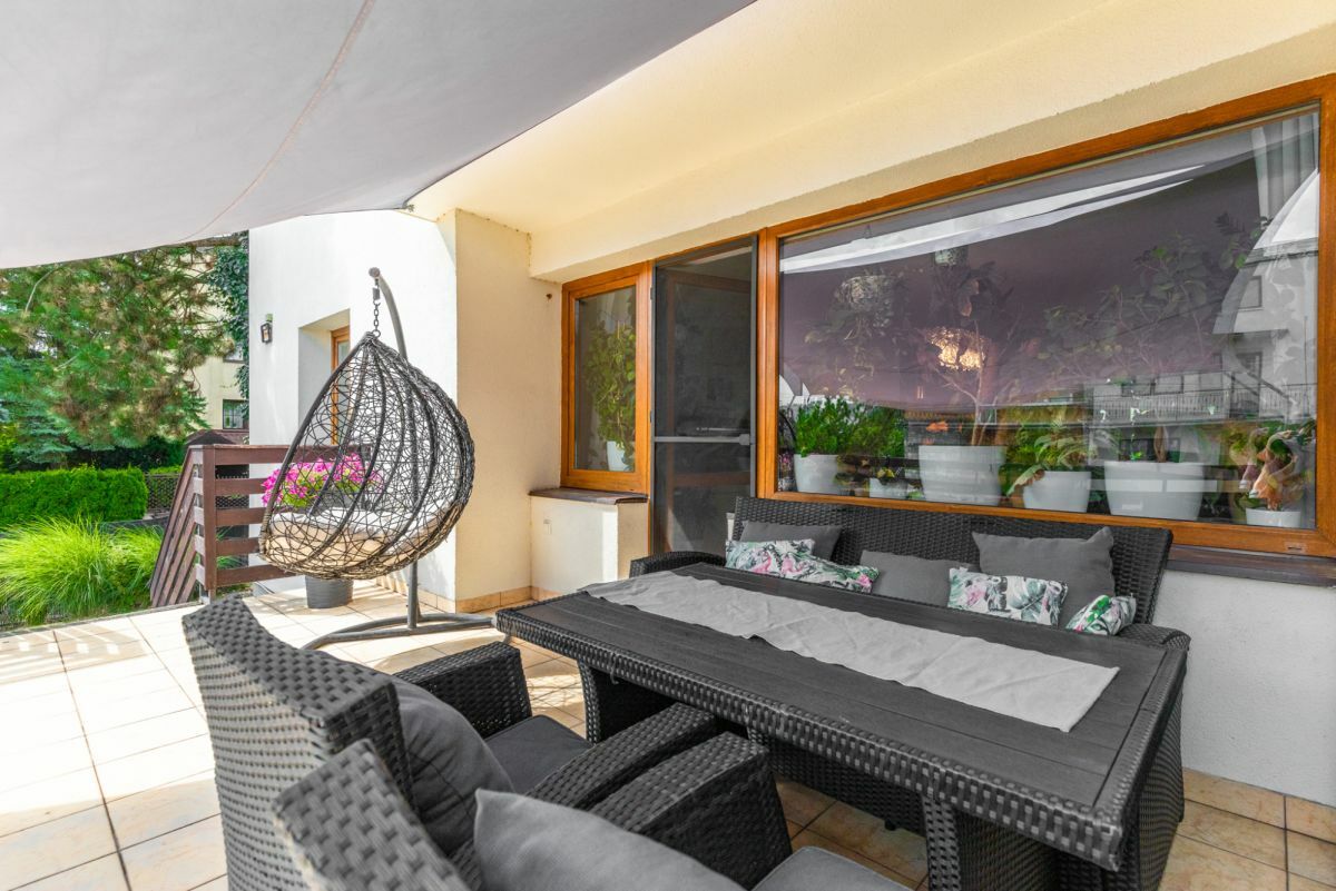 Do relaksu zachęca przestronny taras, który stanowi doskonałe miejsce do spędzania czasu na świeżym powietrzu. Na zewnątrz znajduje się także drewniana altana ogrodowa. Wszystkie ciągi piesze oraz opaska wokół domu zostały wykonane z kostki, co dodaje ogrodowi nie tylko elegancji, ale i trwałości.