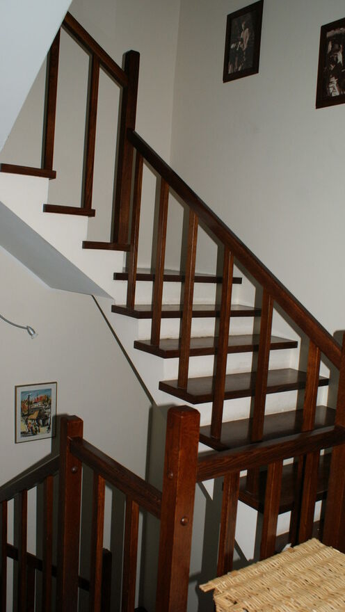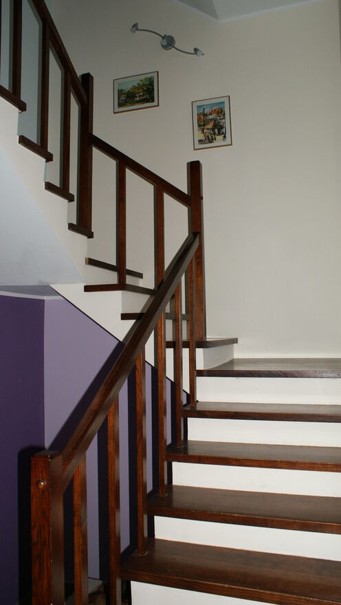 Kondygnacje domu połączone są pięknymi, drewnianymi schodami.