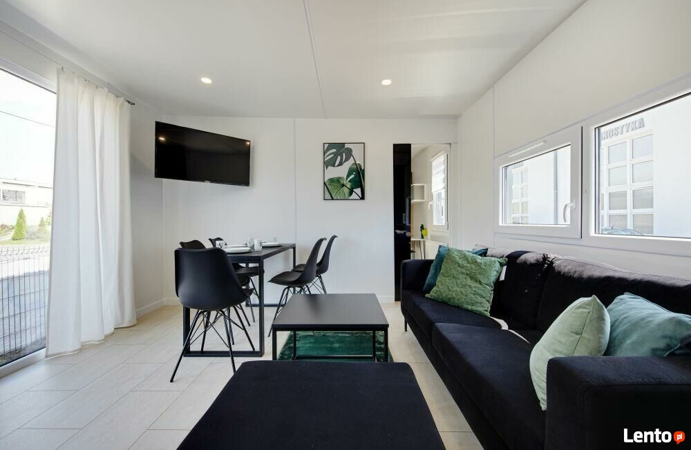 Domek ma 2 pokoje - sypialnię i pokój dla dzieci, łazienkę i salon z aneksem kuchennym. Kuchnia bardzo wysokiej jakości na osprzęcie BLUM wyposażona w zmywarkę, lodówkę, piekarnik, płytę elektryczną producentów renomowanych marek. W skład wyposażenia wchodzi również 42-calowy telewizor z funkcją smart i pralka.