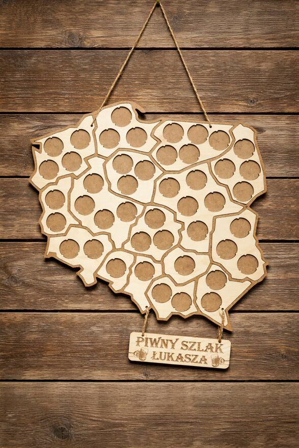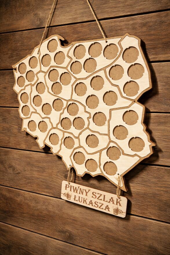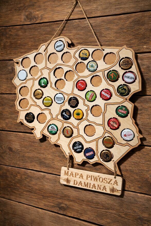 Piwna Mapa Polski w kształcie konturu kraju z podziałem na województwa – idealna dla każdego miłośnika piwa i kolekcjonera kapsli!Wykonana została ze sklejki brzozowej oraz HDF 3mm, dzięki czemu jest lekka, trwała i elegancko prezentuje się na ścianie.