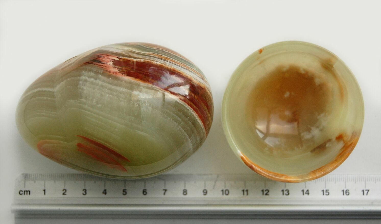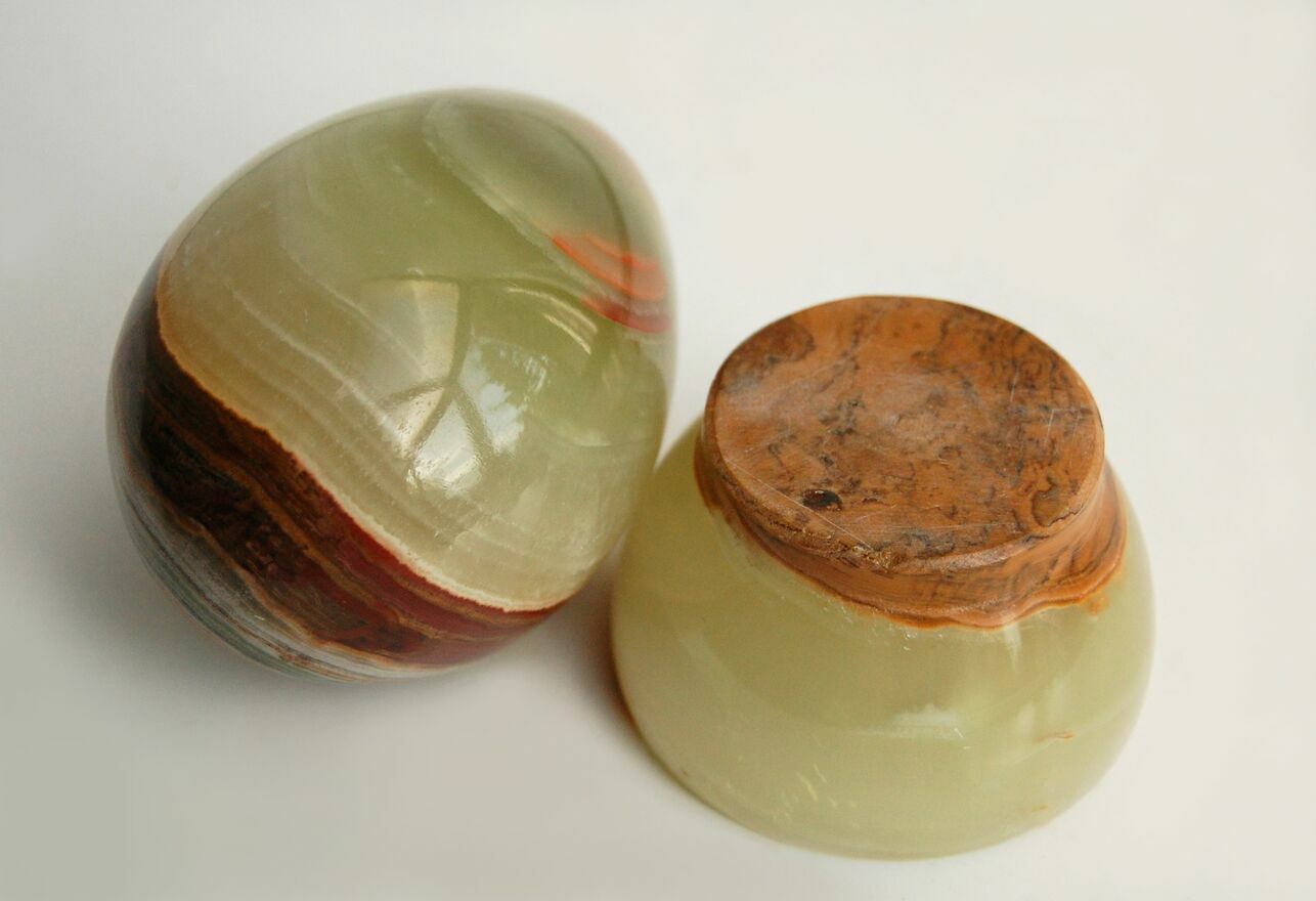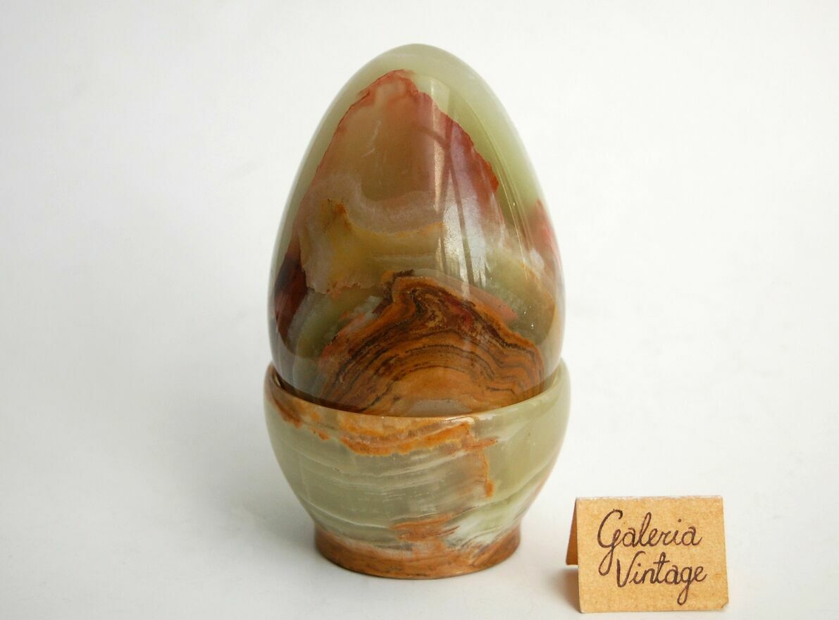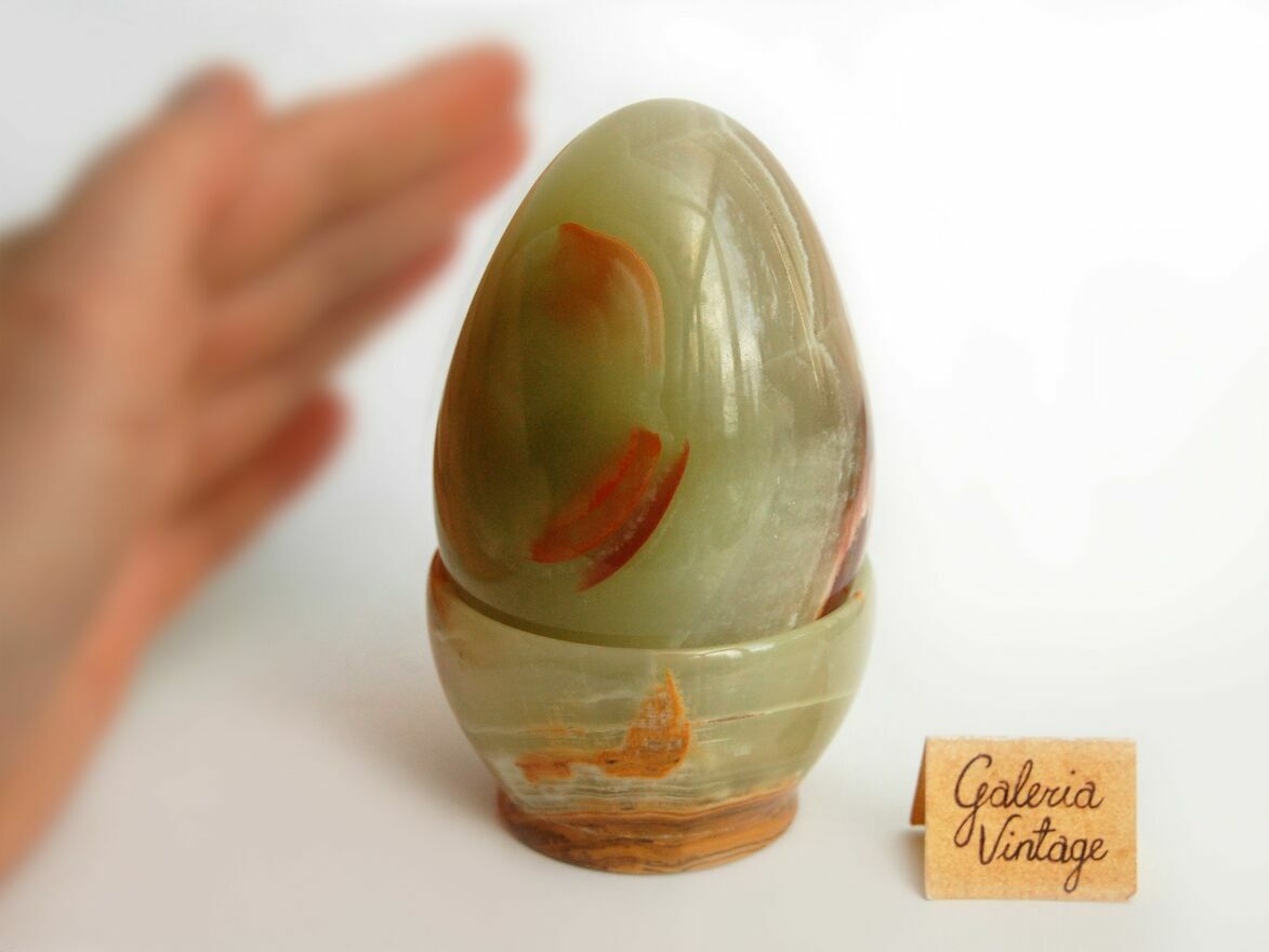 Duże jajko z podstawką wykonane z onyksu pakistańskiego. Kamień ma kolor jasnozielony, półprzezroczysty z pasmami w kolorach brązowym, bordowym, musztardowożółtym, beżowym. Jajko jest dość ciężkie, ładnie się prezentuje z każdej strony. Stan zachowania bardzo dobry, brak śladów użytkowania.CENA NIE PODLEGA NEGOCJACJI.