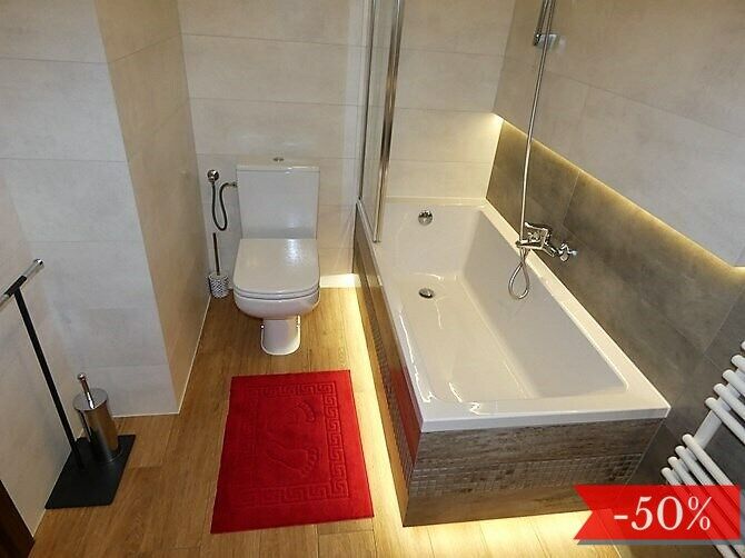 Łazienka z WC: wanna ze szklanym parawanem, umywalka z szafką,