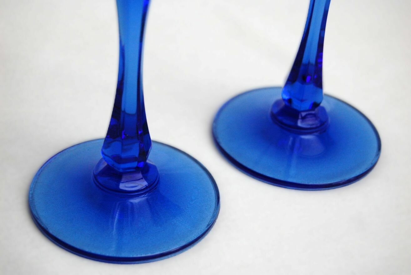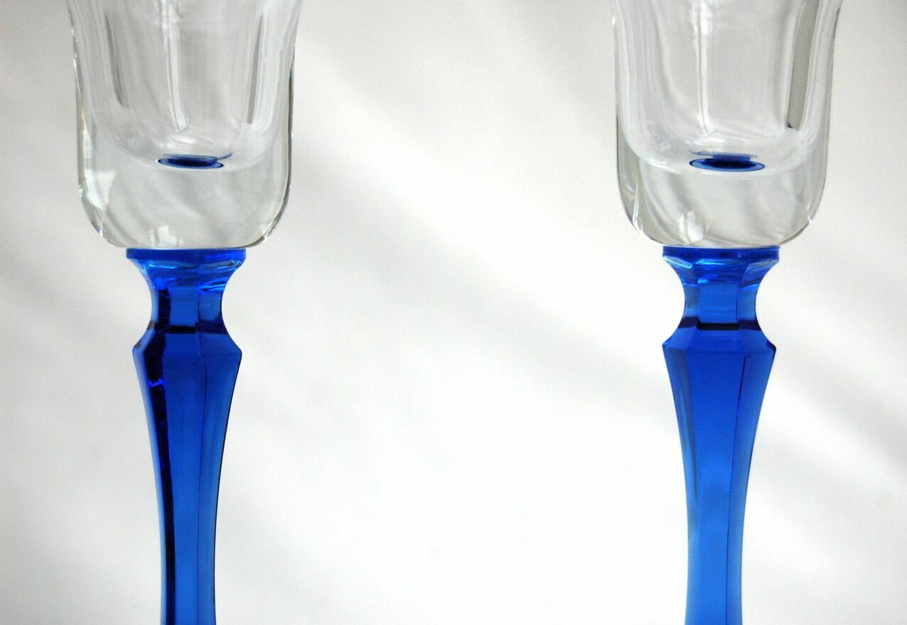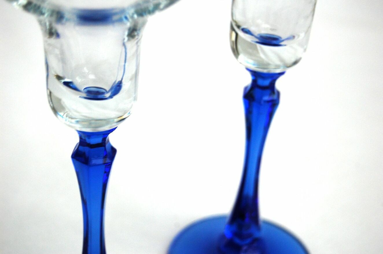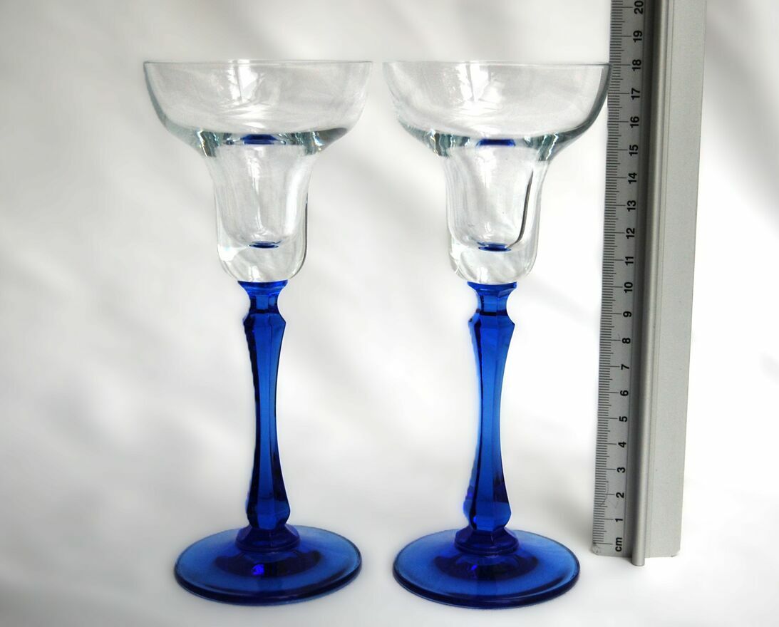 Para pięknych, wysokich, kryształowych świeczników w kształcie kielichów. Czasze są przezroczyste, trzonki z podstawami w kolorze chabrowego błękitu. Smukłe trzonki są pięknie szlifowane. Świeczniki elegancko się prezentują na uroczyście zastawionym stole. Stan zachowania bardzo dobry, brak zarysowań i uszkodzeń - jak nowe.Wymiary (wysokość x średnica czasz): 18,5 x 7,8 cm.