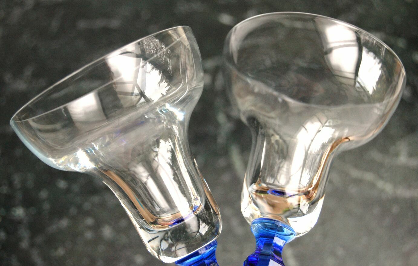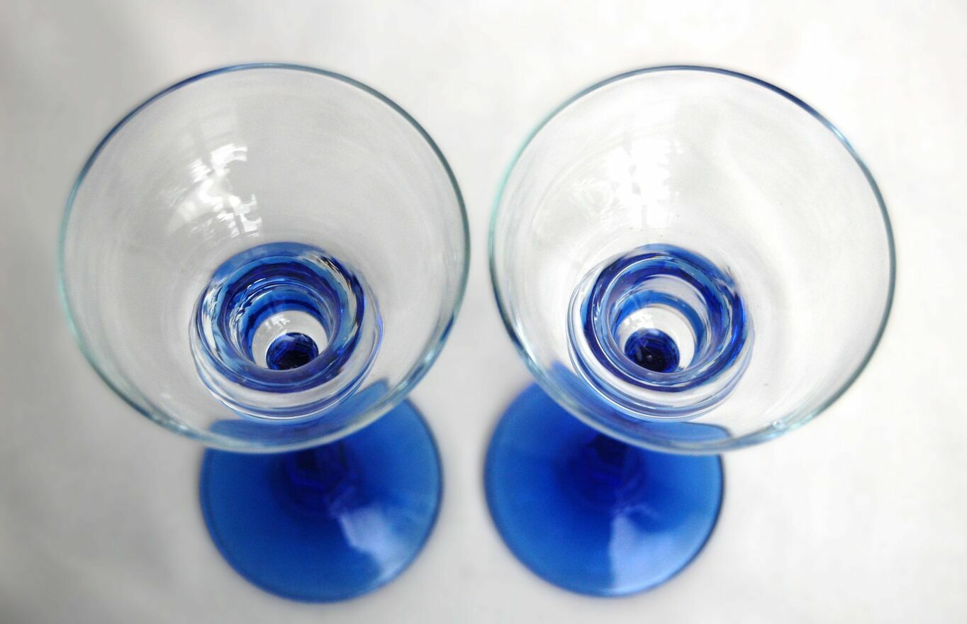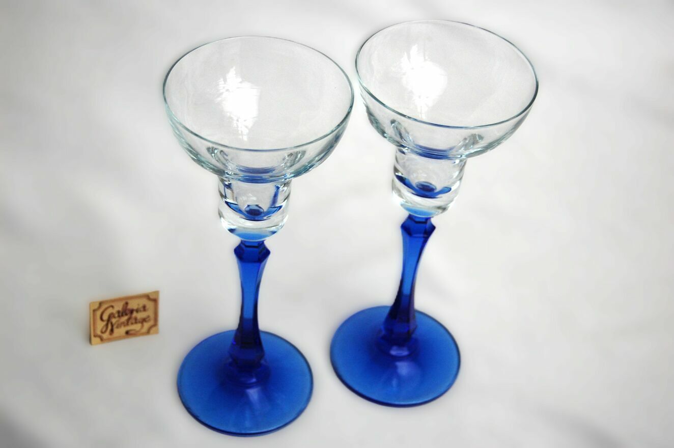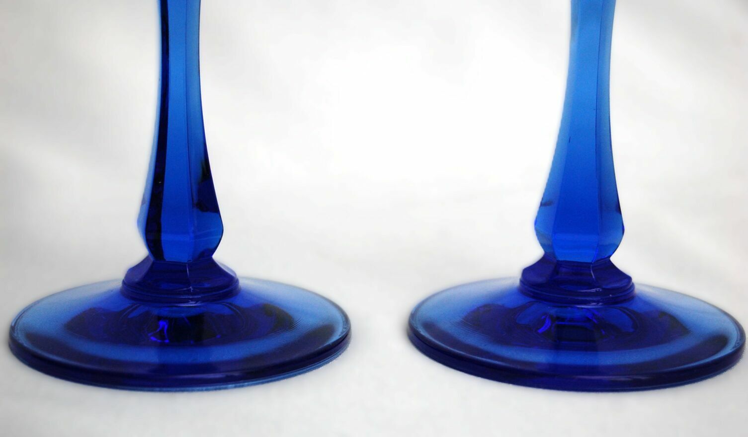Para pięknych, wysokich, kryształowych świeczników w kształcie kielichów. Czasze są przezroczyste, trzonki z podstawami w kolorze chabrowego błękitu. Smukłe trzonki są pięknie szlifowane. Świeczniki elegancko się prezentują na uroczyście zastawionym stole. Stan zachowania bardzo dobry, brak zarysowań i uszkodzeń - jak nowe.Wymiary (wysokość x średnica czasz): 18,5 x 7,8 cm.