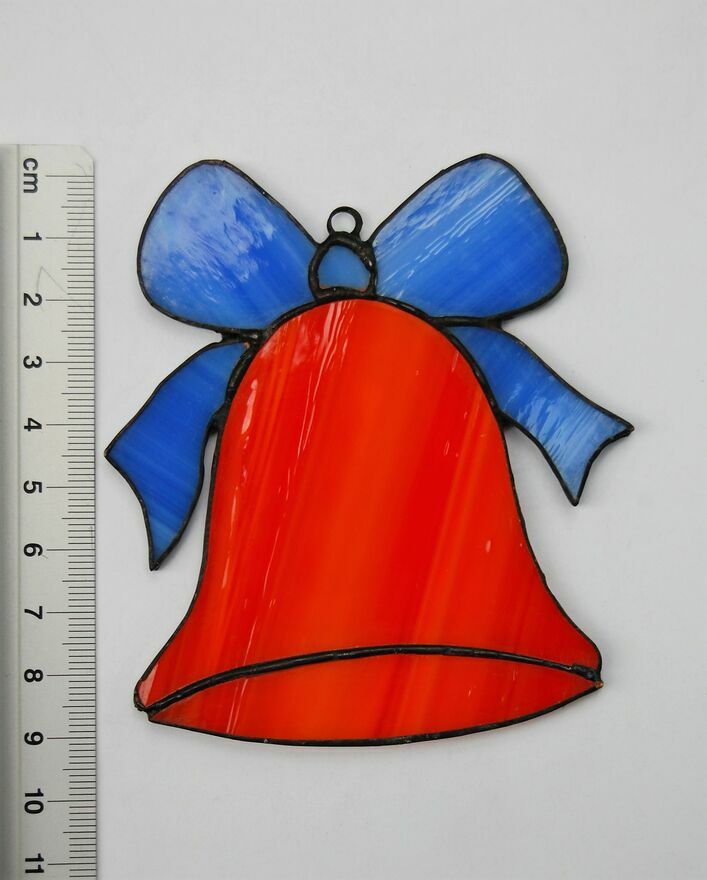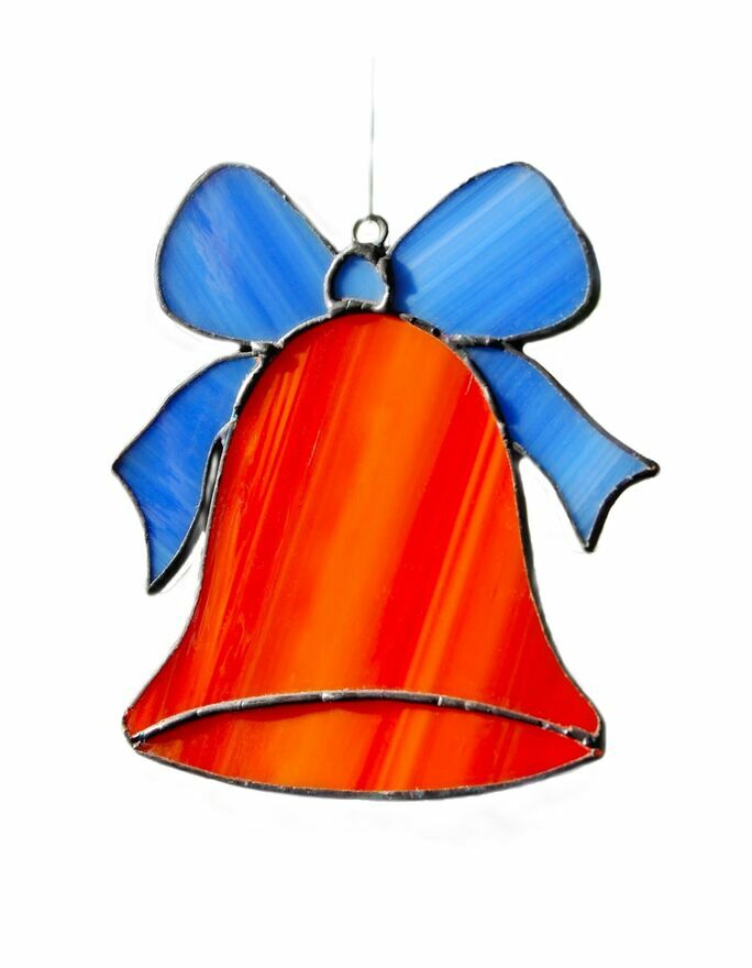 Świąteczny dzwonek z kokardą - witraż w technice Tiffany'ego. Witraż jest wykonany z półprzezroczystego szkła witrażowego w kolorach pomarańczowym z pomarańczowo-żółtymi pasmami i błękitnym z jaśniejszymi pasmami. Łączenia są czarne. Do witrażu jest dołączona żyłka.Wymiary (wysokość x szerokość x głębokość): 9,5 x 8,4 x 0,5 (cm).