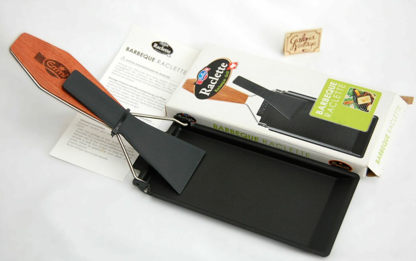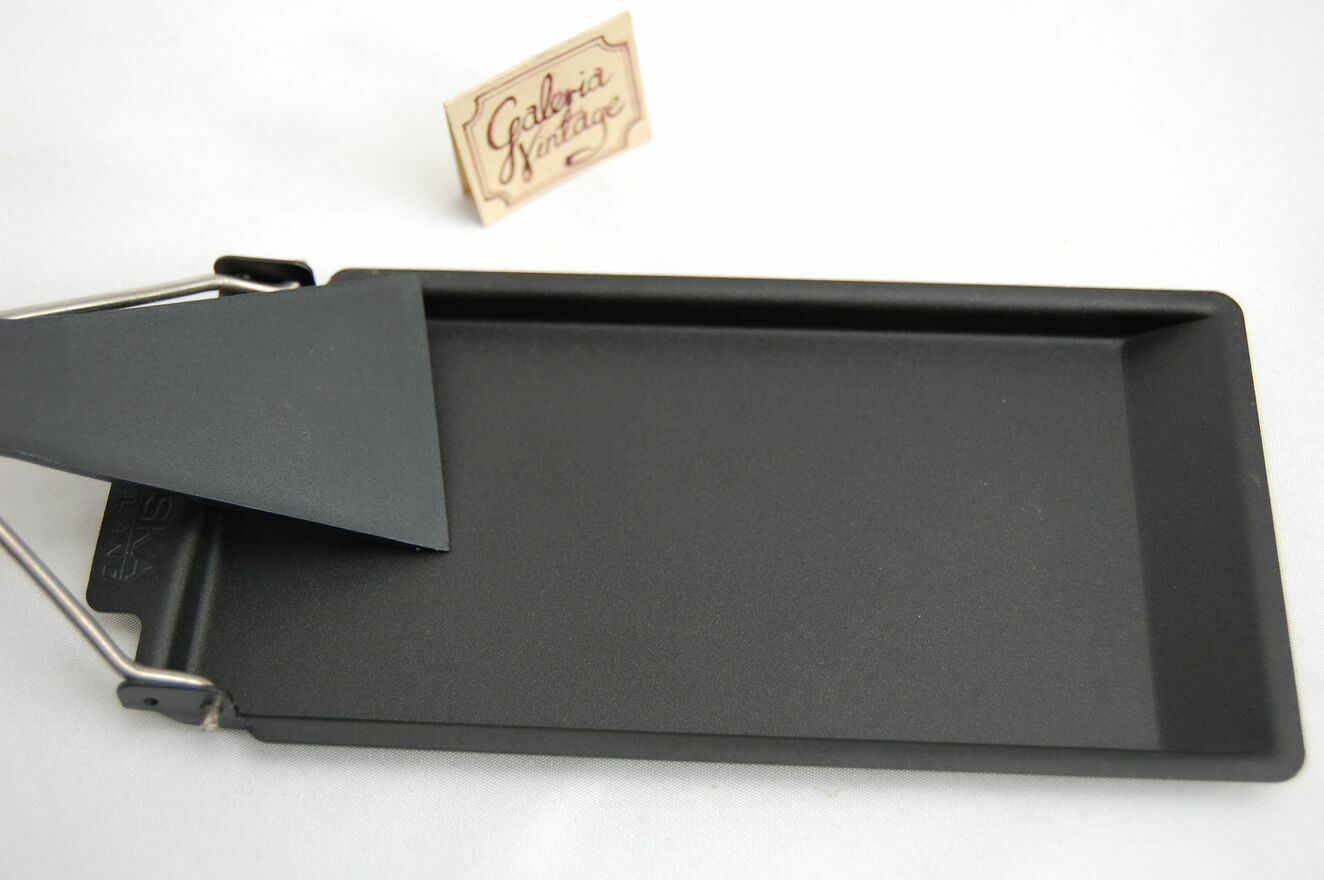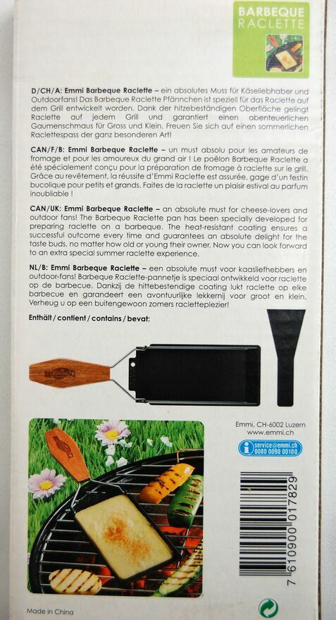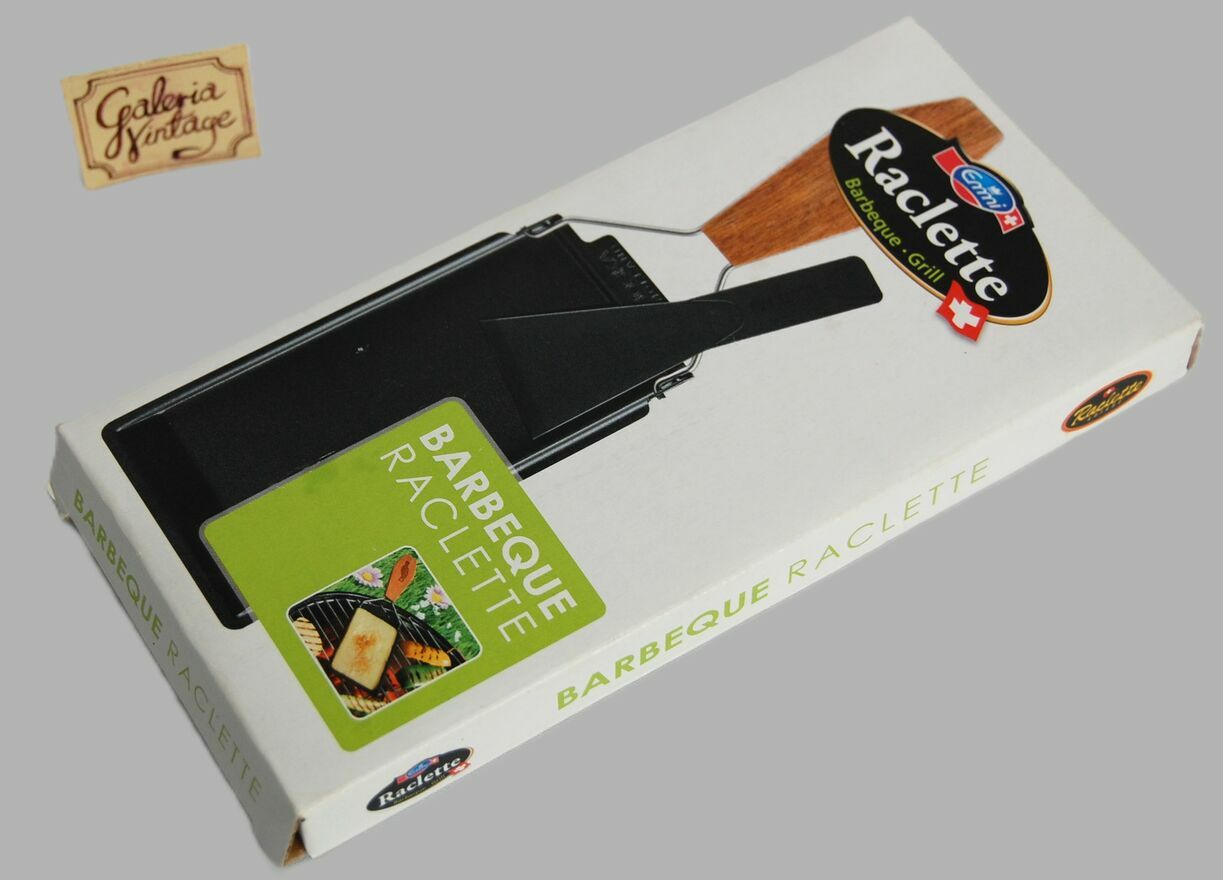 Zakupiony w Szwajcarii zestaw do przyrządzania raclette na grillu, firma Emmi, Szwajcaria. Zestaw składa się z metalowej foremki pokrytej powłoką nieprzywierającą z drewnianym uchwytem na stalowym stelażu oraz ze szpatułki z czarnego tworzywa. Zestaw jest nowy. Polecam na prezent.Wymiary foremki: 18,5 x 8,5 cm.