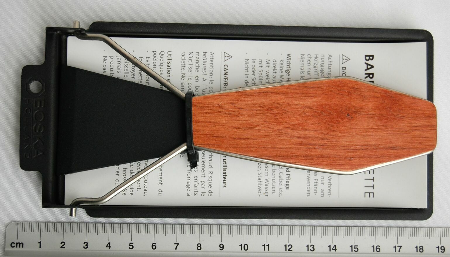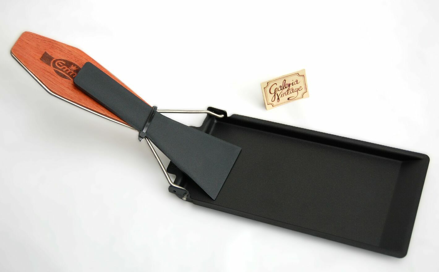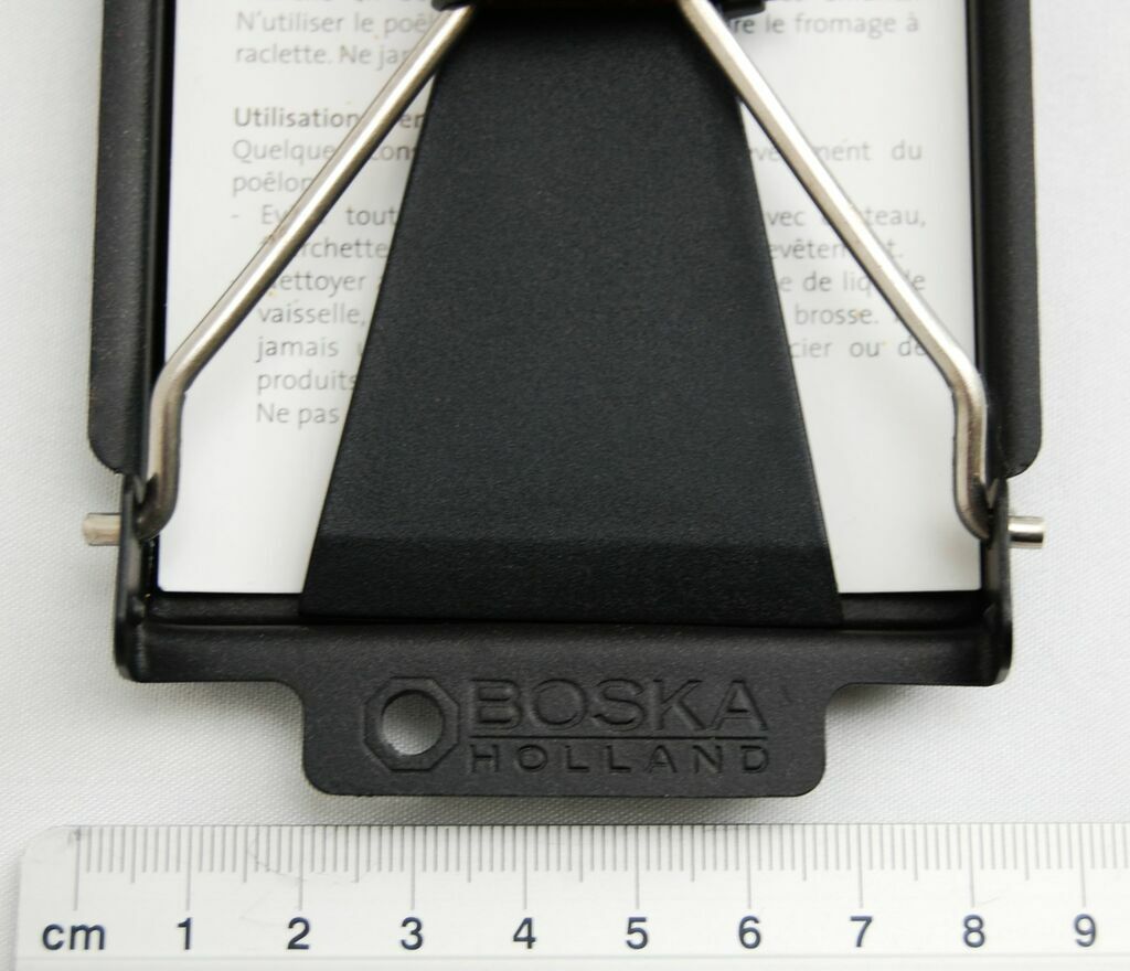 Zakupiony w Szwajcarii zestaw do przyrządzania raclette na grillu, firma Emmi, Szwajcaria. Zestaw składa się z metalowej foremki pokrytej powłoką nieprzywierającą z drewnianym uchwytem na stalowym stelażu oraz ze szpatułki z czarnego tworzywa. Zestaw jest nowy. Polecam na prezent.Wymiary foremki: 18,5 x 8,5 cm.