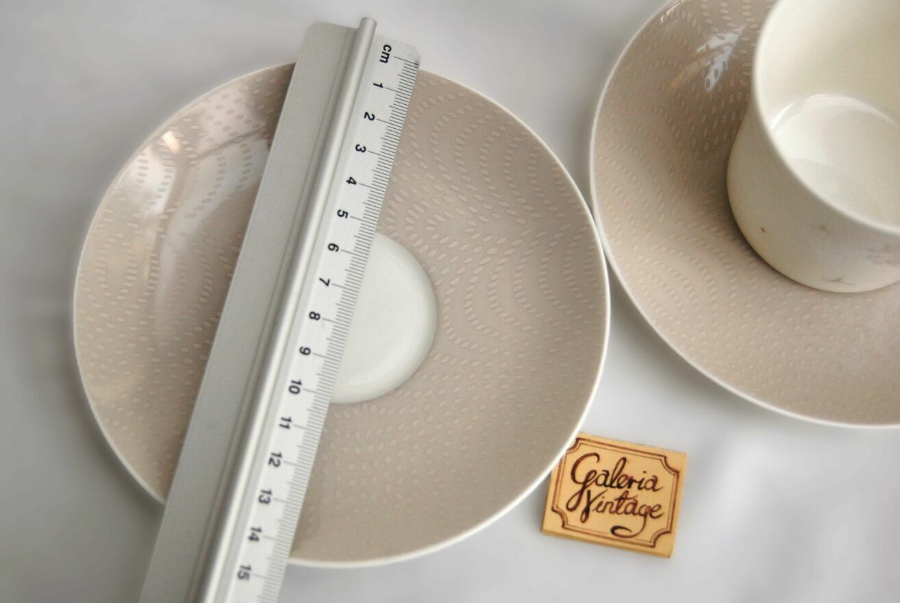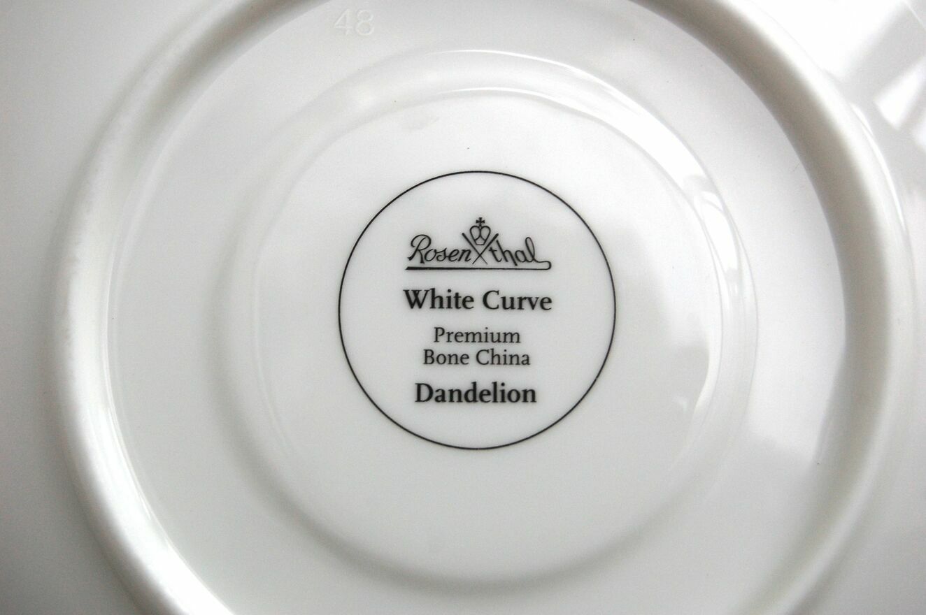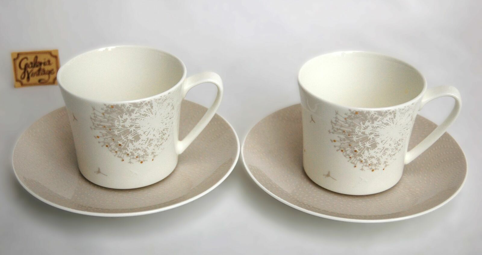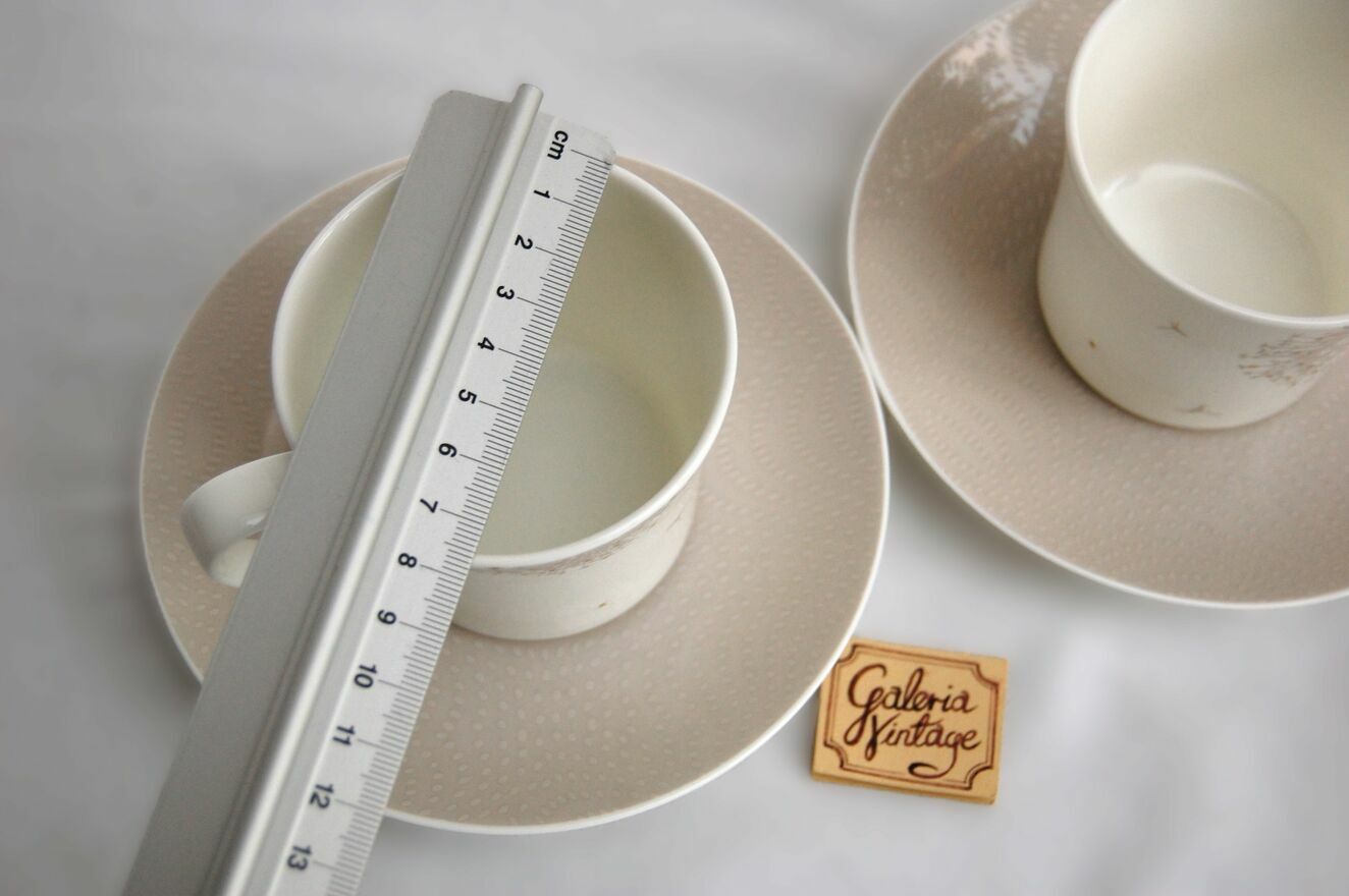 Para pięknych filiżanek do kawy, espresso z motywem dmuchawców. Marka Rosenthal, White Curve, Premium Bone China, Dandelion. Biała porcelana najwyższej jakości jest ozdobiona subtelnym motywem dmuchawców w kolorach białym, beżowym ze złoceniami. talerzyki są białe z szerokim pasem przy brzegu w kolorze ciepłego beżu i motywem nasion dmuchawca w jaśniejszym tonie beżu. Komplet zawiera parę filiżanek wraz z parą talerzyków. Każdy element jest sygnowany, numerowany, opakowany w ochronną folię, w tekturowym opakowaniu firmowym. Stan: nowe, na rynku polskim ten model już nie występuje. Polecam kolekcjonerom i miłośnikom porcelany Rosenthal.Cena dotyczy kompletu.