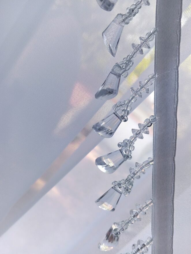 Elegancka klasyczna firana z gotowym tunelem do wsunięcia na karnisz uszyta z gładkiego, białego woalu dającego efekt mlecznej poświaty, pionowa taśma pozwala na wybór stopnia marszczenia. Firana obszyta lekko połyskliwą lamówką, część środkowa zakończona kryształkami typu kopytko.Wymiary: