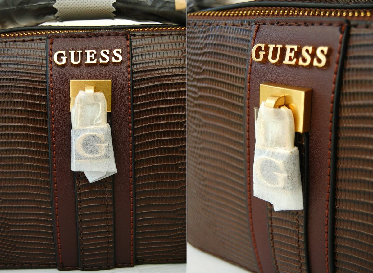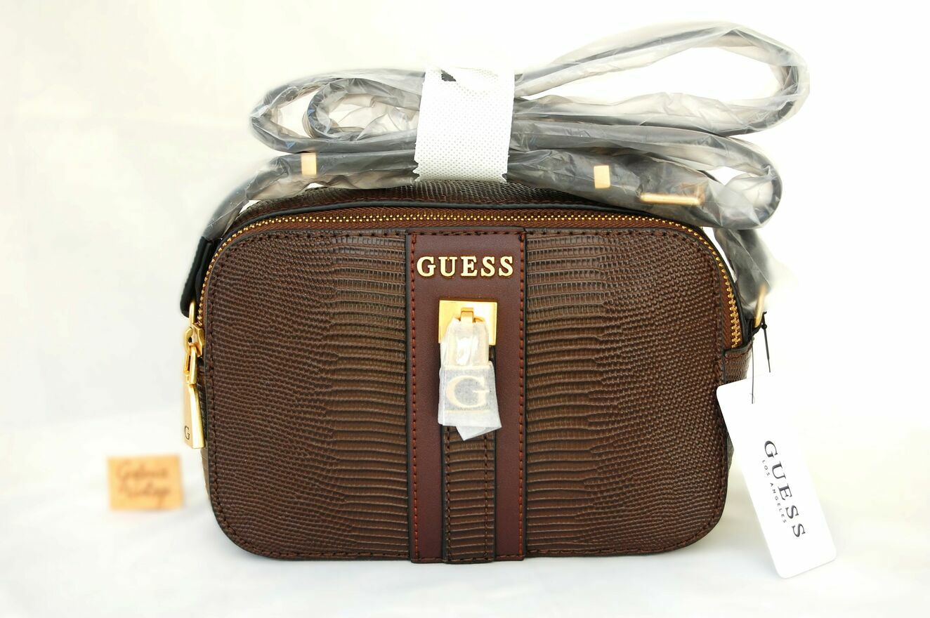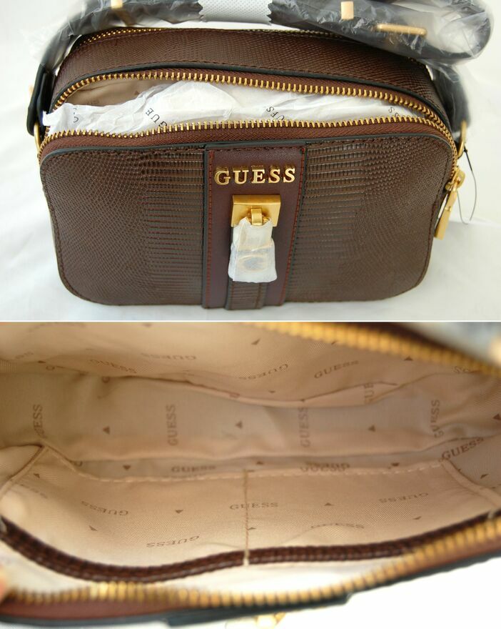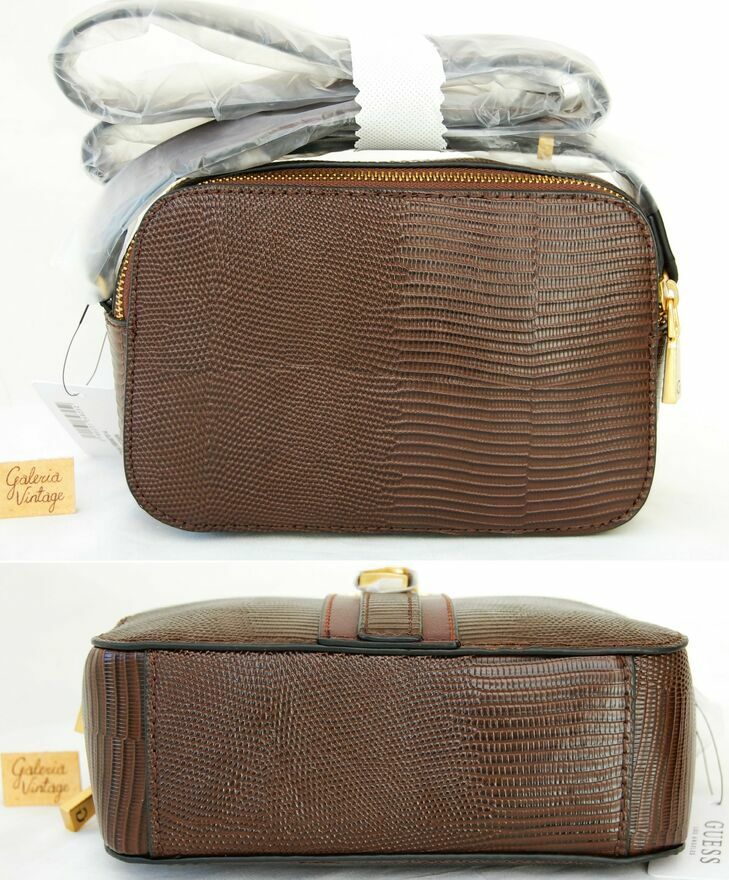 Damska torebka na ramię - rzadko spotykany, elegancki model Ginevra camera bag, marka Guess, Los Angeles. Kolor czekoladowobrązowy ze złotymi okuciami. Materiał: skóra ekologiczna o fakturze skóry węża z półmatowym połyskiem. Front jest ozdobiony pionowym panelem z metalowym logo "Guess" i metalową kłódką ze złotą literą "G". Torebka ma dwie komory z kieszonkami. Długi pasek z regulacją umożliwia noszenie torebki na jednym ramieniu lub przewieszonej przez ciało. Torebka jest nowa, zafoliowana, z papierową metką.Wymiary samej torebki: