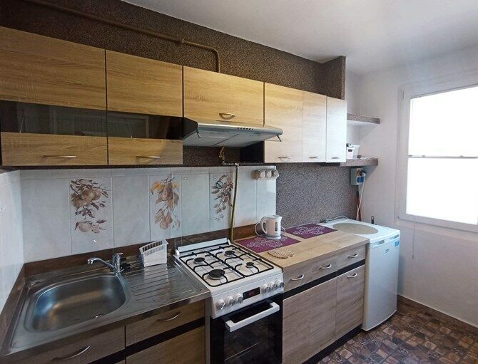 Kuchnia: kuchenka, piekarnik, lodówka, szafki dolne i górne, stół