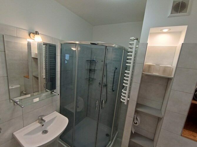 Łazienka: kabina prysznicowa, umywalka, pralka, szafki, WC.