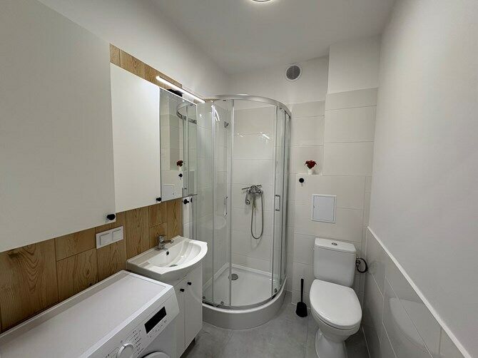 Łazienka: kabina prysznicowa, umywalka, szafki, pralka, WC.